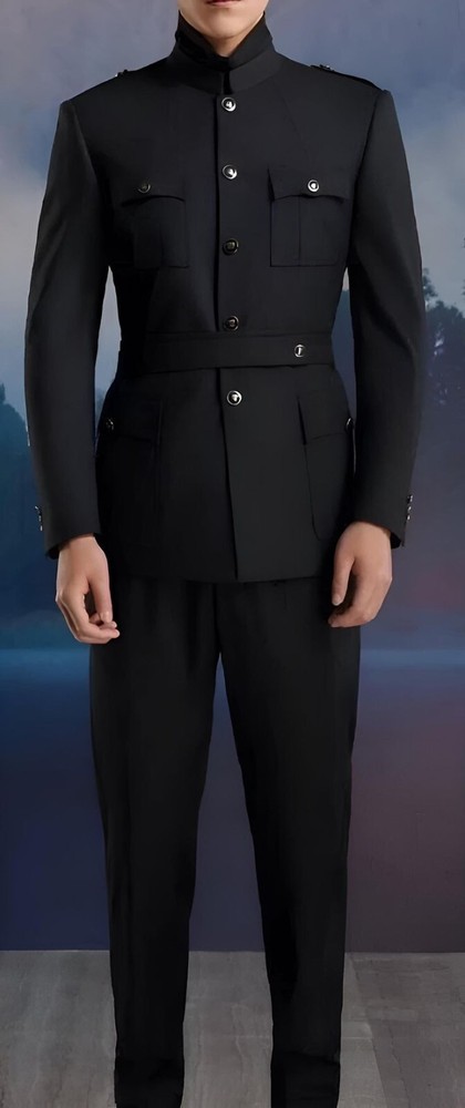 Black Mens Safari Jacket Business Casual Wedding Groom Blazer 2-Piece Set