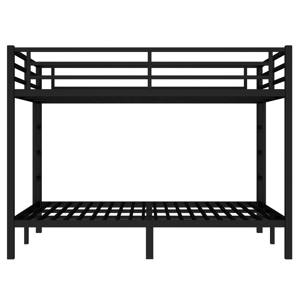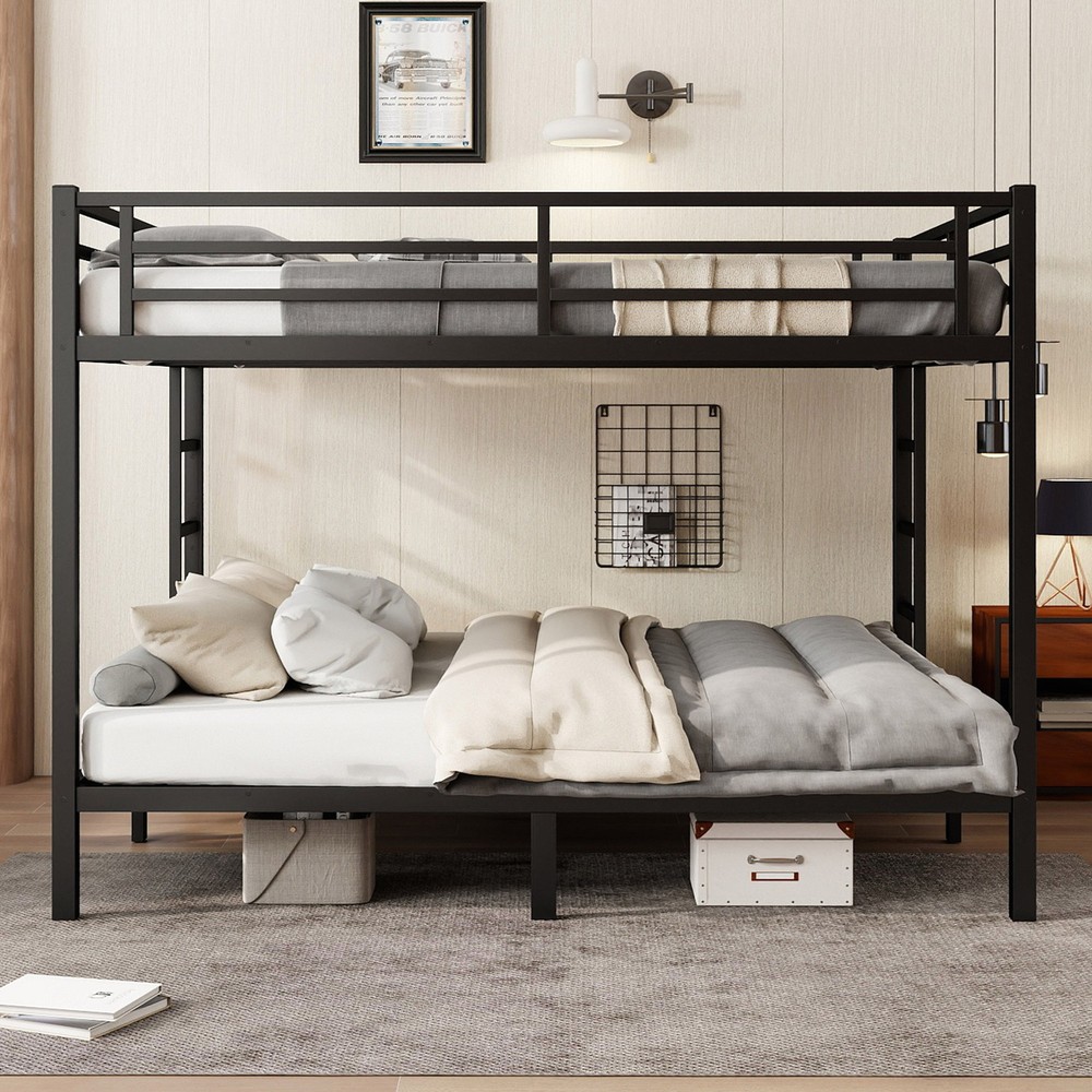 Metal California King Over California King Bunk Bed for Teens and Adults Black Features Solid construction: Made by strong and heavy duty metal provides durability and strong structure make the bunk bed more stable. The bunk bed adopts durable electrostatic powder coating, environmental protection, non-toxic and pollution-free, not easy to fade,the use cycle is long,and easy to clean. Under Bed Storage: Under bed storage can also help you utilize space more efficiently and make the whole room more tidy. 2 Side Ladder: Both sides of the bunk bed with ladder for easy climb up, also making it easy to customize to your room's layout and your personal preferences. Safety Design: Our bunk beds have 40 metal slats for great support. The lower bed has thickened legs for reinforcement. Guard rails around the upper bed increase safety and prevent accidents. Description Description Feature upper bed is Queen size and bottom bed is Queen size. The metal bunk bed constructed with a sturdy quality and thicker steel frame that for stability and durability, make the bunk bed not wobbling and allowing users to sleep soundly. Description & Dimensions Type Metal Bunk Bed Size California king over California king Overall Product Dimension 87.4''L*75.2''W*63.7''H Overall Product Weight 130.07LBS Weight Capacity Minimum weight capacity of 600 lbs. for bunk beds Recommended Mattress Thickness 6'' for upper bed, 8'' for bottom bed