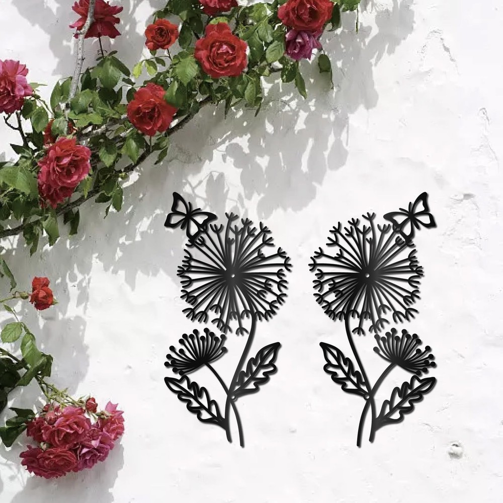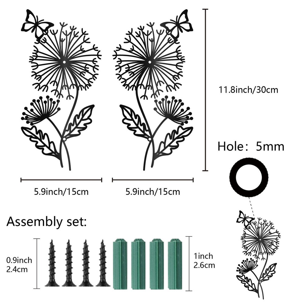 Black Metal Dandelion Wall Art Metal Plant Wall Decor Iron Hollow Butterfly Symmetry Silhouette Wall Artwork Sign Ornament Decoration for Living Room Office Garden Balcony 11.8 x 5.9 Inch Brand: Material: Iron Color: Black Size: 11.8 x 5.9 Inch/30 x 15cm, hole: 5mm, thickness:1mm Usage: Wall decoration Features : Dandelion metal decorations can add various accessories such as stickers, tassels, hooks, etc. Use your imagination to make unique decorations. Not only can you exercise your production ability, but you can also fully experience the fun of DIY during the production process Great Gift Idea: Metal butterfly wall decor is suitable for various occasions. You can give it to family, friends, neighbors, colleagues, etc. on holidays such as Christmas, Thanksgiving, Valentine's Day, birthdays, etc., so that they can better decorate their rooms Dandelion Wall Art: The black wall sculpture features a symmetrical dandelion pattern with butterflies on top. Pattern is exquisite, vivid, and has a unique charm, attracting attention Black Metal Sign: Come with 1 set dandelion metal wall art about 2pcs/set, 11.8 inch long, 5.9 inch wide (30 x 15cm), thickness: 0.1cm, hole: 0.5cm Good Material: The metal butterfly wall decor is made of high quality iron. Iron is sturdy and durable, not easily bent, with a smooth and burr free surface, suitable for long time decoration Easy to Install: Dandelion metal wall art installation is simple. Choose whether you want to decorate the wall, indoors or outdoors, and then use the accompanying screws to fix the metal decoration Multiple Uses: Metal butterfly wall decor is widely used and suitable for decorating bedrooms, living rooms, kitchens, balconies, corridors, street corners, restaurants, cafes, schools, offices, gardens, etc