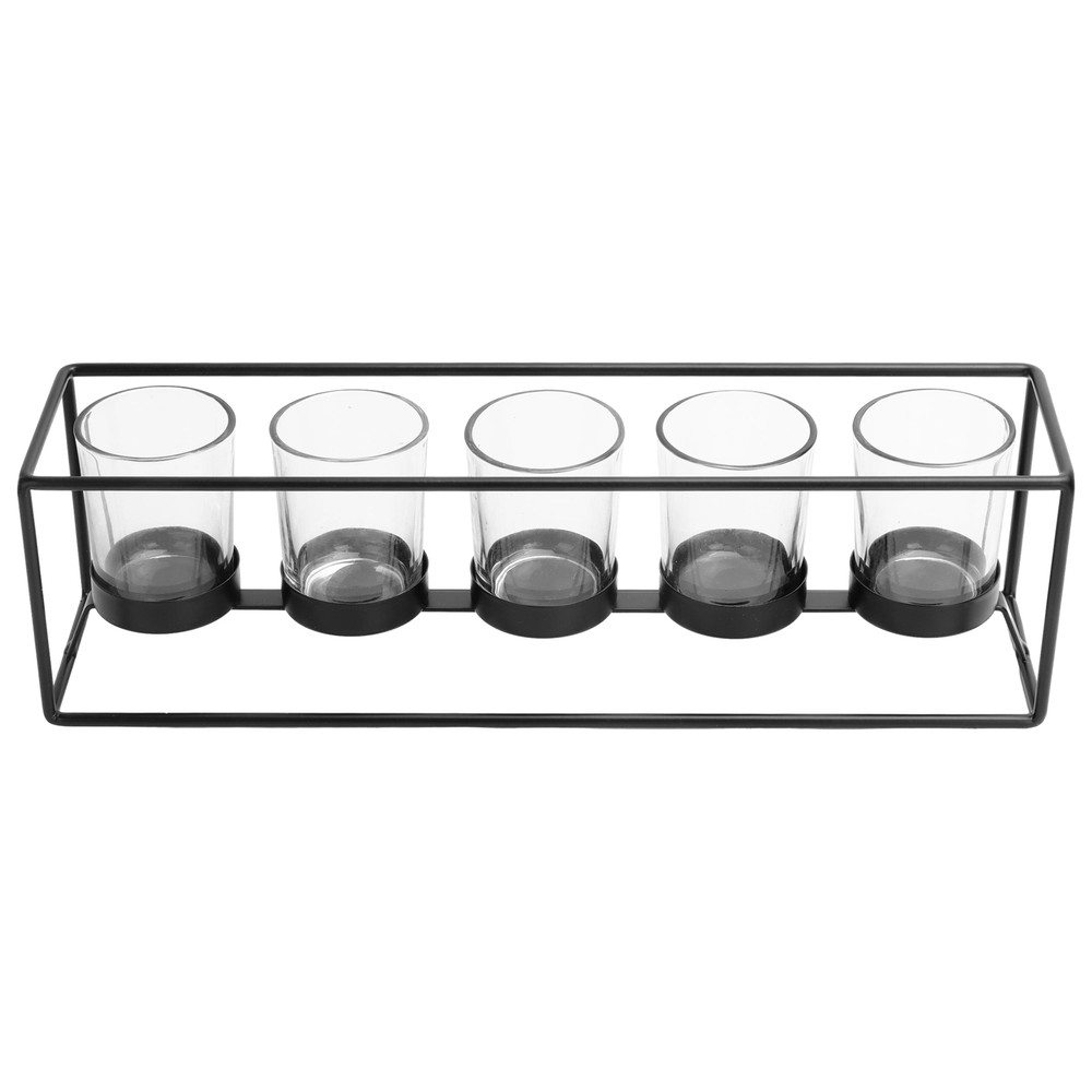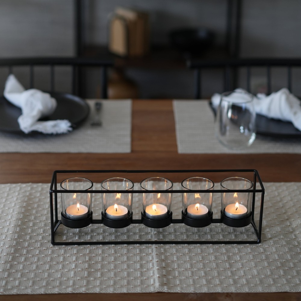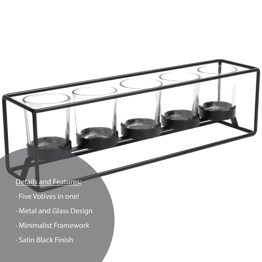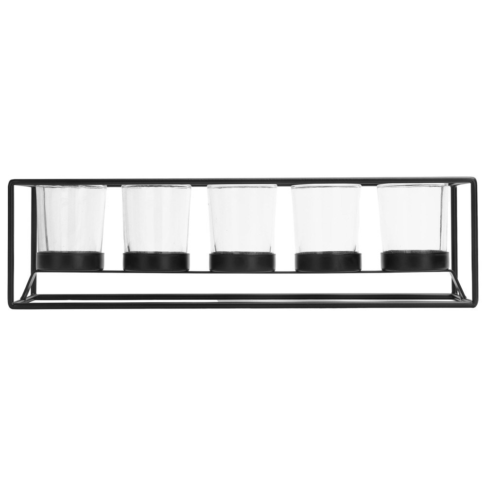 Material: Metal/Glass Care: Wipe clean with soft, dry cloth Country of Origin: Imported Dimensions: 13.86” W x 3.86” D x 3.86” H Holds: 5 tealight or votive candles (sold separately) Features: Black satin finish Recommended for: Indoor use Warning! Never burn a candle completely and dispose of it when it burns to within 1/2” of its base or the holder. Never leave a burning candle unattended.