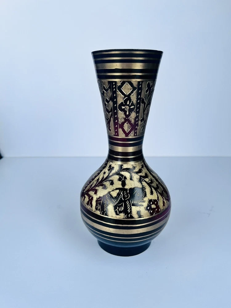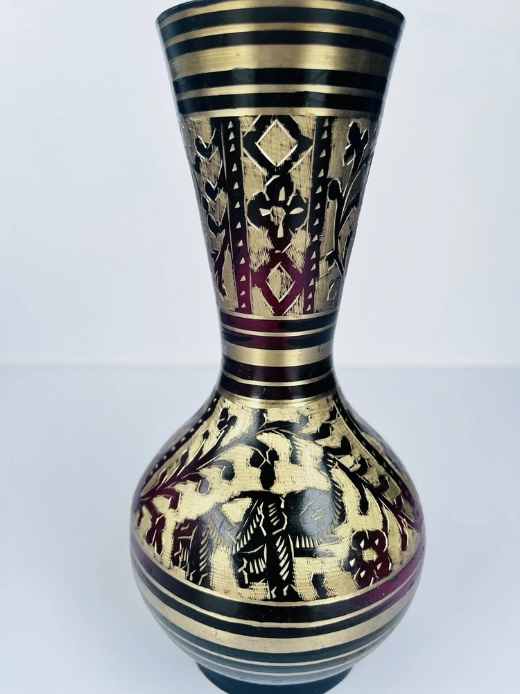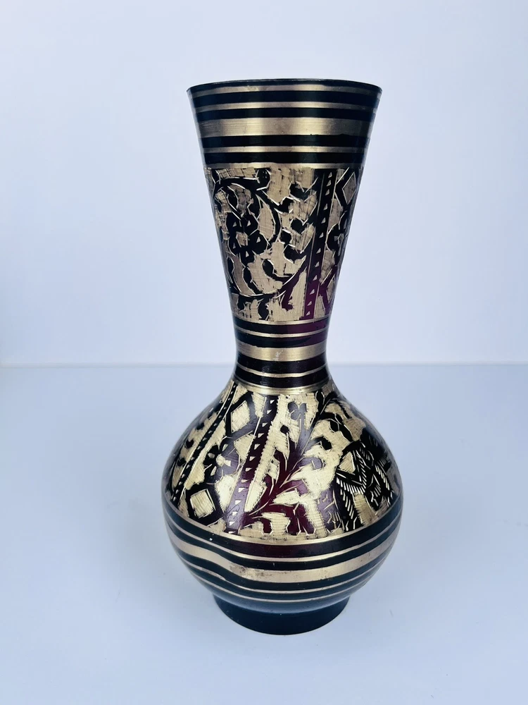 Black Metal Vase With Brass Etched Gold In Beautiful Floral Design Medium Size. Beautiful etched vase elegant great piece