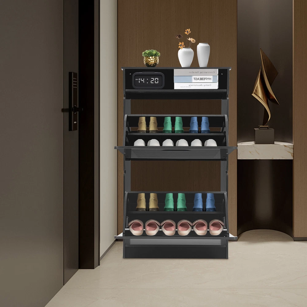 This shoe storage cabinet is a game-changer for small spaces! The sleek black design fits perfectly in my entryway without looking bulky. It holds 8 pairs securely, and the flip-down doors make grabbing shoes super easy. Assembly was straightforward, and the PVC material feels sturdy—no wobbling even when fully loaded. Love that it hides clutter while keeping everything within reach. Perfect for sneakers, flats, or small boots. Highly recommend for anyone needing smart, stylish storage!
