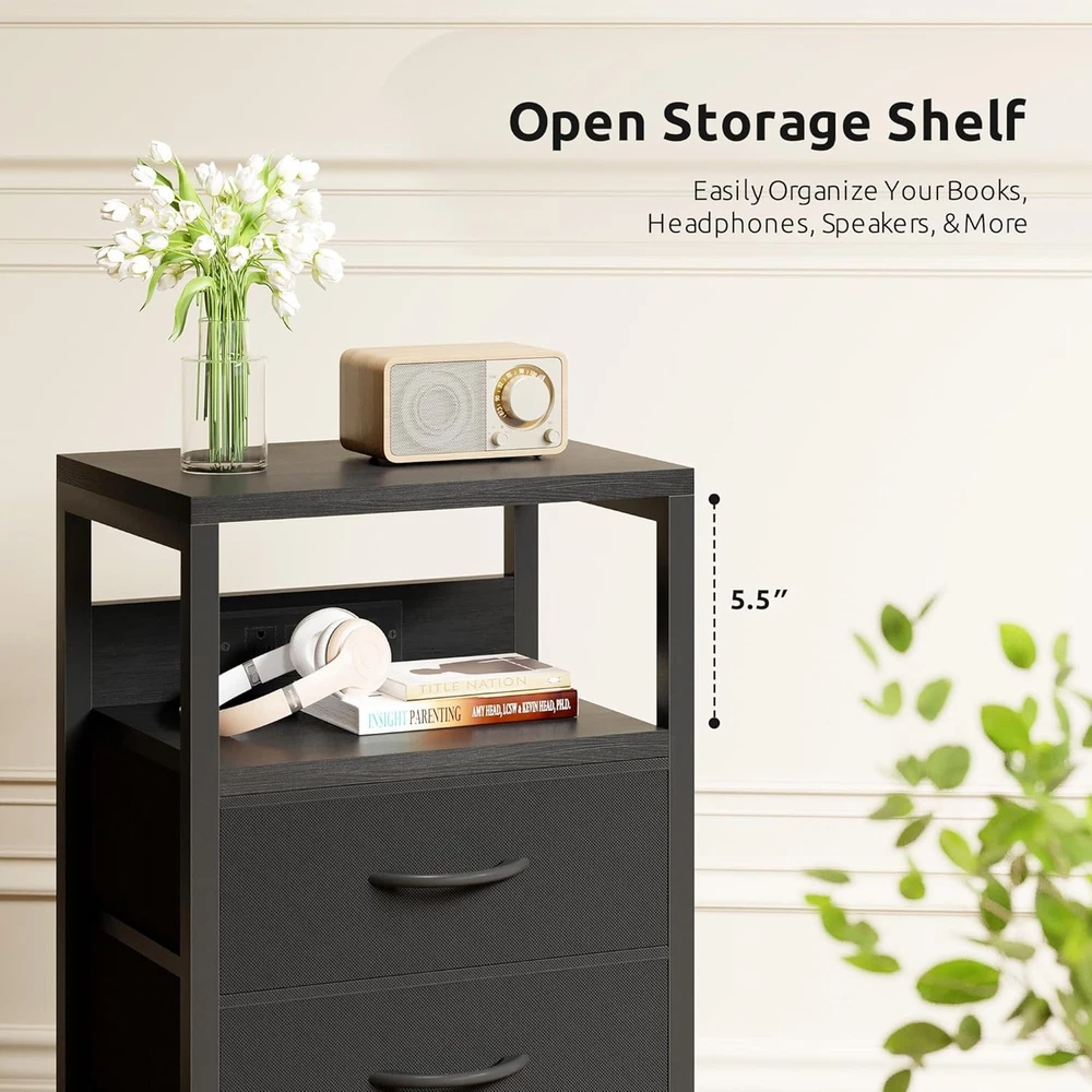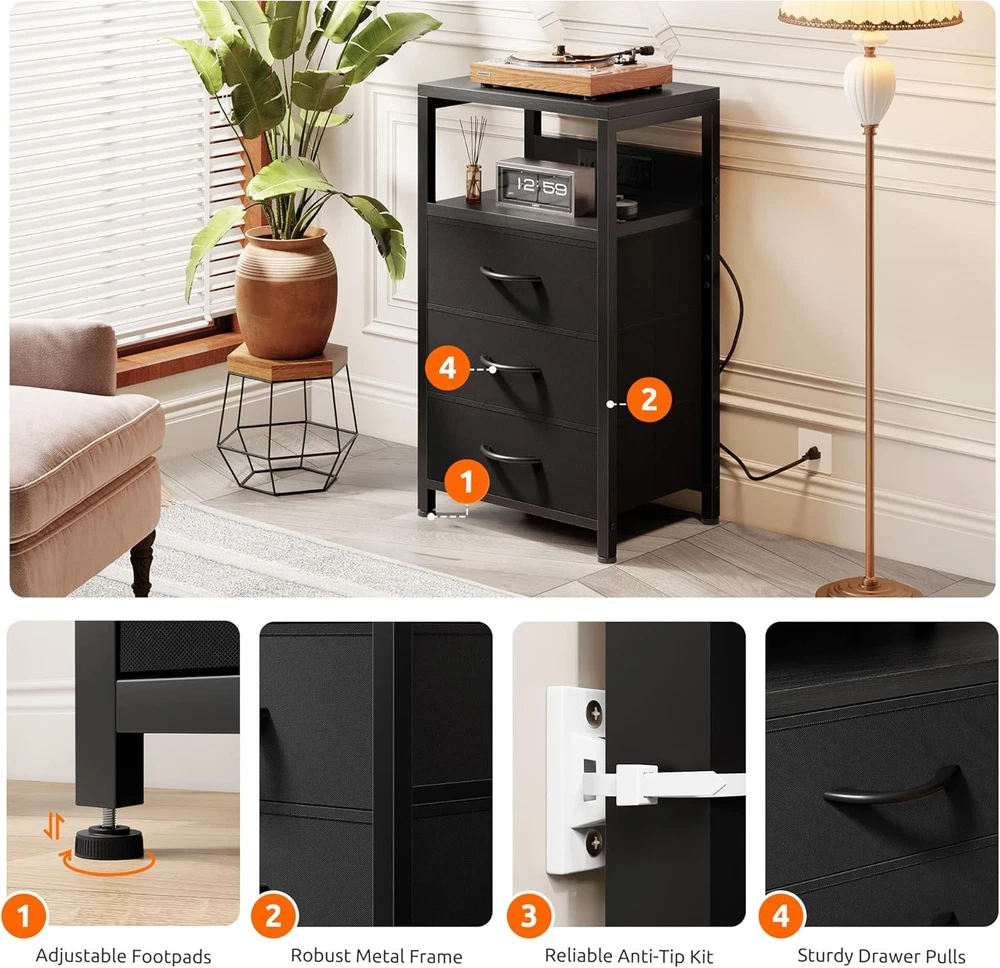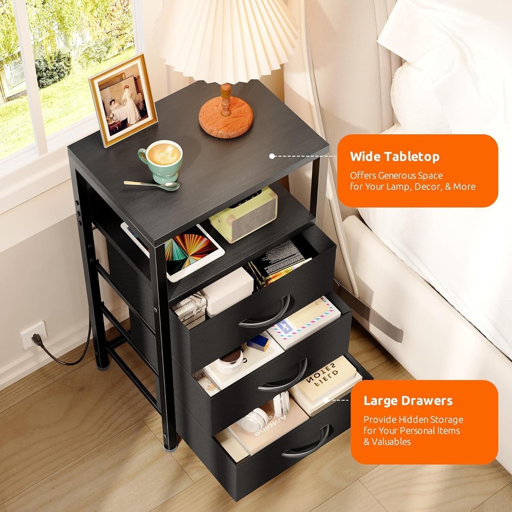 NightStand Bedside Charging Table Bedroom - Night Stand with 3 Drawers, Black Product Details Brand: Lazzanto Product Dimensions: 11.7"D x 15.9"W x 27.6"H Maximum Weight Recommendation: 50 Pounds Color: Black Product Care Instructions: Wipe with Damp Cloth Frame MaterialTop Material Type: MetalFSC-Certified Wood Modern Bedside Table: Upgrade your bedroom with Lazzanto's nightstand, designed for style and practicality. The removable charging station can be installed on the front or back for convenient charging, no matter your room layout Universal Power Hub: With 2 AC outlets, 2 USB ports, and a USB-C port, this night stand with charging station keeps all your devices charged at once. Plus, the adjustable footpads ensure a wobble-free setup and protect your floors from scratches Hassle-Free Assembly: Thanks to easy-to-follow instructions and all the included hardware, setting up your modern nightstand is quick and easy. Most adults can have it ready in just 0.5-1 hours Built to Last: Crafted from sturdy particle board and metal, this black nightstand offers superior strength and wear resistance. Its waterproof surface makes maintenance a breeze, keeping it looking great with minimal effort over time Spacious Storage: This bedroom night stand offers 3 fabric drawers to store your personal items and valuables, while the wide tabletop and open shelf provide extra space for books, speakers, and other accents that add style to your space