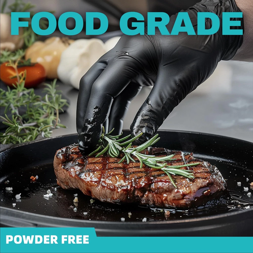 Black Nitrile Exam Gloves, 4.0 Mil, 100 Pcs Disposable Gloves Powder-Free Latex-Free for Medical, Cooking, Food-Safe , Non-Sterile, industrial gloves LATEX-FREE & POWDER-FREE: Nitrile Gloves contain no natural rubber latex and are manufactured without powder, It is an ideal solution for those affected by common glove allergies and sensitivities. FEATURES: Black nitrile has a smooth finish for greater tactile feedback, this glove comes with 4 Mil thickness, which is the perfect thickness for most daily uses. BULK QUANTITY: conveniently packaged to reduce storage space while ensuring a supply is always on hand - 100 Pcs disposable gloves per box. MULTIPLE USES: Gloves are great for use in a lab, kitchen, shop, or around the house - it protects, cleans, grips, and works as hard as you do.