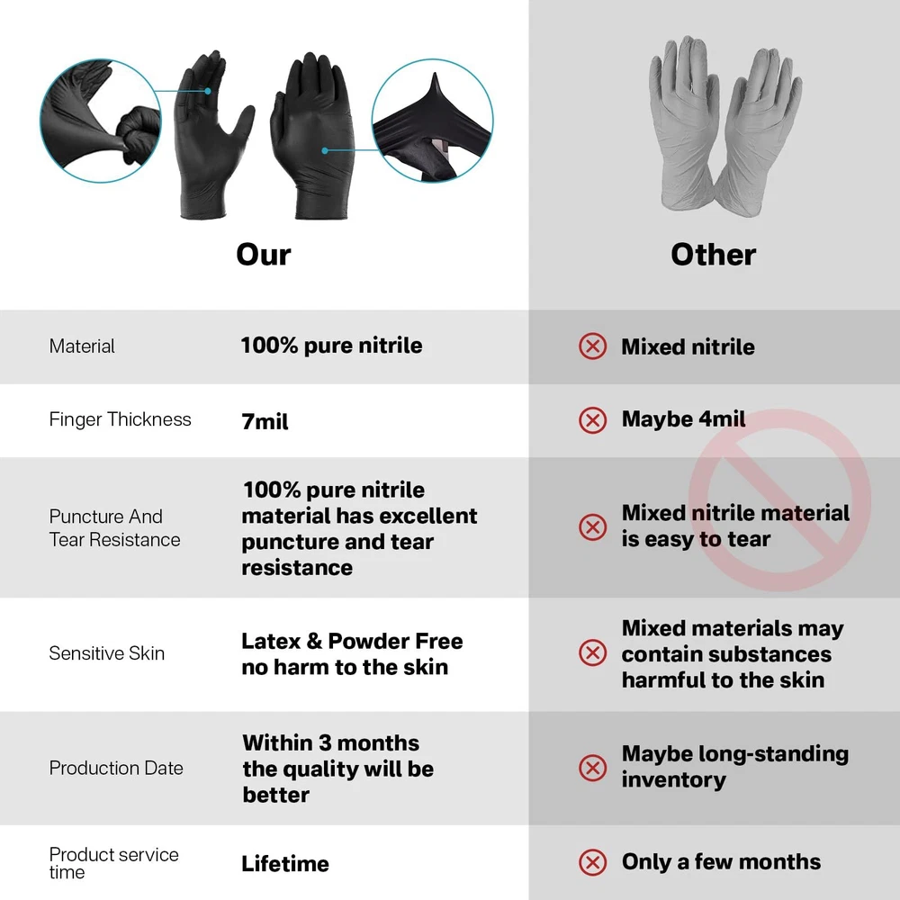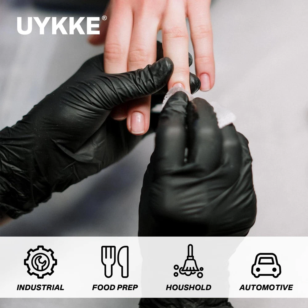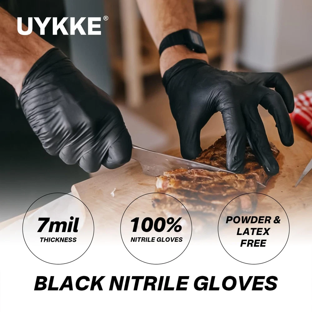 Description Introducing Black Disposable Gloves, crafted from highly stretchable 100% nitrile material, ensuring superior puncture resistance and durability. Designed with a rolled cuff for easy on and off, these gloves come conveniently packaged in a dispenser box, keeping them organized, clean, and readily accessible. Additionally, our Extra Thicker gloves offer enhanced protection against acids, alkalis, punctures, and oils, making them suitable for both professional and household use. Latex-free and powder-free, our gloves cater to individuals with latex sensitivities while providing a comfortable, irritation-free experience. Featuring textured fingertips for improved grip and tactile sensitivity, our gloves are available in medium, large, and x-large sizes, suitable for various work environments and tasks, from household cleaning to professional roles such as chefs, mechanics, and laboratory workers. With their wide range of applications and commitment to quality, Black Disposable Gloves are the ultimate choice for reliable hand protection. We stand behind our products and invite you to reach out with any questions or concerns – your satisfaction is our priority. 【100% Nitrile Gloves】black disposable gloves are made with highly stretchable nitrile material for superior puncture resistance. Also designed with a rolled cuff for easy on and off. Coming in a convenient dispenser box that keeps the gloves organized and clean, while also providing easy access. 【Extra Thicker】gloves are acid-alkali, puncture, and oil resistant, ambidextrous, non-sterile, and have an impervious surface for superior protection and durability in both professional and household use. 【Powder & Latex Free】latex free gloves make them ideal for individuals who are sensitive to latex rubber or vinyl. They are also powder-free, making them a better choice for those who may be irritated by powder. 【Textured Fingertips】Available in medium, large, and x-large sizes and feature a textured surface in fingertips for better grip and tactile sensitivity. This allows for greater control of small equipment in various work environments, including wet and dry objects. 【Wide Usage】Suitable for a wide range of applications, including household cleaning, food preparing, and various professions such as chef, pipe repairman, car mechanic, laboratory worker, tattoo artists and etc. We are committed to providing high-quality products and take full responsibility for their quality. Please feel free to contact us if you have any questions or concerns.
