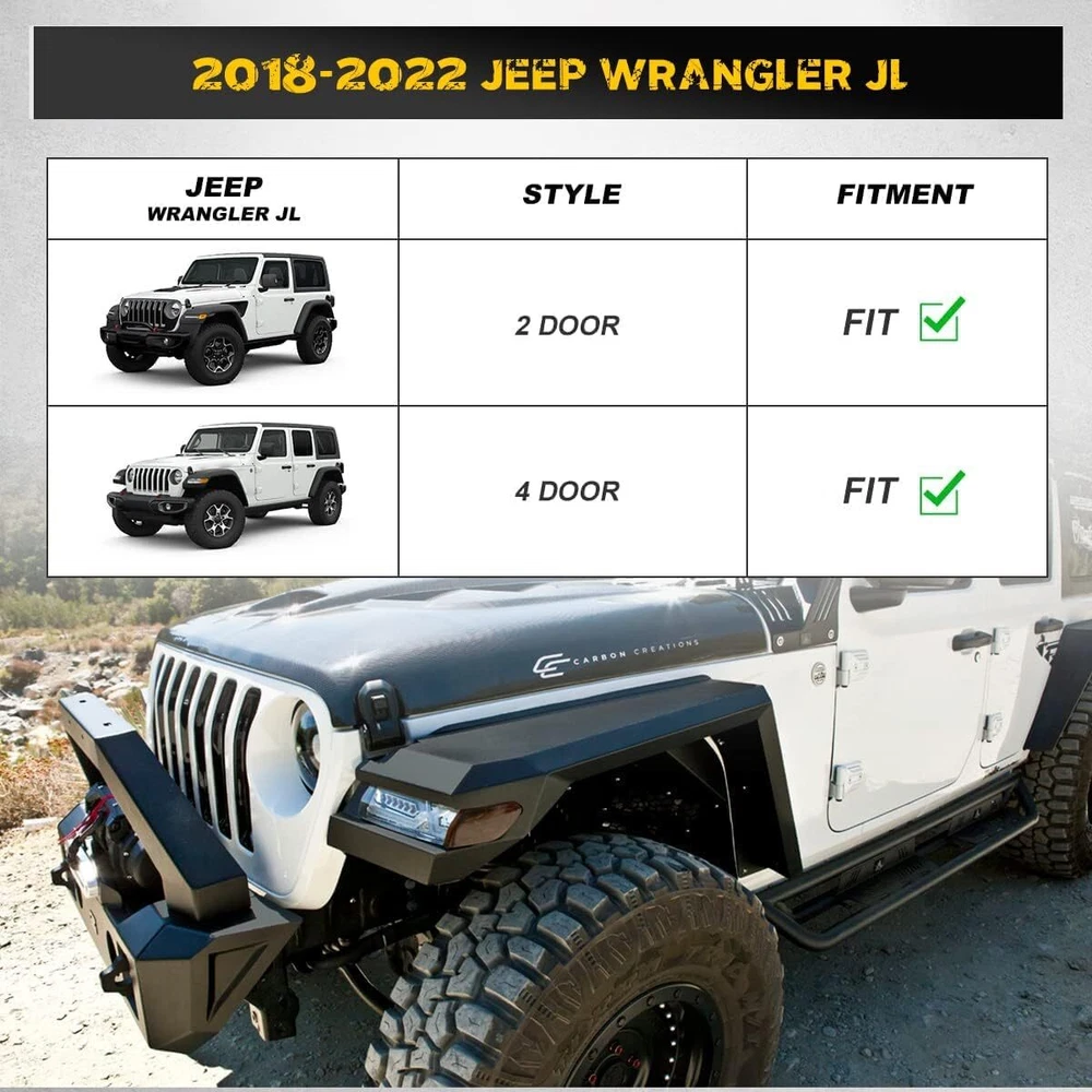 Home Payment Shipping Return Policy About Us Contact Us Feedback Store Categories Other Car Refrigerator Front Bumper Rear Bumper Fender Flares Inner Fenders Side Steps Running Board A-Pillar Light Mount Brackets Headlights Taillights Fog Lights LED Headlights LED Taillights LED Fog Lights Jeep Chevrolet Ford Toyota Dodge GMC Rear Fender Flares: https://www.ebay.com/itm/402792429270 Front+Rear Fenders Flares: https://www.ebay.com/itm/404303320325 ABOUT THIS ITEM 🎪【Compatibility】-- JL Front Fender Flares are compatible with 2018 2019 2020 2021 2022 2023 2024 Wrangler JL/JLU Unlimited, including 2 Doors / 4 Doors models.(Confirm the product is compatible with your vehicle before purchase) not fits for Gladiator. 🎪【OE Turn Signal Light Housing】- Front fender flares with pre-machined attachment points to ensure flush and simple installation of pre-existing OEM size turn signal light assemblies. (Turn signal lights not included). 🎪【Off-road Style】-- Give your Wrangler an aggressive appearance while enhancing clearances for larger tires and off-road travel. Protect wheel wells from mud, scratches, sand and other outer damage when driving off-roads, effectively reduce splash of the dirt aside the body. 🎪【Installation】- Easy to install. No drilling,just bolt-on the fender flares with original screw and factory hole. The fenders are manufactured from Two stage finish using E-Coat pre-coating and high-grade textured black powder coating for long lasting corrosion resistance. 🎪【Package Included】- 2x Front Fender Flares, 1X set of mounting hardware, One-year warranty and lifetime customer service. The packaging is specially designed and tested to avoid the fenders being damaged during delivery. FITMENT 🎪 For 2018 Wrangler JL | JLU 2 Doors / 4 Doors Models 🎪 For 2019 Wrangler JL | JLU 2 Doors / 4 Doors Models 🎪 For 2020 Wrangler JL | JLU 2 Doors / 4 Doors Models 🎪 For 2021 Wrangler JL | JLU 2 Doors / 4 Doors Models 🎪 For 2022 Wrangler JL | JLU 2 Doors / 4 Doors Models 🎪 For 2023 Wrangler JL | JLU 2 Doors / 4 Doors Models 🎪 For 2024 Wrangler JL | JLU 2 Doors / 4 Doors Models Not Compatible with Sport/Sport S Models SPECIFICATION 🎪 Number of Pieces: 2 🎪 Attachment Type: Bolt-On ,Riveted, Screw-On 🎪 Placement on Vehicle: Front 🎪 Mounting Hardware: Included 🎪 Fitment Type:Direct Replacement 🎪 Material: Black Powder Coated Steel 🎪 Features: Mounting Hardware Included 🎪 Placement on Vehicle: Front, Left, Right 🎪 Front Fender Flares Size : 45.21*12.16*21.18 inch 🎪 Front Fender Flares Weight: 35.93 lbs PACKAGE 🎪 1 Pair of Wrangler JL Front Fender Flares(Left and Right Side) 🎪 1x Set of Mounting Hardware Accessories Payment Delivery details Terms of sales About us Contact us Payment We accept PayPal, credit card , Apple Pay & Google Pay etc. Delivery details All items will be shipped within 1-3 business days after payment received, we will try our best to ship out as soon as we can, hope for your understanding. Please double confirm your address and contact information, which will help the delivery faster and more accurately. Note :buyers who purchase international products need to pay import tariffs!!! Terms of sales Professional installation is highly recommended. Any problem of the item please feel free to contact us first , please D o Not leave negative feedback before that, or simply return it within 60 Days in original condition. We will resolve it for you ASAP. About us Any questions please do not hesitate to contact us directly by eBay message . We will reply you within 24 hours asap, thanks for your understanding. Contact us Should you have any problem or require any further information please feel free to contact us . If you are satisfied with our product and service, please kindly leave us a positive feedback. On Aug 5, 2024 at 03:26:34 PDT, seller added the following information: