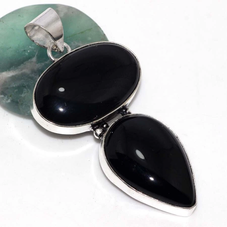 Black Onyx 925 Silver Plated Gemstone Pendant 2.3" Aesthetic Jewellery JW