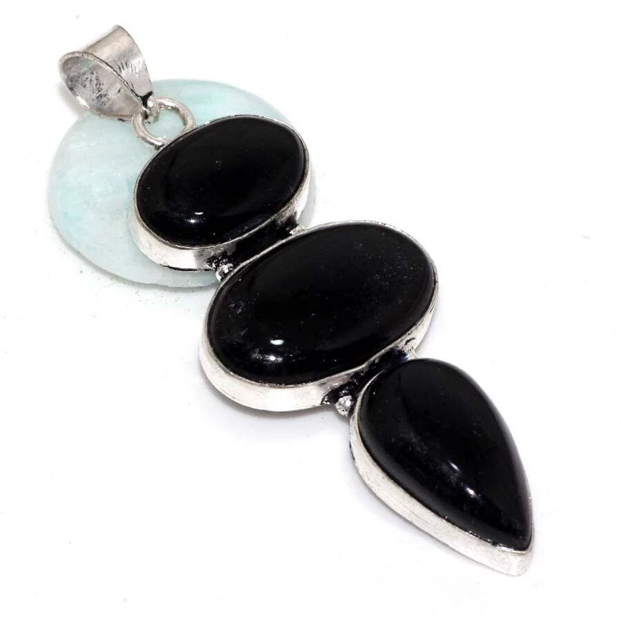 Black Onyx 925 Silver Plated Gemstone Pendant 2.6" Aesthetic Jewellery JW