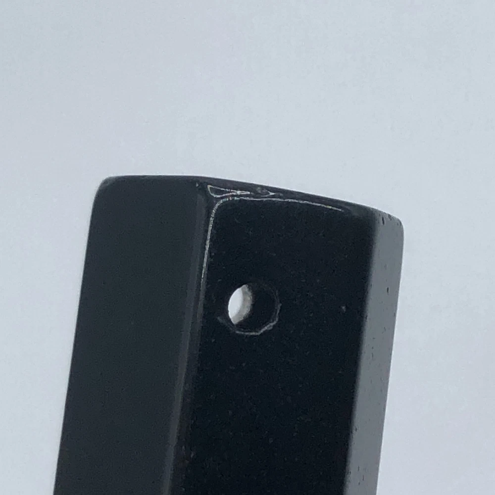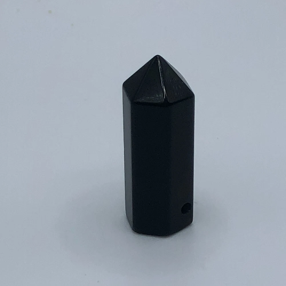 Point of black onyx crystal. 1.25 inches tall, 0.5 inch diameter. Weighs 10 grams. Hole for chain or cord to be worn as a pendant.