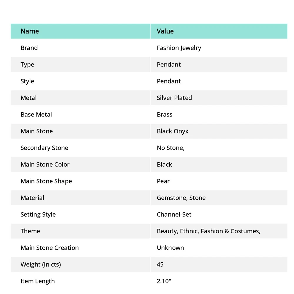 Wholesale: Yes Type: Pendant Era: Undated Features: Engraved Cut Grade: Good Number of Gemstones: AS Seen In Picture Main Stone Shape: Pear Color: Black Chain Type: dose not apply Vintage: No Signed: No Main Stone Creation: Unknown Weight (in cts): 45 Theme: Beauty, Ethnic, Fashion & Costumes Antique: No Necklace Length: dose not apply Style: Pendant gtin13: does not apply Metal: Silver Plated Handmade: Yes Setting Style: Channel-Set Material: Gemstone, Stone Country of Origin: India Closure: Hook Occasion: Anniversary, Birthday, Christmas, Engagement, Wedding Brand: Fashion Jewelry Item Length: 2.10" Seller Warranty: Yes Main Stone: Black Onyx Metal Purity: Unknown Base Metal: Brass Customized: No Secondary Stone: No Stone Main Stone Treatment: Not Enhanced UPC: does not apply Pendant Shape: Pear Pendant/Locket Type: Charm Personalize: No Country/Region of Manufacture: India Seller Notes: “"Gemstone Handmade Fashion Jewelry Products"” Gemstone Clarity Grade: Eye Clean Main Stone Color: Black