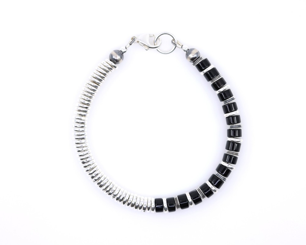 ✨ This unisex bracelet pairs deep black onyx heishi beads with bright sterling silver spacer beads in a clean split design that immediately catches the eye. The 6mm profile gives it a confident presence while staying sleek, modern, and easy to wear. Inspired by Native American artistry and the timeless contrast of dark and light, the bracelet feels strong, balanced, and intentional. It works equally well worn alone as a statement or layered with other favorites. 💎 Crafted for durability and comfort, strung on nylon coated stainless steel wire the bracelet is secured with a sterling silver lobster clasp for dependable everyday wear. Black onyx has long been associated with protection, grounding, and inner strength, while sterling silver represents clarity and refinement. Together they create a powerful visual and symbolic balance that makes this piece meaningful as well as stylish. ------------Details:------------ Bead Size: 6mm Color: Black and Silver Accessories: Sterling Silver Lobster Clasp Metal: Sterling Silver Bracelet Length: Available from 6" to 9.5". Please select your size from the dropdown menu. Styling: Unisex styling, suitable for a man or woman and would make a perfect gift! Packaging: All pieces purchased come ready for gift-giving Lead Time: Shipping on this item is within 3 days of receiving payment. 📦 Shipping: Standard Shipping to U.S. Addresses: Orders are shipped via USPS 1st class mail. Domestic delivery times range between 2-9 days, but in most cases 2-4 business days to the contiguous 48 states. Standard Shipping to International Addresses: Orders are shipped via USPS 1st class international mail. Delivery times range between 10-21 business days.