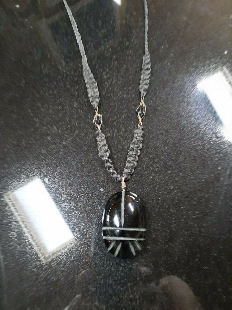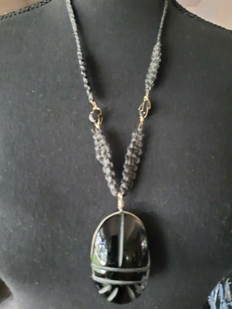 Black onyx neclace, Unisex wire wrapped 2'' carved Onyx. Condition is "Pre-owned". Shipped with USPS First Class. Hand tight necklace with small pieces of onyx and sylver weave 12'', total 14''.It will definitely make a statement.