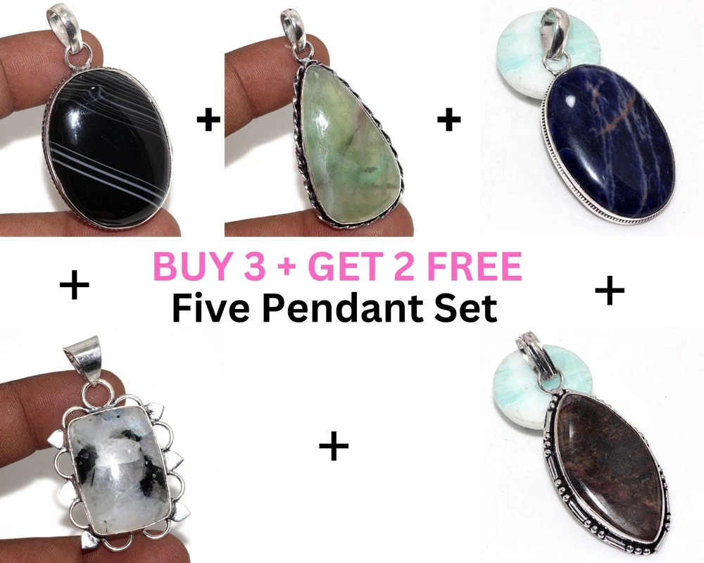 Shape: AS Seen in Picture Number of Gemstones: AS Seen in Picture Secondary Stone: Moonstone,Rhodonite Theme: Ethnic Setting Style: collet setting Country/Region of Manufacture: India MPN: ED6298-6299-63275-6337-63475 Main Stone Color: As Seen in Picture Main Stone Creation: Natural Era: Undated Wholesale: As your Request Brand: HANDMADE Features: Silver Plated Main Stone Treatment: Not Enhanced Occasion: Wedding Gifts, Valentine's Gift, Mother's Day, Christmas Material: Stone gtin13: does not apply Personalize: No Main Stone: Black Onyx,Fluorite,Sodalite Cut Grade: Excellent Main Stone Shape: AS Seen in Picture Sizable: Yes Type: Five Pendant Set UPC: does not apply Item Length: 2|2|2|2|2.4 Metal Purity: Unknown Handmade: YES Band Width: Band Width Antique: NO Metal: Copper Alloy Country of Origin: India Color: AS SEEN IN PICTURE Base Metal: Copper Style: New Size: 2|2|2|2|2.4 Customized: No