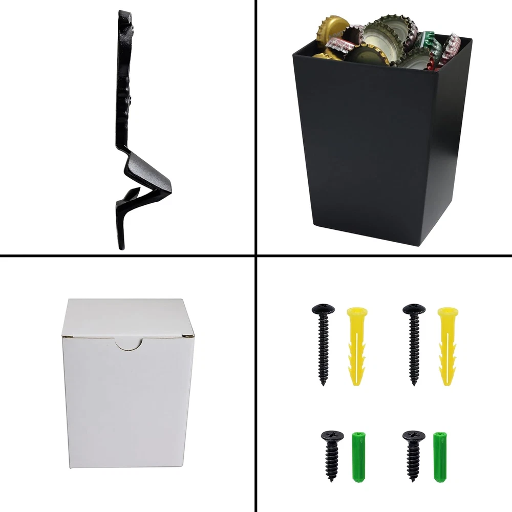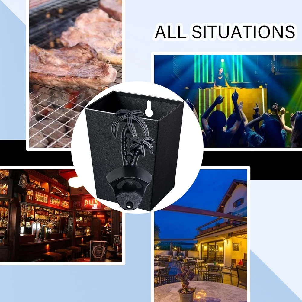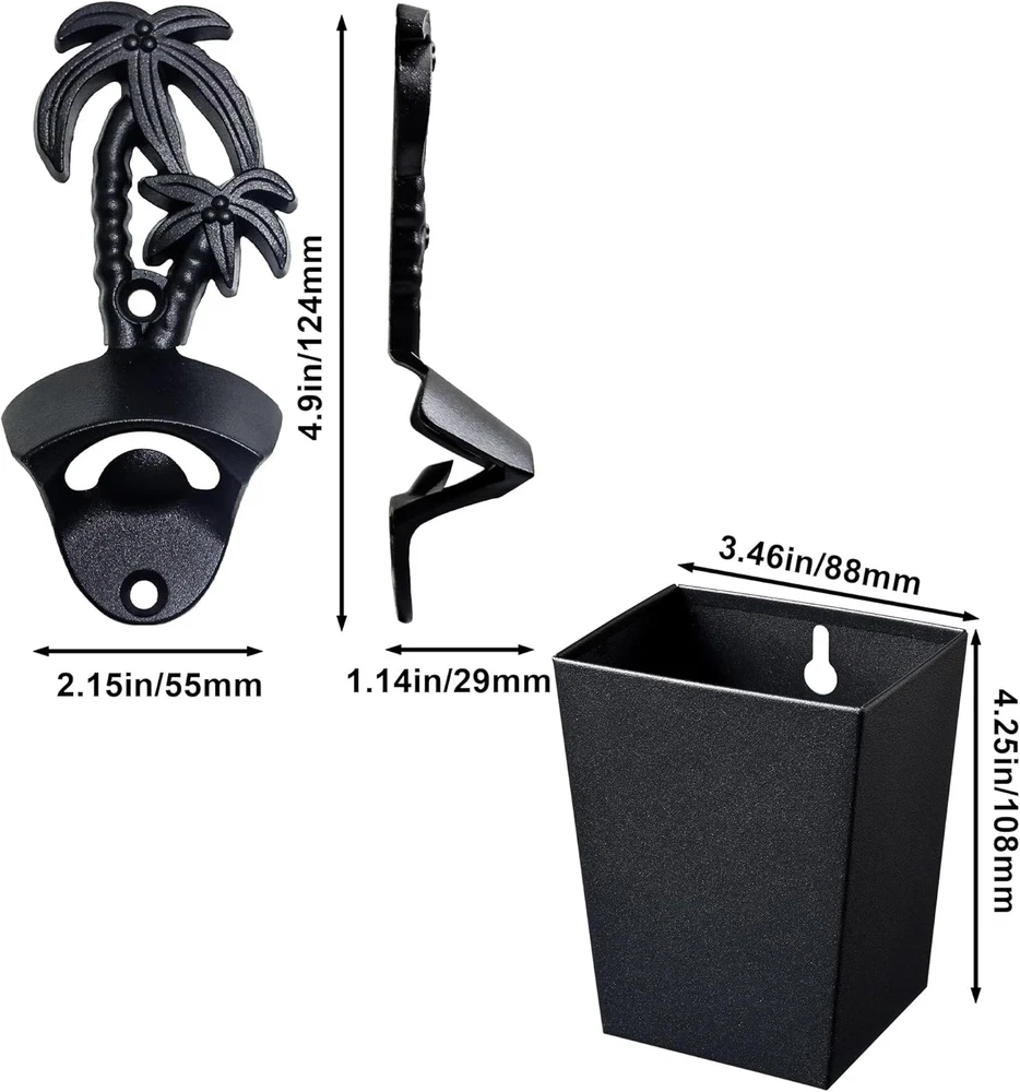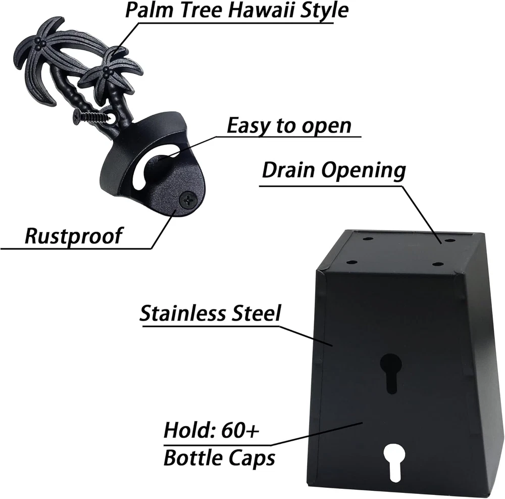 Beach Style: Open beer bottles in style with our bottle opener! It's more than a simple bottle opener. Paired with bottle cap catchers of the same color, you can enjoy it without having to worry about bending down to pick up bottle caps Convenient to Use: Our wall mounted bottle opener and cap catcher makes opening beer quick and easy. Just shake it and you'll have a cold bottle of beer in your hand. Simply place your beer bottle into the bottle opener and pop the cap off. It's a must-have bottle opener for your kitchen bar with a fun style that's perfect for a variety of occasions, from casual gatherings to holiday parties Handy to install: Our beer bottle opener is an ideal addition to your poolside. This isn't just for looks; it's a functional bottle opener too! Installation is simple with the included mounting hardware. There’s no reason why you shouldn’t install the bottle opener on your wall as soon as you receive it. We've included everything you need to hang it right away, so just crack open a beer and enjoy Product Contents: Includes a mountable black palm tree bottle opener (size: 2.15x1.14x4.9 inches) and bottle cap catcher (size: 3.5x2.8x4.25 inches) Product Description Black palm tree bottle top opener and cap catcher post mounted for beach bar Include Mounting Screws Jumiok is committed to creating high-quality bottle openers. Here, all you need to do is choose the bottle opener you like. No scarp metal High quality materials Durable and long-lasting construction Wall mounted beer cap opener and cap holder Jumiok palm tree desgin beer cap opener is a great choice for your beach holiday Capacity: the black beer top catcher hold more than 60 bottle caps.No mess any more. Mounting screws include Hawaii Style Stainless Metal Made from excellent quality metal Easy to Clean Simple to Mount Attached screws and proper hole spacing are convenient for you to install the Jumiok Bottle opener. Durable Structure Designed with durability in mind, the wall mounted bottle opener and cap catcher is constructed from rust-resistant stainless steel with a sturdy finish to withstand years of use. Rustproof Design Our rust-proof stainless steel bottle cap catcher is a stylish and durable solution for keeping your bar and kitchen counters free of bottle caps. Its rust-proof design ensures long-lasting use, making it the perfect addition to any home bar or a great gift for dad, boys' friends, and more.
