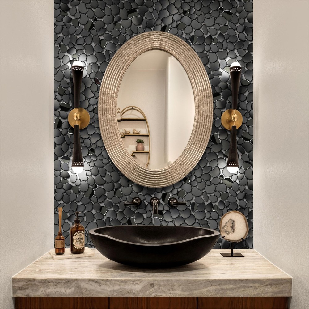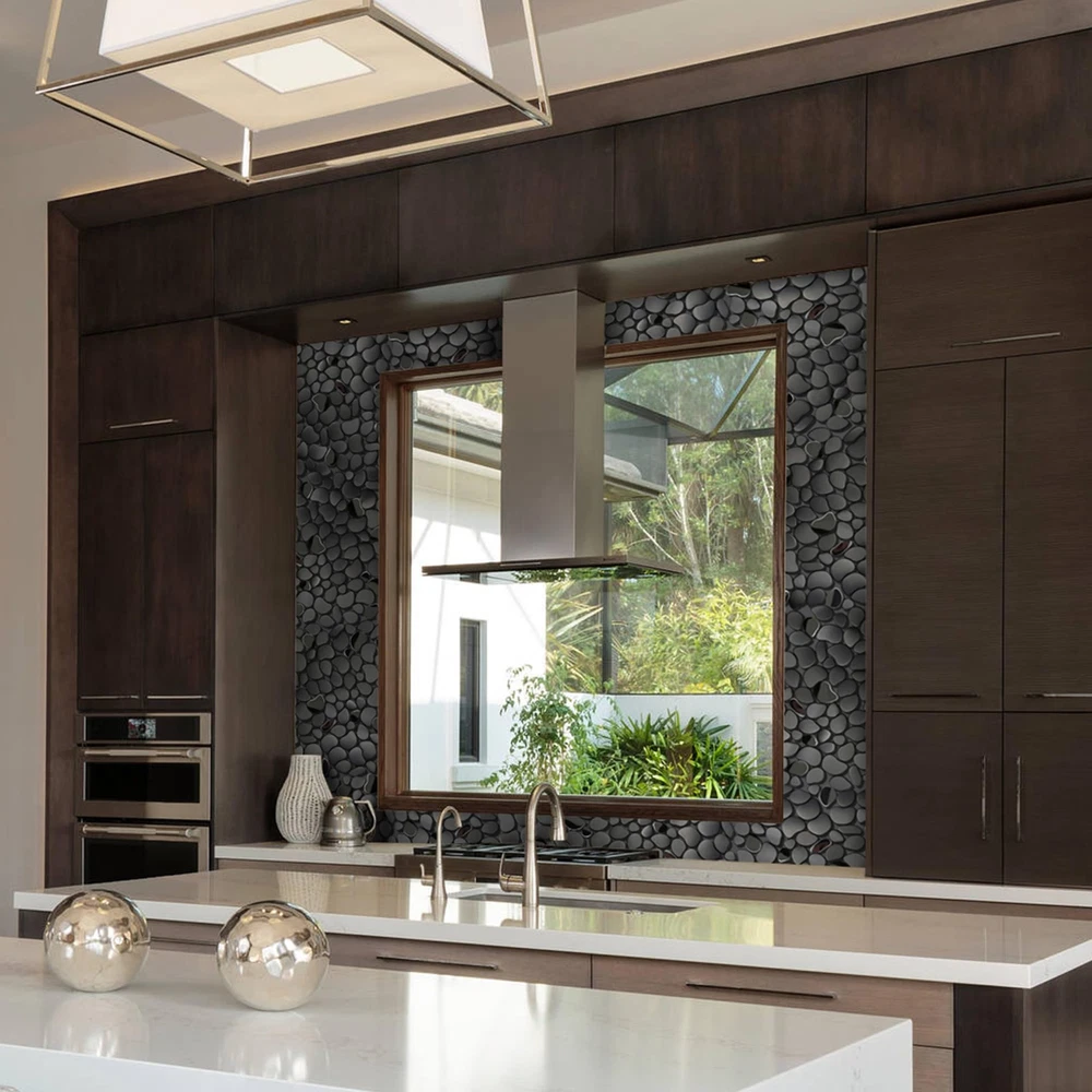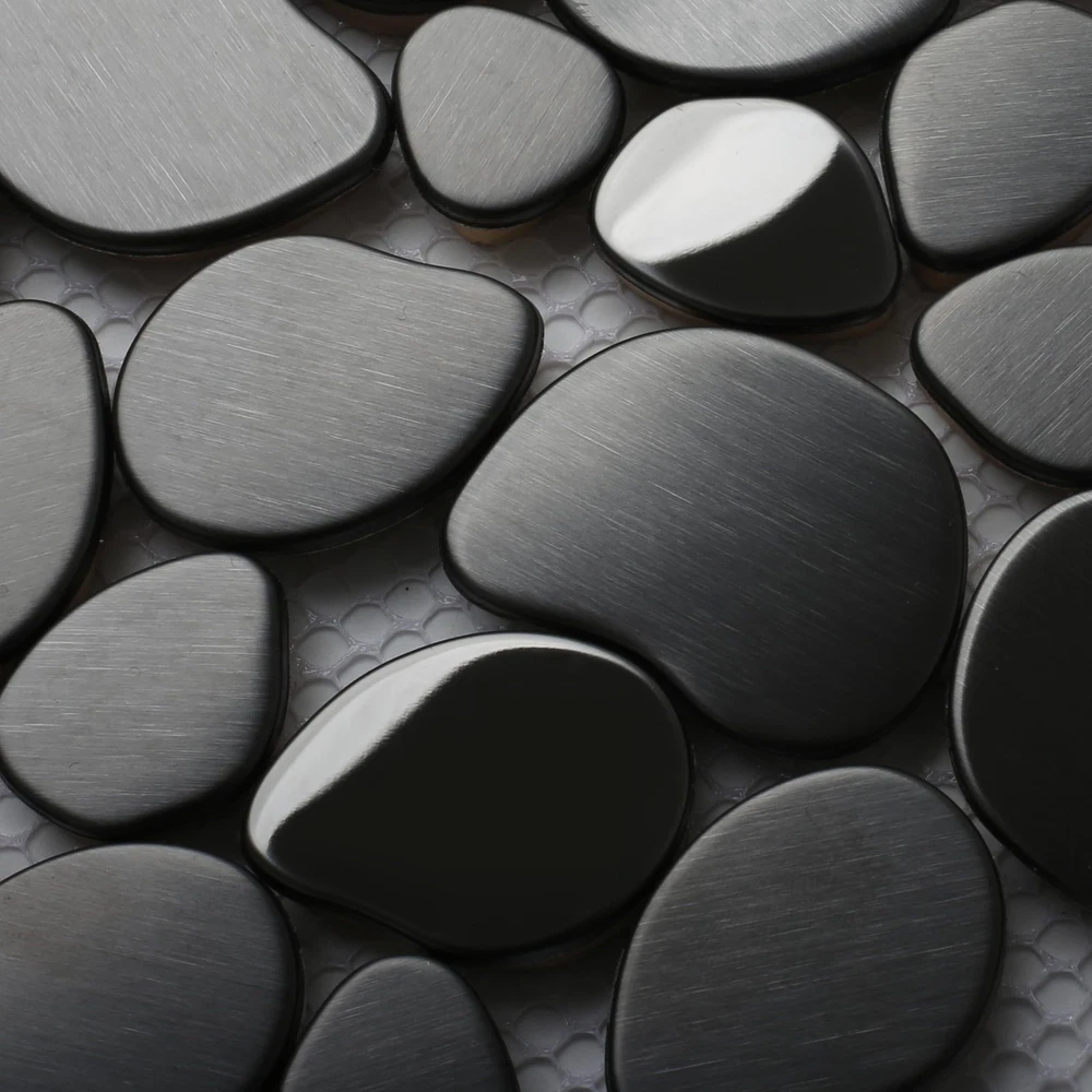 1. Absolutely love this black pebble metal mosaic tile for my kitchen backsplash! The stainless steel pebbles add such a sleek, modern touch, and the reflective surface makes the space feel more open and luxurious. Installation was a breeze since they come mounted on mesh—no fuss with individual pieces. The random sizes give it a natural yet elegant look, and the black finish pairs perfectly with my gold accents. It’s durable, easy to clean, and totally transformed my kitchen into a stylish showstopper. Highly recommend for anyone looking to upgrade their space!
