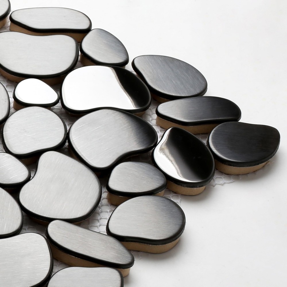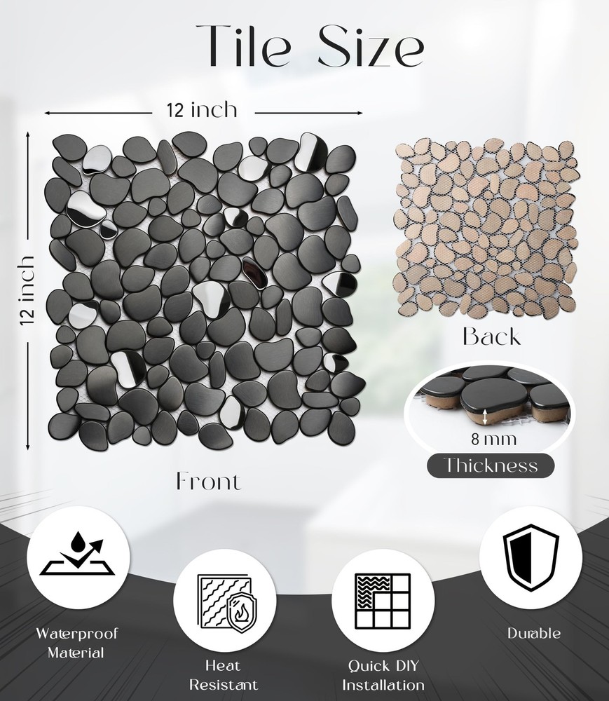 This is black pebble tile. Metal mosaic tiles are a type of decorative tile that is made from metal, like these pebbles are made of stainless steel. They are small, random sized pebbles mounted on a mesh, and are designed to be installed in a pattern to create a decorative surface. One of the most notable features of metal mosaic tiles is their reflective properties. The shiny surface of the black tiles creates a unique and eye-catching look that can enhance the beauty of any space. The gold tile can be used to create a modern and contemporary look, or to add a touch of glamour and luxury to a space. Metal mosaic tiles are highly durable and can withstand wear and tear from daily use. They are also resistant to moisture, making them an ideal choice for use in wet areas such as the kitchen or bathroom. Additionally, black metal mosaic tiles are easy to clean, as they can be wiped down with a damp cloth or sponge. These tiles can be installed on walls, floors, or even on ceilings to create a decorative surface. They can be used in a variety of settings, from residential to commercial spaces. Metal mosaic tiles are a popular choice for creating a backsplash in the kitchen or bathroom, as they add a unique and stylish look to the space. Overall, metal mosaic tiles are a stylish and durable choice for creating a decorative surface in any space. With their reflective properties, durability, and easy maintenance, they are a great option for adding a touch of elegance and sophistication to any room. Product Size - Each black metal mosaic tile measures 12 x 12 inches, 8 mm thick and weighs about 2 pounds. Box of 5 metal tile covering 5 square feet. High-quality Material - Real metallic tiles are usually made of stainless steel. These are heavy and durable, not easy to fade, non-slip, waterproof and high temperature resistance. Easy to Cut and Install - The black pebble tiles are mounted on a mesh sheet which allows for an easy installation and cutting. Non-sanded grout only. NOT peel and stick tiles. The black metal pebbles is not slippy after grout. Perfact for use as tiles for shower floor. Widely use: Not only as tiles for kitchen backsplash, bathroom wall, mirror wall, accent wall, shower floor in house decoration, but also the company logo wall, lobby backdrop, receiption desk front in office, cafes, and other commercial place decoration.