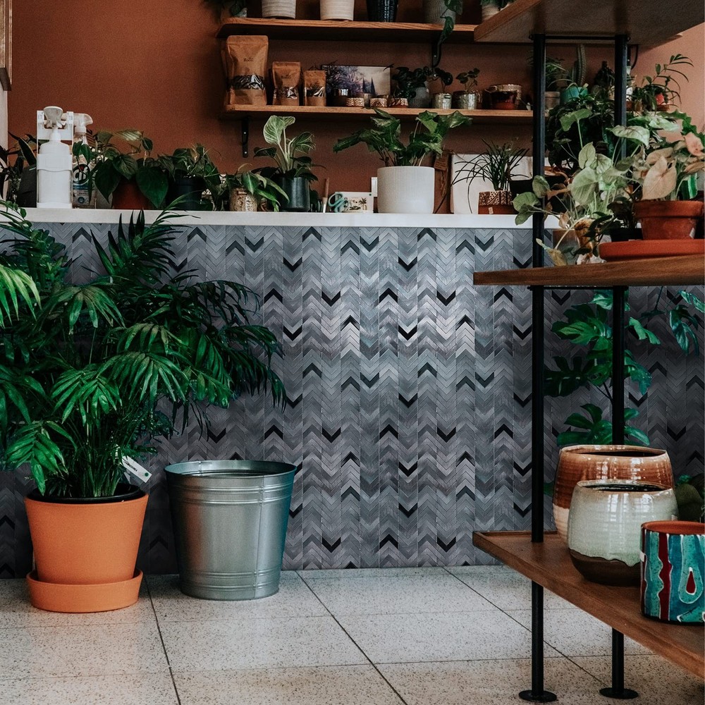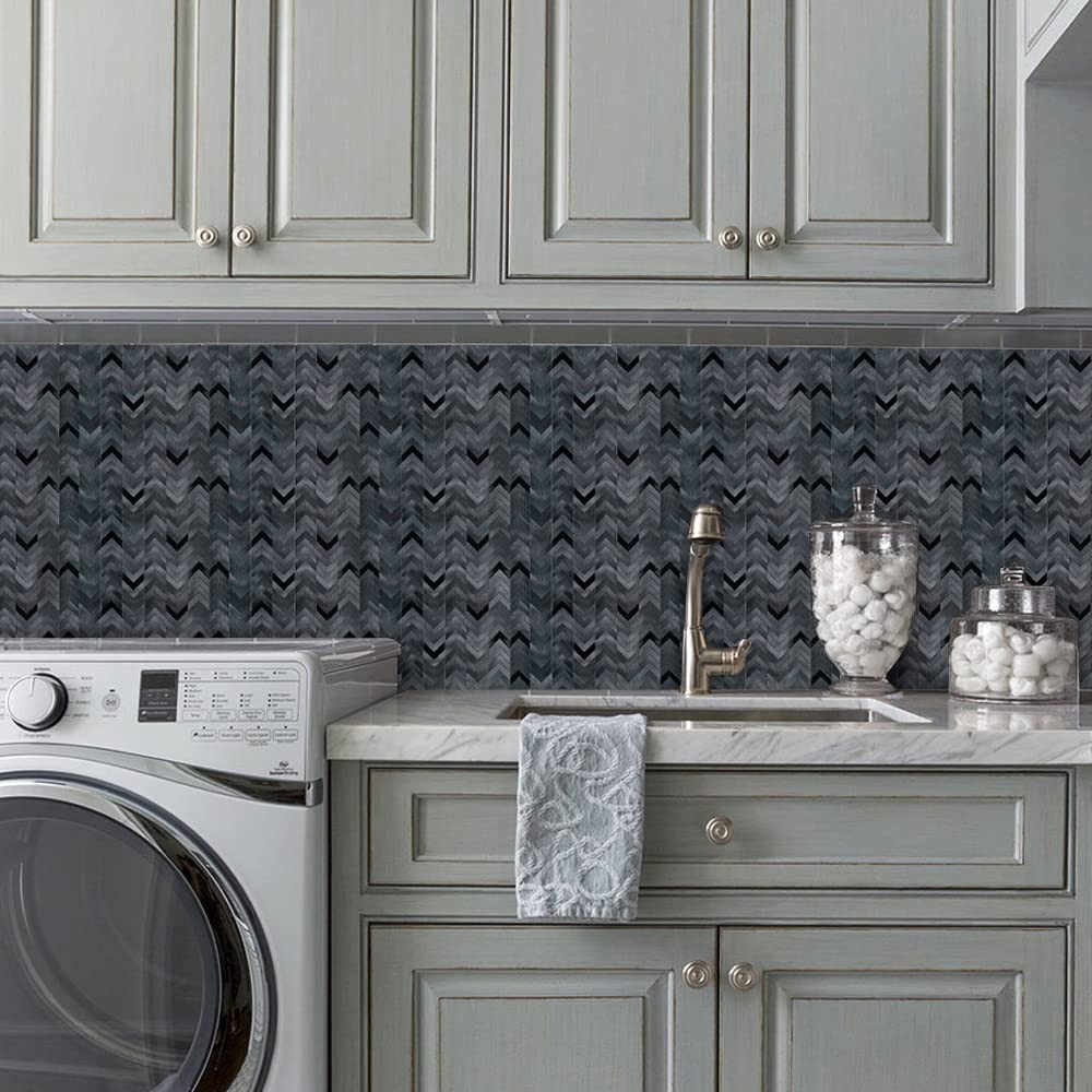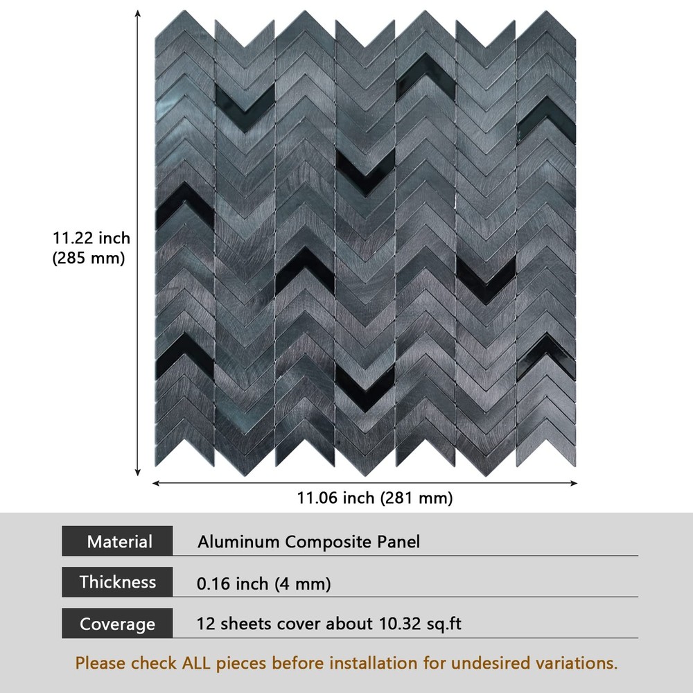 【Size & Pack】Come in a box of 12 sheets black peel and stick backsplash tiles (non-magnetic). Size 11.06'' x 11.22'', thickness 0.16 inch. 12 sheets cover about 10.32 square feet. An easy way to get a new and sophisticated look. 【Premium Metal Peel and Stick Tiles】With high quality aluminum composite material, our herringbone tiles are water resistant and heat resistant. Anti-scratch durable brushed aluminum surface, easy wipe to clean and maintain. 【Easy to Install】Just peel and stick, simple and easy to install. No special tool, no grout, no mess, save your time and money on labor. Can be cut by using heavy duty scissors, jig saw or chop saw. 【Strong Adhesion】Can stick firmly to smooth and clean surfaces. Once stuck it would be tough to get off, please confirm the position before applying. 【Widely Application】These kitchen backsplash tiles are suitable for most indoor applications, such as kitchen backsplash, livingroom walls, bedroom walls, bathroom wall tile, fireplace surround, etc. But please don't expose tiles to open flames, or submerse in water.