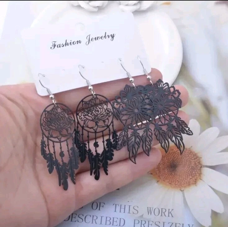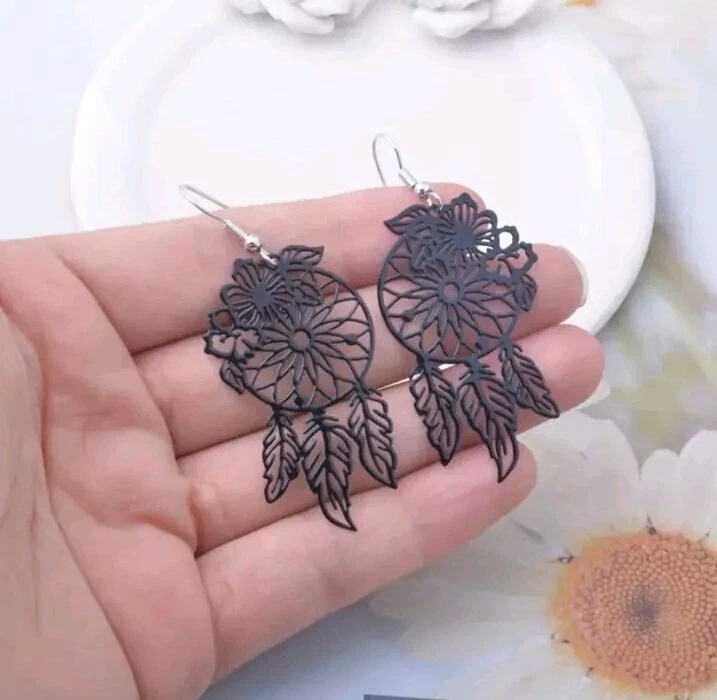These beautiful black peony feather tassel earrings are the perfect addition to any bohemian or fashion-forward jewelry collection. The asymmetrical design with a hook closure and hollow drop style gives them a unique and dreamy look. The earrings are made of nickel-free zinc metal and feature a dream catcher theme, making them a perfect gift for any fashion-savvy friend or loved one. The earrings are sold by the brand DREAM and come with a seller warranty for added peace of mind. They are not antique or vintage, but they are sure to make a statement. These earrings are perfect for everyday wear or for special occasions. Add them to your collection today!