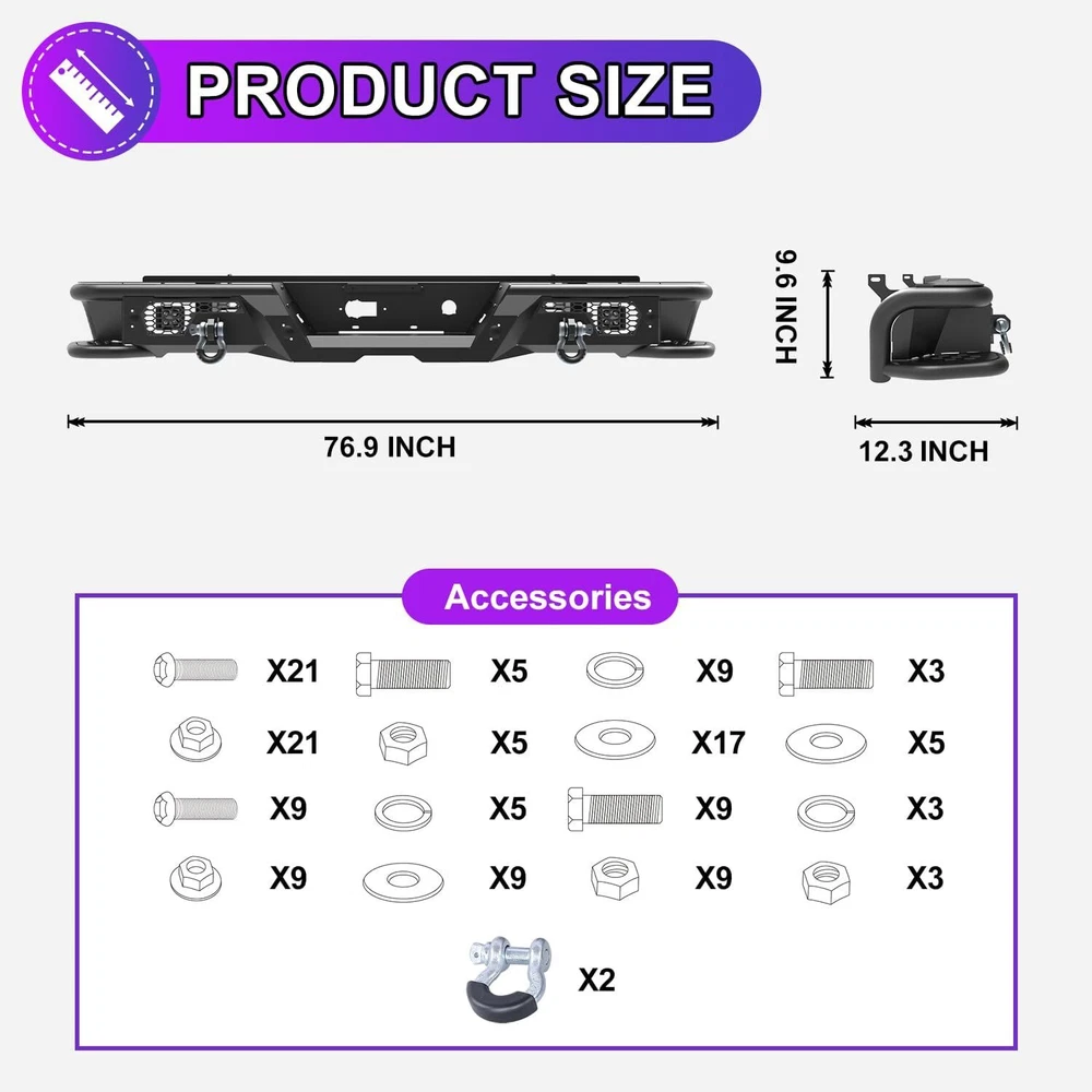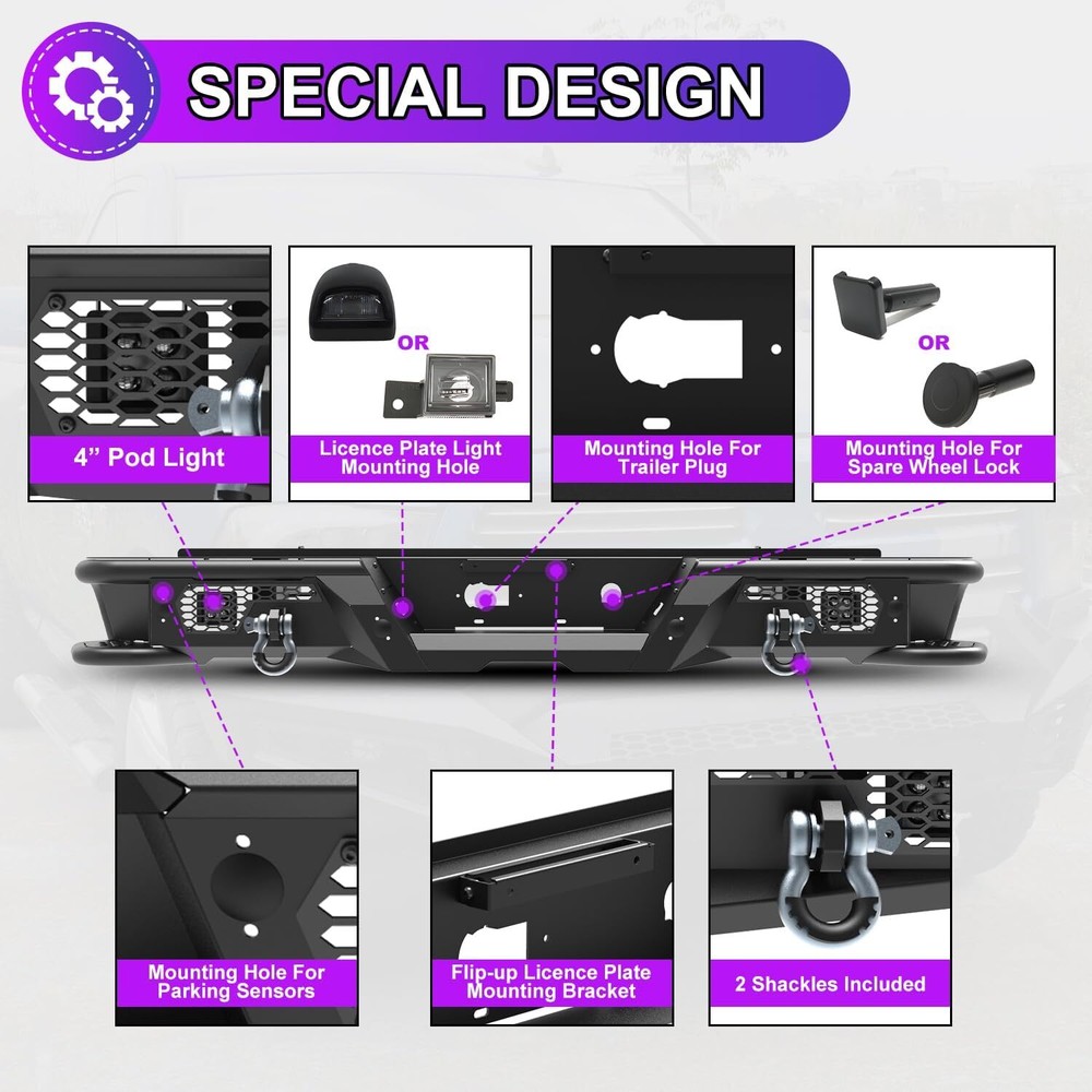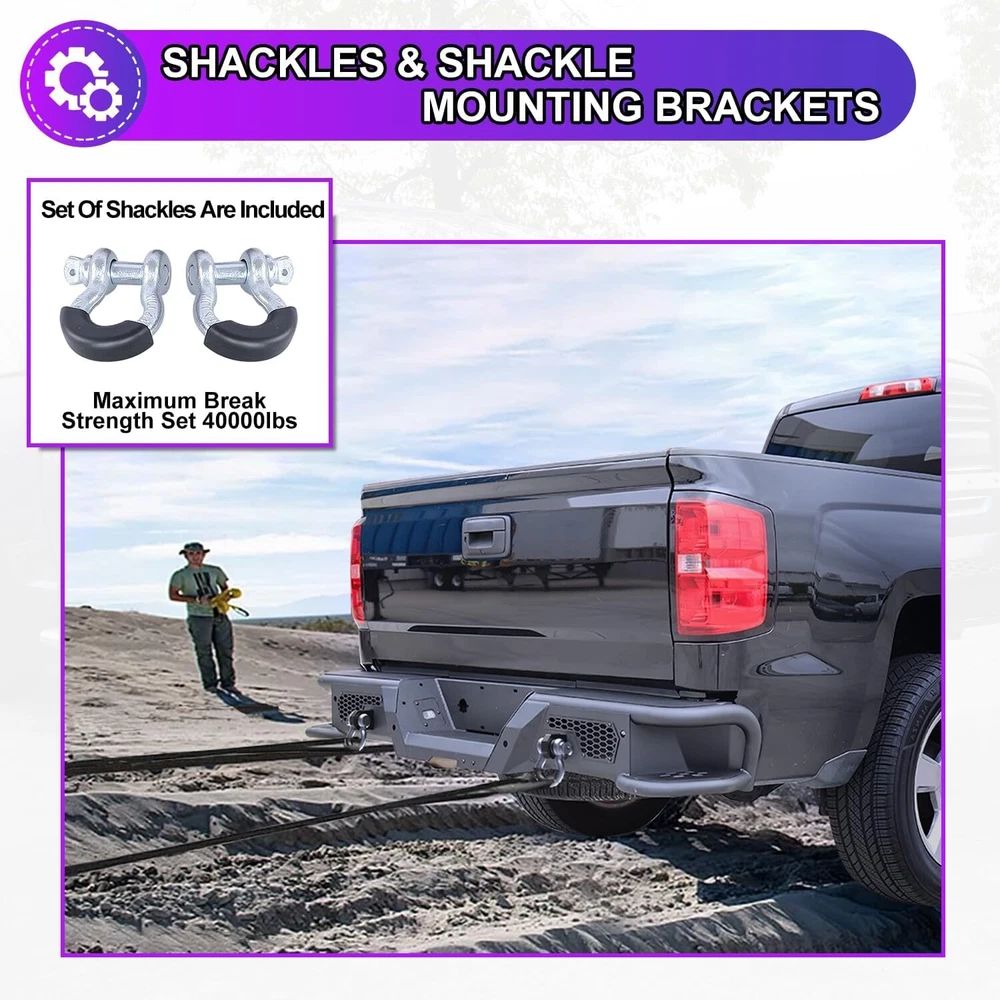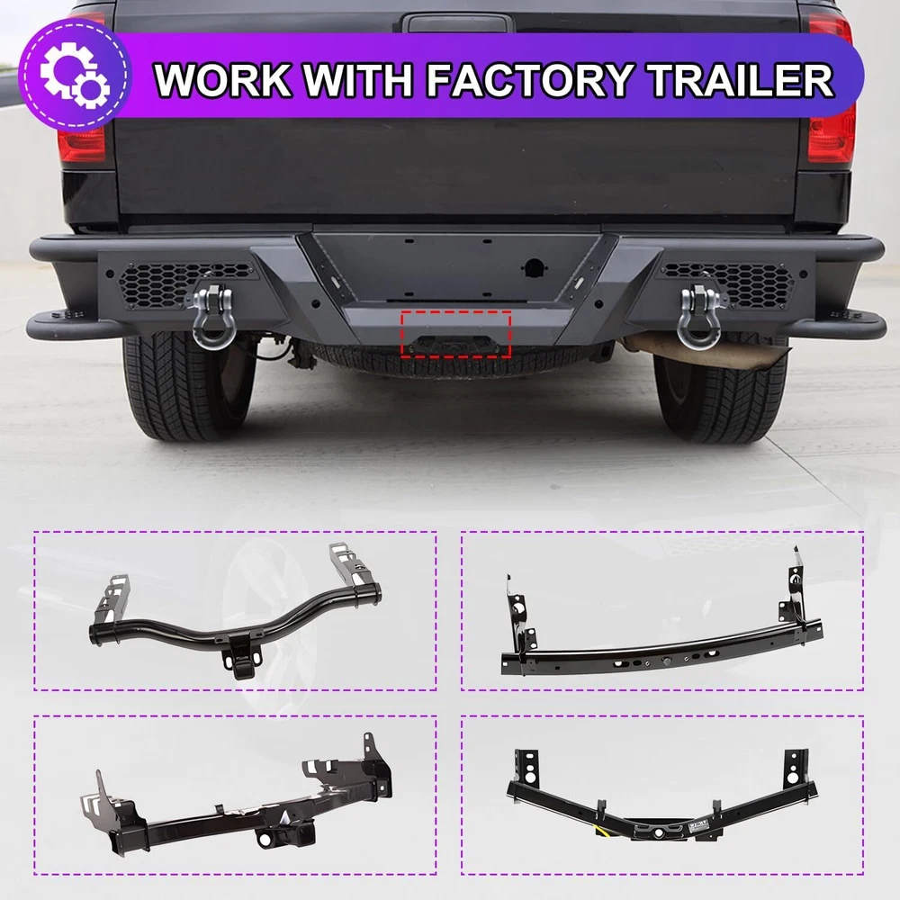 Store Categories Other Car Refrigerator Front Bumper Rear Bumper Fender Flares Inner Fenders Side Steps Running Board A-Pillar Light Mount Brackets Headlights Taillights Fog Lights LED Headlights LED Taillights LED Fog Lights Jeep Chevrolet Ford Toyota Dodge GMC About this item 🚙 【Off-road Rear Bumper Compatibility】Rear bumpers can make or break your truck's limits for off-roading. This rear bumper will be compatible with 2007-2018 chevy silverado 1500 and for 2007-2018 GMC Sierra 1500. 🚙 【Modern Convenient Design, Retain all OEM Features】There are built-in steps on the sides of the rear bumper, equip the bumper with 2 D-ring shackles & 1 Pair 4'' led pod lights that be ready for any situation. Retain all OEM features with the rear bumper. Not only is the bumper compatible with the factory hitch, but it also retains the OEM parking sensors and factory blind spot module sensor. 🚙 【Carbon Steel with E-coating, Longlife and Easy to Clean 】The rear bumper is constructed of 3/16” carbon steel sheet, that has been precisely welded for an accurate fit and stout protection for 2007-2018 chevy silverado 1500. To ensure it is corrosion-resistant, enhancing its looks and lifespan, its finish features anti-corrosion textured powder coating. 🚙 【Bolt-on Installation, Easy and Convenient】The package includes all the parts and bolts needed for installation. Easy bolt-on install with product instruction and hardware that come with bumpers. No drilling or modifications required to silverado/ sierra pickup. 🚙 【Package & Support 】The package includes: 1 x Rear bumper/ 2* Shackles/ 2* Led Pod Lights/ All mounting hardware. 📢📢 Please feel free to contact us via message center if any question. We always stand behind these products and are committed to providing responsive customer service. (Reply within 24 hours) Vehicles Fitment 🚙 For 2007-2018 Chevy Silverado 1500 🚙 For 2007-2013 GMC Sierra 1500 🚙 For 2014-2018 GMC Sierra 1500 Main Specification 🚙 Color: Black 🚙 Include: Mounting Hardware 🚙 Finished surface: Anti-corrosion textured Steel powder coating. 🚙 Type: Rear Bumper 🚙 Material: Q235A 🚙 Package Dimensions: 33.46 * 33.46 * 13.39 inch 🚙 Package Weight: 80.47 lbs 🚙 Product Dimensions: 78.3 * 13.8 * 10.1 inch Package Included 🚙 1x Steel Rear Bumper 🚙 2x Rear LED pod lights 🚙 2x D-Ring Shackles 🚙 1* Set of Mounting Accessories Payment Delivery details Terms of sales About us Contact us Payment We accept PayPal, credit card , Apple Pay & Google Pay etc. Delivery details All items will be shipped within 1-3 business days after payment received, we will try our best to ship out as soon as we can, hope for your understanding. Please double confirm your address and contact information, which will help the delivery faster and more accurately. Note :buyers who purchase international products need to pay import tariffs!!! Terms of sales Professional installation is highly recommended. Any problem of the item please feel free to contact us first , please D o Not leave negative feedback before that, or simply return it within 60 Days in original condition. We will resolve it for you ASAP. About us Any questions please do not hesitate to contact us directly by eBay message . We will reply you within 24 hours asap, thanks for your understanding. Contact us Should you have any problem or require any further information please feel free to contact us . If you are satisfied with our product and service, please kindly leave us a positive feedback. Popular Categories On Mar 14, 2025 at 20:42:06 PDT, seller added the following information: