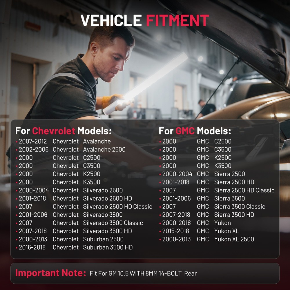 Color: Black gtin13: Does not apply Fitment 4: For 2000-2004 Chevrolet Silverado 2500 HD Feature 5: High hardness Feature 3: Smooth surface Fitment 10: For 2000-2018 GMC Yukon XL Feature 2: Low infiltration Important Note: Fit For GM 10.5 WITH 8MM 14-BOLT Rear Items Included: Cover, Gasket, Nuts Material: Cast Aluminum, lightweight Fitment 1: For 2007-2012 Chevrolet Avalanche Type: Cover Universal Fitment: No Fitment 6: For 2007 Chevrolet Silverado 2500 HD Classic Fitment 3: For 2000 Chevrolet C2500 C3500 K2500 K3500 Brand: TEMBOR Placement on Vehicle: Rear Fitment 8: For 2000-2004 GMC Sierra 2500 Feature 4: Heat-proof Fitment 2: For 2002-2006 Chevrolet Avalanche 2500 Feature 1: Resistance to deformation Fitment 5: For 2001-2018 Chevrolet Silverado 2500 HD Fitment 7: For 2000 GMC C2500 C3500 K2500 Fitment 9: For 2001-2006 GMC Sierra 3500 Classic UPC: Does not apply