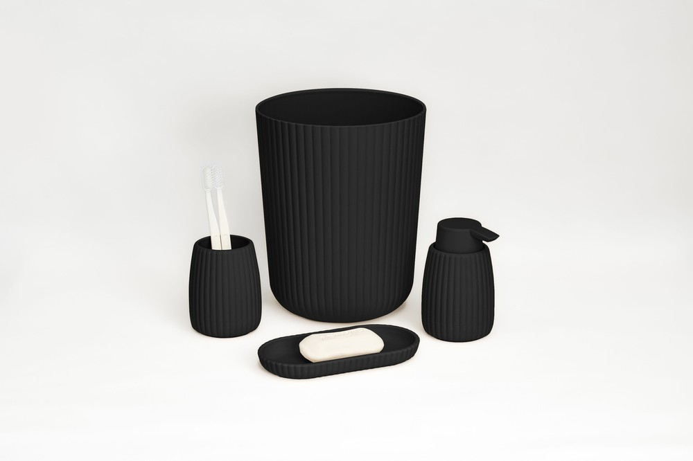 Transform your bathroom into a stylish oasis with the Mainstays Rubberized Plastic Ribbed Bathroom Set. This 4-piece ensemble blends sleek design with practicality, elevating your sink or countertop effortlessly. The ribbed toothbrush holder offers a spacious and secure spot for toothbrushes and other essentials, while its rubberized surface ensures stability and durability. The 1.64-gallon black wastebasket efficiently manages daily waste, adding a subtle texture to your space. Enhance your handwashing experience with the ribbed soap pump, which delivers the perfect amount of soap or lotion with each press, available in four neutral colors. Completing the set is the versatile accessory tray, perfect for organizing your soap pump, toothbrush holder, jewelry, or makeup, while its modern design fits seamlessly into any bathroom decor. Available in four neutral colors, this set combines function and charm, giving your bathroom an instant upgrade. Durable and practical, this 4-piece set includes a toothbrush holder, wastebasket, soap pump, and accessory tray, blending seamlessly with any bathroom decor The set features a sleek, ribbed design that adds a contemporary touch to your bathroom decor while providing practical functionality. This item offers ample space to store toothbrushes, hairbrushes, and other small essentials. The rubberized surface prevents slipping and enhances grip, making it a practical and stylish storage solution. Durable Construction: Crafted from high-quality rubberized plastic, each item in the set is designed for durability and long-lasting use in your bathroom.