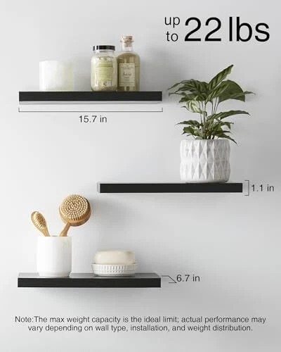 Required Assembly: Yes Brand: Does Not Apply Style Name: Country Rustic Size: 16inches Item Dimensions D x W x H: 6.7"D x 16"W x 1.1"H Mounting Type: Wall Mount Back Style: Room decor,home decor Type: Does Not Apply Manufacturer: Does Not Apply UPC: 810070842826 Item Width: 1 Shelf Type: Engineered Wood Product Care Instructions: Avoid soaking rustic wood floating shelves with water. Recommended Uses For Product: Perfect for enhancing offices, bathrooms, kitchens, living rooms, Installation Method: Wall Mount Item Weight: 5 Pounds Furniture Finish: black Finish Types: Matte Additional Features: Wall mouted, hidden brackets, Easy to install, Bathroom organizer Item Length: 1 Material Type: Engineered Wood Unit Count: 1.0 Count gtin13: Does Not Apply Built In Media: 3 metal brackets, 15 wall anchors, 15 big screws, 3 wooden boards Specific Uses For Product: Versatile for Every Space Decor - offices, bathrooms, kitchens, l Age Range Description: no limit Number of Shelves: 3 Product Dimensions: 6.7"D x 16"W x 1.1"H Weight Capacity Maximum: 22 Pounds Shelf Thickness: 1.1 Inches Model: FSD3V105 Item Height: 1 Special Feature: Wall mouted, hidden brackets, Easy to install, Bathroom organizer Number of Items: 3 Product Name: bedroom shelves,bedroom shelves for wall,, bathroom floating shel Finish Type: Matte Weight Capacity: Maximum weight: 22 Pounds EAN: Does Not Apply Color: Black Shape: Rectangular Room Type: Office, Bathroom, Kitchen, Bedroom, Living Room Style: Country Rustic MPN: Does Not Apply Model Name: FSD3V105