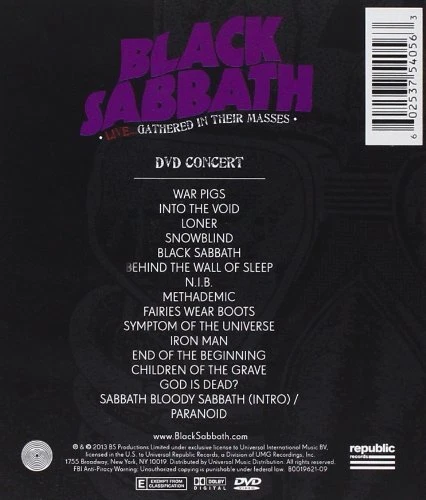 Genre:Heavy MetalType:Does not applyMovie/TV Title:Black Sabbath Live: Gathered in Their MassesFormat:DVDSub-Genre:Music Video (Concert/Performance)Package Dimensions LxWxH:6.81x5.24x0.55 InchesWeight:0.04 PoundsBrand:UNIVERSAL MUSIC GROUPUPC:0602537540563ISBN:0602537540563Studio:Republic Recordsgtin13:0602537540563EAN:0602537540563