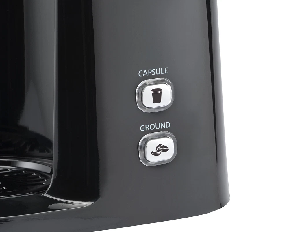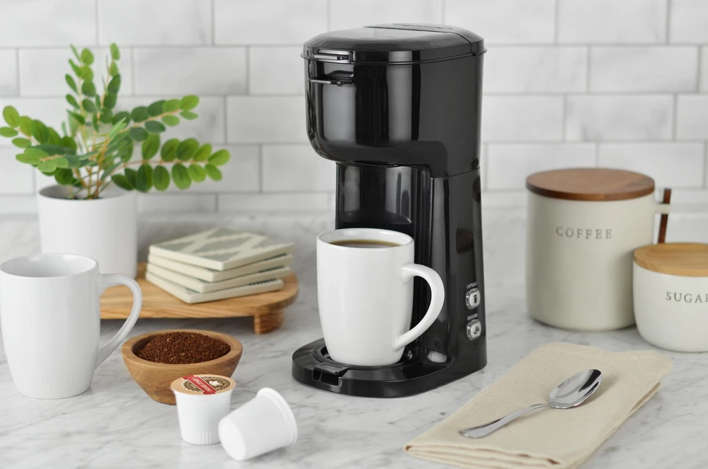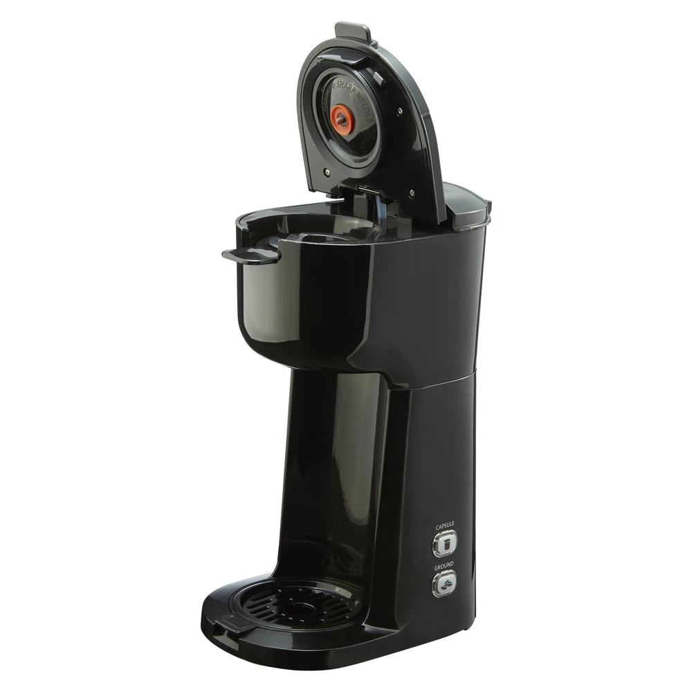 Custom Coffee in Minutes Dual Brew: Compatible with ground coffee or K-cups. 14 oz Reservoir: Holds 1.75 cups for multiple brews. Removable Drip Tray: Accommodates standard and travel mugs, easy to clean. Auto Shutoff: Automatically turns off after brewing. Compact Design: Space-saving and lightweight. Stylish Finish: Modern polished black plastic. Condition: New