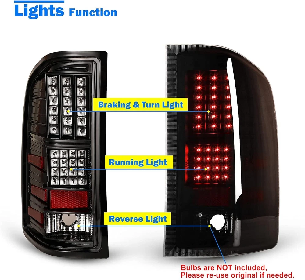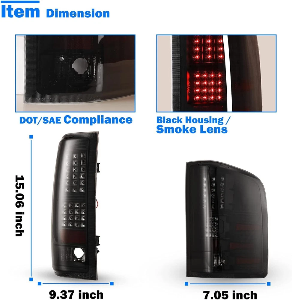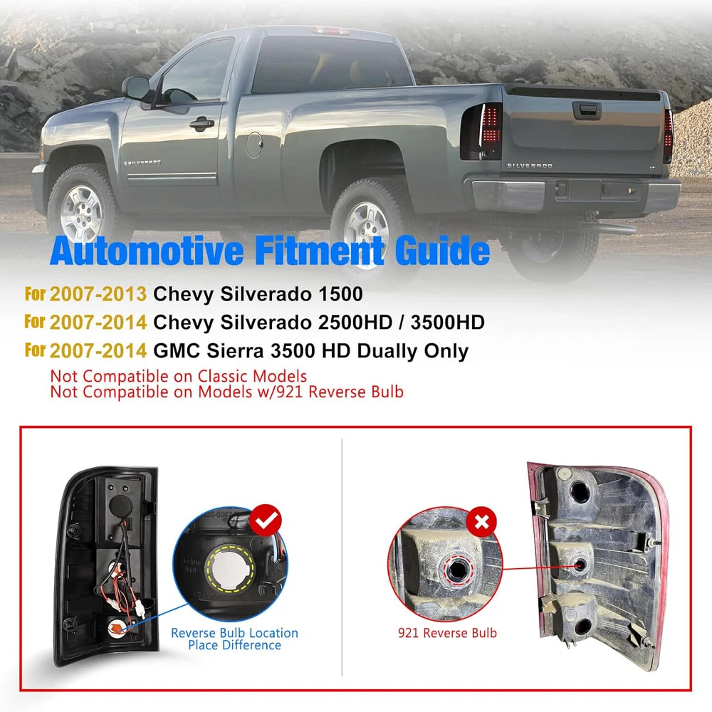 Black Smoke 2007-2013 Chevy Silverado 1500 2500 LED Tube Tail Lights Brake Lamps Product Description Installation video for 2007-2013 Chevy Silverado 1500 2500HD 3500HD Tail Lights Easily Installation - A complete installation video for your reference How To Install LED Tail Lights For 2007-2013 Chevy Silverado 1500 2500HD 3500HD οΌ Video will open in a new window Using the mobile app? Copy this link into your browser: Specification Running/Brake/Turn Signal Light Bulbs: Integrated LED Reversing Light Bulbs: Not included (Please use the stock bulbs or the original lights of car) Wiring Harness: Not Included Color Finish: Black Housing / Smoke Lens Replaces Original (OE) Part #: L: 25958482 R: 25958483 Partslink: L: GM2800207 R: GM2801207 Fitment 2008-2013 Chevy Silverado 1500 2008-2014 Chevy Silverado 2500HD / 3500HD 2007 Chevy Silverado 1500/ 2500/ 3500 New Body β οΈ β»NOTES: Fits Models with 3047 Reverse Light Bulb ONLY. NOT Compatible with 2007 Classic Models; NOT Compatible with 2010-2011 Silverado with 921 Reverse Backup Bulbs. Package Includes 1 Pair of LED Taillights (Left and Right Side) After-sales Service 1 year manufacturer warranty. 60-Day return policy. Please check the fitment in the description to see whether the item will fit for your vehicle or not before purchasing. If you are not sure, please feel free to contact us by eBay messages to help you verify the fitment. Payment Delivery details Terms of sales About us Contact us Payment π We accept PayPal (Recommended), credit card, VISA, Google Pay & Discover etc. π Please submit your payment within 7 days after your purchase. π If not, eBay will automatically open an Unpaid Item Dispute on our behalf if the item(s) are not paid within 7 days. Delivery details π Please double check your delivery address and contact information. π All items will be shipped within 1 business days after payment received. π Tracking numbers will be easily accessible ASAP they are created and processed. Terms of sales π Free 30 days Return, we will cover the return post fee. π If a defective product was received, please do not hesitate to message us via eBay message. π We will response in 24 hours in business to resolve the problem π We stand behind our products. Items can be returned for exchange or full refund within 30 days from the date you receive. About us π Wolfstorm has a huge warehouse and office located in the United States. π All US domestic 48 states customers are able to benefit from the FREE SHIPPING services. π Our experienced, professional customer service representatives offers prompt and courteous service. π Best quality products, outstanding services and professional experience keep our customers. Contact us π Please feel free to contact us if you have any problems. π Emails will be replied within 24 hours in working days. π After hours emails will be replied on the next business day. On Dec 30, 2024 at 23:11:54 PST, seller added the following information: