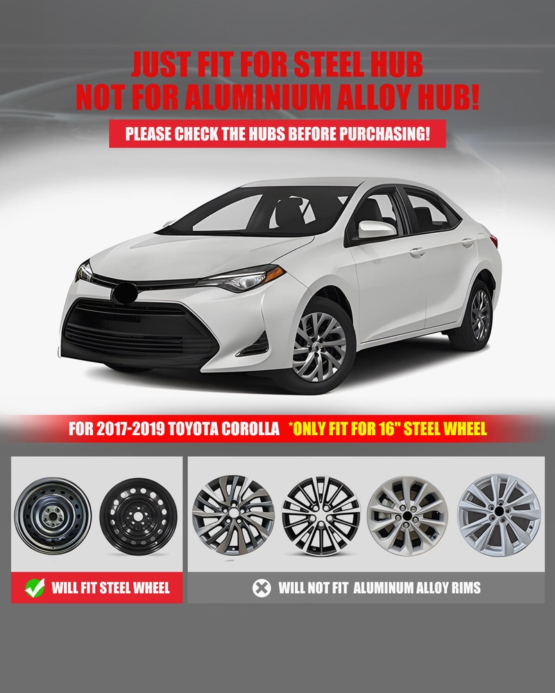 Store Categories Other Car Refrigerator Front Bumper Rear Bumper Fender Flares Inner Fenders Side Steps Running Board A-Pillar Light Mount Brackets Headlights Taillights Fog Lights LED Headlights LED Taillights LED Fog Lights Jeep Chevrolet Ford Toyota Dodge GMC Wheel Covers Features ✴ PERFECT FIT: This wheel hub cap is specifically designed to perfectly fit for 16-inch wheels, ensuring a seamless match and enhanced aesthetics. It complements the overall design of the vehicle, elevating its visual appeal. ✴ HIGH-QUALITY MATERIAL: Constructed from high-quality materials, this wheel hub cap guarantees durability and longevity. It withstands various road conditions and environmental factors encountered during daily driving, maintaining its pristine condition. ✴ EASY INSTALLATION: Installing this wheel hub cap is a breeze and requires no specialized tools or modifications. It comes with a user-friendly system, allowing for a hassle-free installation process by following the provided instructions. ✴ PROTECTIVE FUNCTION: Besides its aesthetic appeal, this wheel hub cap serves as a protective barrier for the wheels. It prevents scratches and potential damage caused by stones, debris, or other objects, safeguarding the wheel's surface. ✴ AFTER-SALES SERVICE: If There Is a Loss of Product Parts, or Any Parts of The Problem, We Can Provide After-Sales Service, Please Contact Us on The Order Page. Wheel Covers Specification ✴ Type: Hub caps ✴ Number in Pack: 4 ✴ Color: Black Lacquer ✴ Material: ABS ✴ Compatible Wheel Diameter: 16 in ✴ Finish: Glossy ✴ Installation Type: Snap-On ✴ Model: For For 2009-2025 Toyota Corolla/2009-2014 Toyota Matrix Wheel Covers Package ✴ 1 Set of 4 Hub caps and 4 retention rings Payment Delivery details Terms of sales About us Contact us Payment We accept PayPal, credit card , Apple Pay & Google Pay etc. Delivery details All items will be shipped within 1-3 business days after payment received, we will try our best to ship out as soon as we can, hope for your understanding. Please double confirm your address and contact information, which will help the delivery faster and more accurately. Note :buyers who purchase international products need to pay import tariffs!!! Terms of sales Professional installation is highly recommended. Any problem of the item please feel free to contact us first , please D o Not leave negative feedback before that, or simply return it within 60 Days in original condition. We will resolve it for you ASAP. About us Any questions please do not hesitate to contact us directly by eBay message . We will reply you within 24 hours asap, thanks for your understanding. Contact us Should you have any problem or require any further information please feel free to contact us . If you are satisfied with our product and service, please kindly leave us a positive feedback. Popular Categories On Mar 14, 2025 at 20:24:12 PDT, seller added the following information: