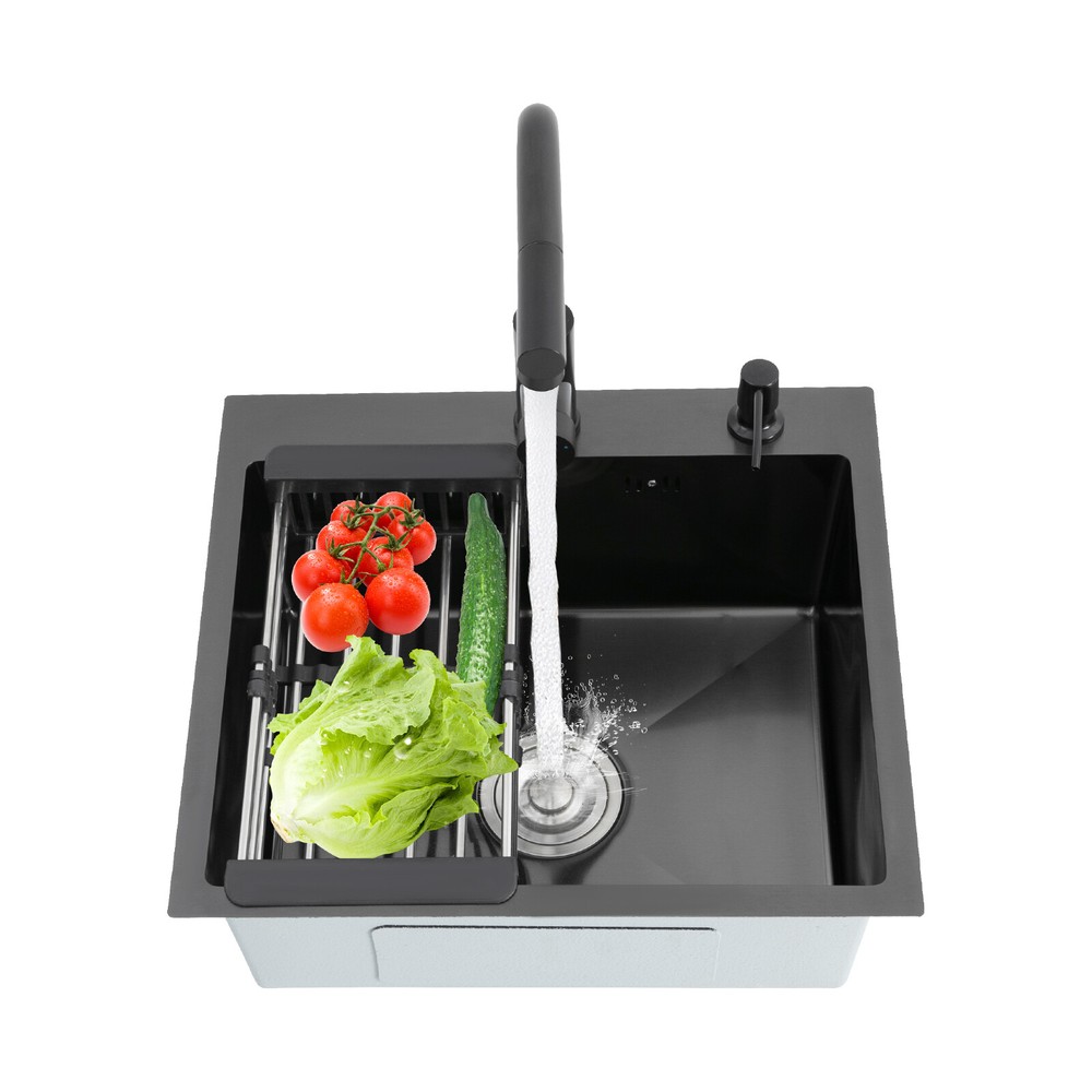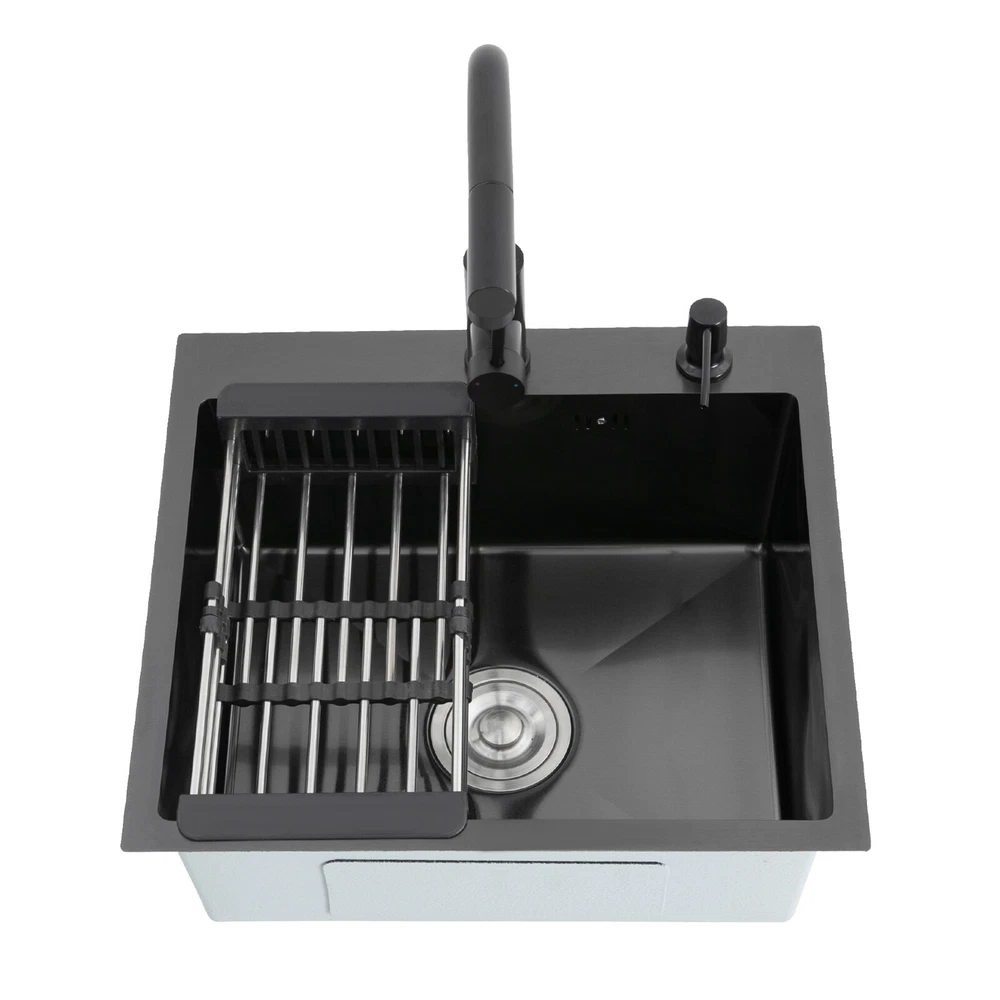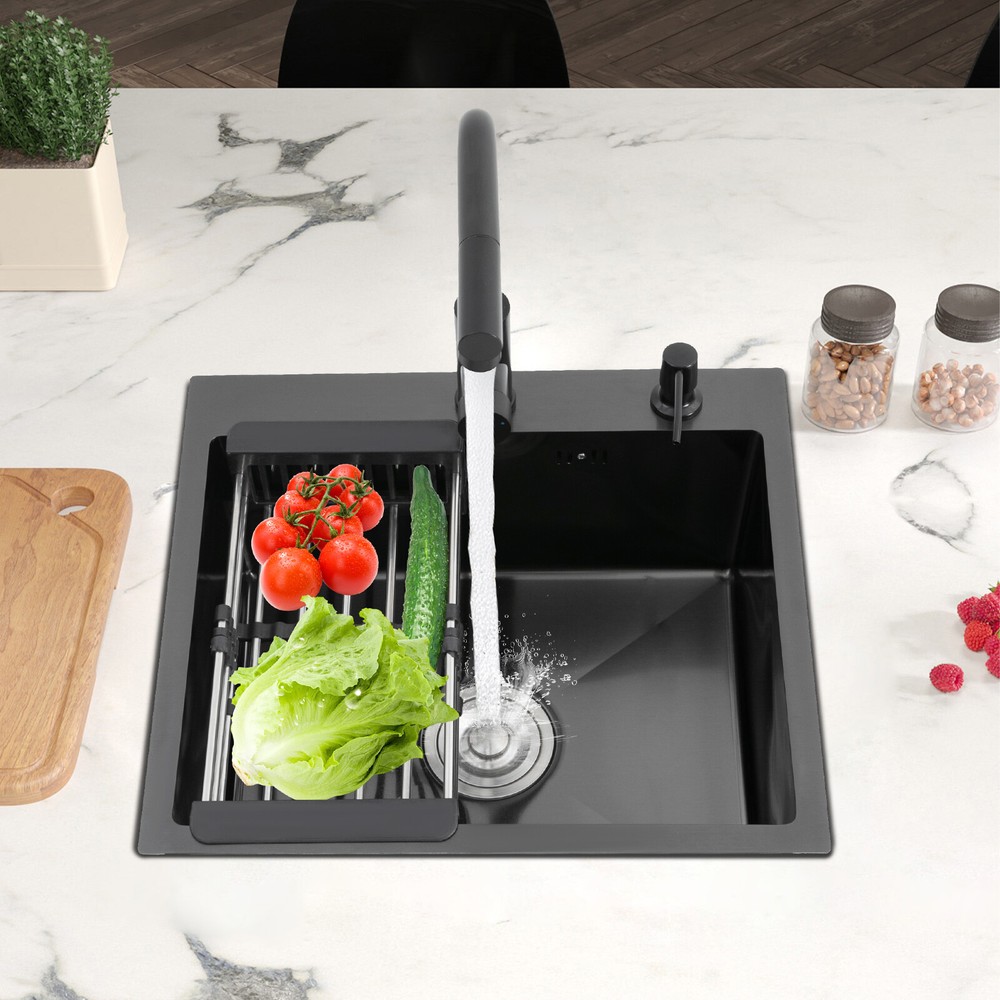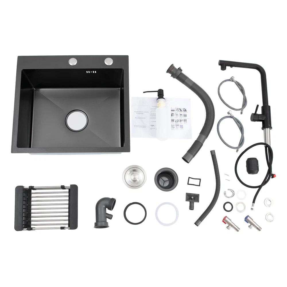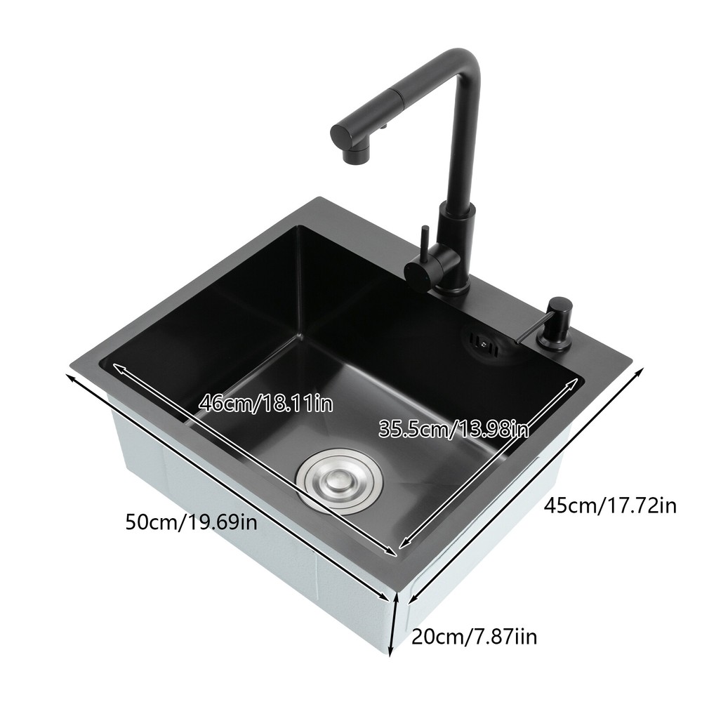 Kitchen Sink Stainless Steel Sink Sink Black Stainless Steel Built-in Sink w/Tap Welcome to our store! Description This 304 stainless steel kitchen sink adopts a nano-coating process, making it easy to clean and not easy to fade. Its enlarged and deepened sink not only alleviates splash problems but also improves space utilization and facilitates the cleaning of large quantities of cookware. The equipped draining basket allows for the convenient cleaning of fruits and vegetables. With it, you can enjoy a more convenient and healthier life. Key Features Build to Last: High-quality 304 stainless steel is not easy to rust, wear, and deform, and a 6-layer protective nano-coating prevents stains from adhering and enhances the sink's resistance to scratches and abrasion, making it hard to fade and reducing bacterial growth. Large Sink Size: It is large ( 18.11*13.98*7.87 inches) enough to accommodate multiple plates, dishes, and pots at once. Moreover, it prevents splashing when washing fruits and vegetables. Flexible Washing: The 360° rotatable pull-out faucet extends 23.62 inches to allow you to wash at different angles or flush the sink corners. You can switch its flush and shower water modes through the button on the spout and adjust the cold and hot water and water volume with the single handle. Humanized Design: The anti-condensation coating prevents condensation in the sink and thus prevents moisture in the kitchen cabinets. The soundproof mats on the surrounds and bottom reduce noise. Quick Drainage: It has X-shaped water guidelines and a high-performance drainer set for good drainage, effectively preventing water from accumulating inside. Complete Set: The combination of a sink and a range of accessories meets your needs in one go and is easy to install. In addition, we offer you a soap dispenser and a retractable draining basket to facilitate the draining of your dishes and allow for convenient hand washing. Easy Cleaning: Thanks to its smooth nano-coating surface, simple structure, R10 radius corners, and open design, you can easily wipe or rinse away grease and dirt on it without leaving a trace. Stylish Appearance: The modern, clean lines and elegant black color match all types of decor, making it a unique and beautiful addition to your kitchen while providing you with practical functionality. Ideal Gift: Its beautiful appearance and practical function make it an ideal housewarming gift for your friends, families, and colleagues. Details Overflow Holes: The overflow holes hidden in the sink wall prevent water from overflowing and wetting countertops and floors. Pre-drilled Holes: The reserved holes allow you to conveniently install the equipped soap dispenser and faucet. Smooth Edge: The rounded and smooth edges not only add to the aesthetics of the product but also improve the safety of use. Application This product can be widely used in homes, restaurants, laundry rooms, basements, bars, kitchens, food trucks, dessert shops, coffee shops, hotels, garages, etc. for cleaning tableware, vegetables, fruits, etc. Specification Color: Black Style: Modern Shape: Rectangular Material: 304 Stainless Steel Process: Nano-coating Assembly Required: Yes Mounting Type: Undermount, Topmount Faucet Pull-out Length: 60cm/23.62in Water Inlet Pipe Length: 60cm/23.62in Sink Size: 46*35.5*20 cm/ 18.11*13.98*7.87 in Product Size: 50*45 cm/ 19.69*17.72 in Package Size: 49*45*21.5 cm/ 19.29*17.72*8.46 in Gross Weight: 3.6kg/ 7.93lbs Net Weight: 3.3kg/ 7.28lbs Package Included 1* Kitchen Sink 1* Soap Dispenser 1* Drain Basket 1* Pull-out Faucet 1* Drainer Set 1* Multilingual Manual Other Accessories for Installation Notes Please check the size carefully before ordering. Please read the assembly instructions carefully before installation. We recommend installation by a professional. Please do not clean it with hard tools like steel wire balls for a longer service life. Please allow the slight color difference caused by the shooting light and the 1-3 cm error due to manual measurement, and make sure you do not mind before ordering. Welcome to bestwishes4y to purchase products, please feel free to contact us for any questions.?? Payment Delivery details Terms of sales About us Contact us Payment We accept ebay payment 。 Fees such as import duties, taxes are not included in the item price or shipping costs. These charges are the buyer's responsibility. Delivery details Shipping: 2-9 working days to: USA Terms of sales We maintain high standards of excellence and strive for hundred percent customer satisfaction. Feedback is very important to us. We hope that you contact us immediately before you give neutral or negative feedback, so that we can address your concerns. It is impossible to address issues if we do not know about them! About us Your satis faction is our ultimate goal. We work hard to earn your trust and future business. Our certified technicians have tested each item before shipping. The unit comes with 1 year limited warranty on all manufacturing defects. a) If you receive a defective item, you may return it or ask for a discount. Please contact us within 14 days after you receive the package. b) What you returned must be intact and in its original packaging as re? u. Customer is responsible for shipping costs of the returned item. c) We will cover the cost of shipping back t with the shipping rate indicated in the registration page. We will send you a new unit or refund the full payment you paid. Thank you. Contact us Business Hour Business Hour: Monday To Friday: 8:30 AM to 5:00 PM (Beijing China time) Due to time zones, our reply to your questions may not be immediately. But within above working time, we will reply your email within 24 hours. If it's non-workdays, please kindly be patient and wait till Monday. Please contact us with ebay message. Please feel free to contact us if you have any questions. Monday To Friday: 8:30 AM to 5:00 PM (Beijing China time) Due to time zones, our reply 