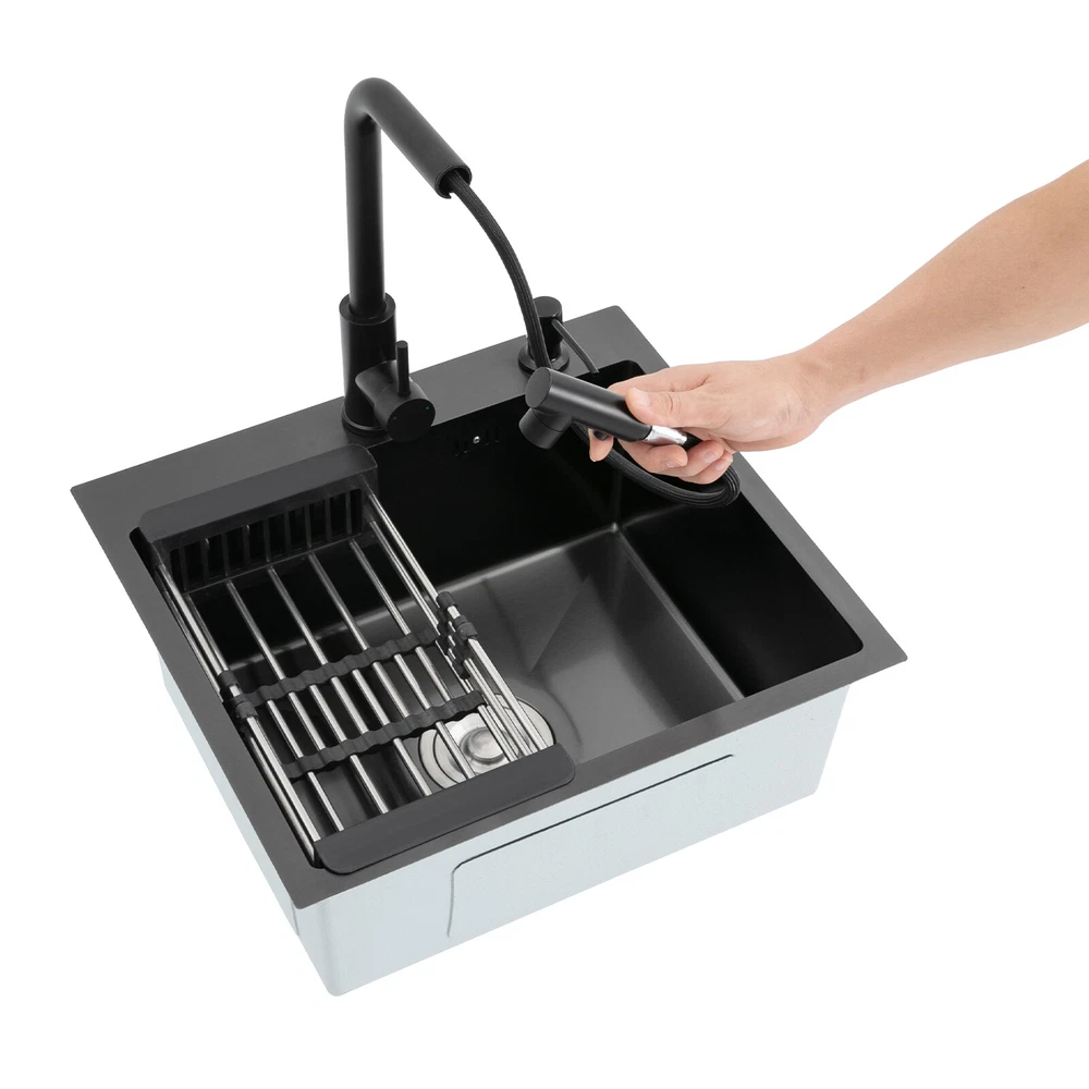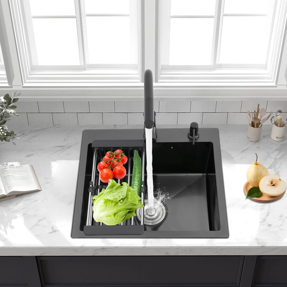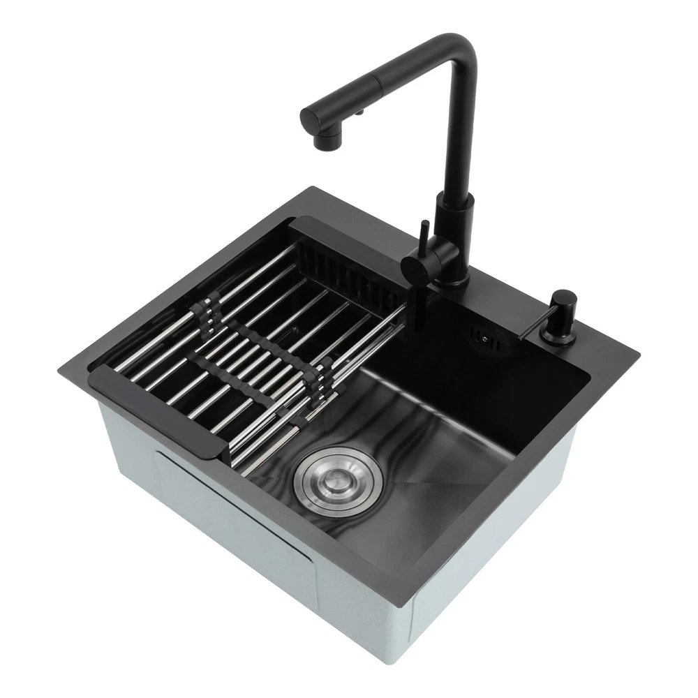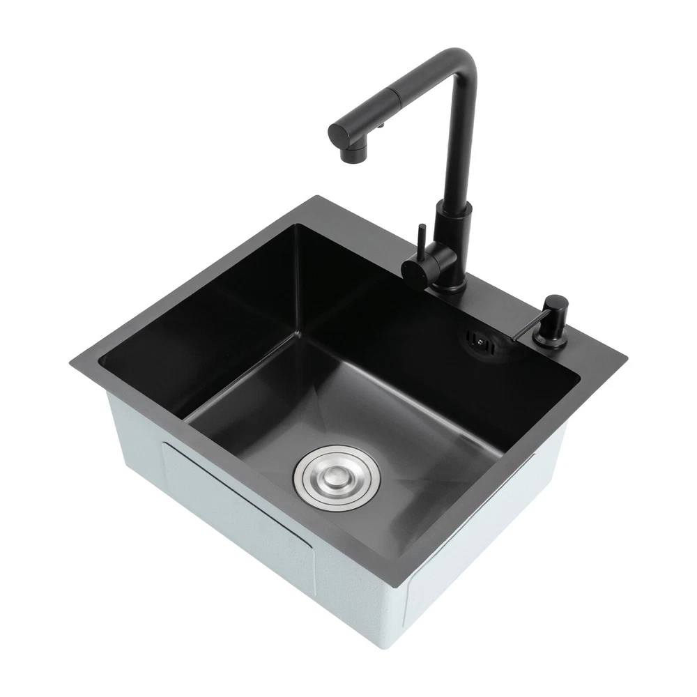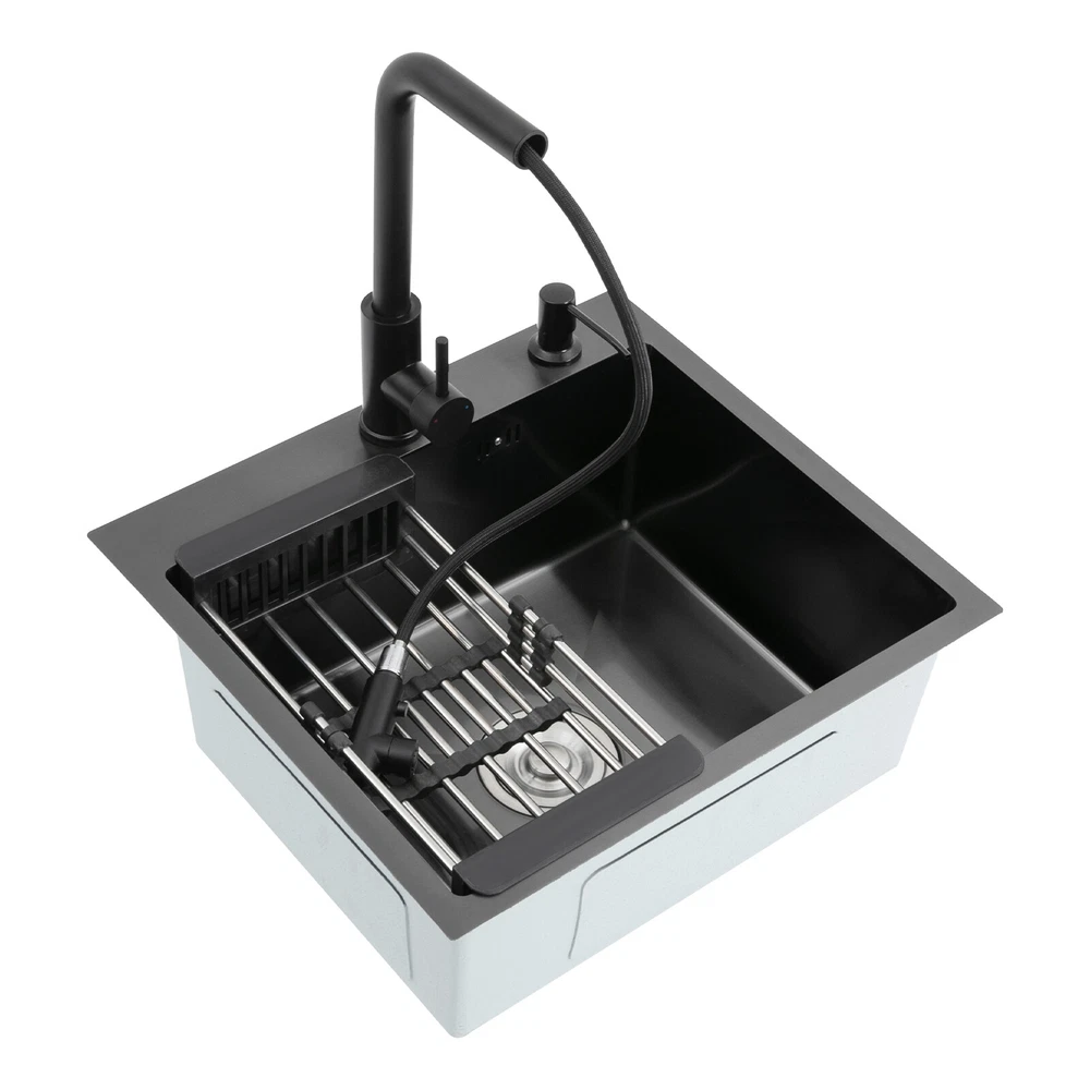 Kitchen Sink Stainless Steel Sink Sink Black Stainless Steel Built-in Sink w/Tap Welcome to our store! Description This 304 stainless steel kitchen sink adopts a nano-coating process, making it easy to clean and not easy to fade. Its enlarged and deepened sink not only alleviates splash problems but also improves space utilization and facilitates the cleaning of large quantities of cookware. The equipped draining basket allows for the convenient cleaning of fruits and vegetables. With it, you can enjoy a more convenient and healthier life. Key Features Build to Last: High-quality 304 stainless steel is not easy to rust, wear, and deform, and a 6-layer protective nano-coating prevents stains from adhering and enhances the sink's resistance to scratches and abrasion, making it hard to fade and reducing bacterial growth. Large Sink Size: It is large ( 18.11*13.98*7.87 inches) enough to accommodate multiple plates, dishes, and pots at once. Moreover, it prevents splashing when washing fruits and vegetables. Flexible Washing: The 360° rotatable pull-out faucet extends 23.62 inches to allow you to wash at different angles or flush the sink corners. You can switch its flush and shower water modes through the button on the spout and adjust the cold and hot water and water volume with the single handle. Humanized Design: The anti-condensation coating prevents condensation in the sink and thus prevents moisture in the kitchen cabinets. The soundproof mats on the surrounds and bottom reduce noise. Quick Drainage: It has X-shaped water guidelines and a high-performance drainer set for good drainage, effectively preventing water from accumulating inside. Complete Set: The combination of a sink and a range of accessories meets your needs in one go and is easy to install. In addition, we offer you a soap dispenser and a retractable draining basket to facilitate the draining of your dishes and allow for convenient hand washing. Easy Cleaning: Thanks to its smooth nano-coating surface, simple structure, R10 radius corners, and open design, you can easily wipe or rinse away grease and dirt on it without leaving a trace. Stylish Appearance: The modern, clean lines and elegant black color match all types of decor, making it a unique and beautiful addition to your kitchen while providing you with practical functionality. Ideal Gift: Its beautiful appearance and practical function make it an ideal housewarming gift for your friends, families, and colleagues. Details Overflow Holes: The overflow holes hidden in the sink wall prevent water from overflowing and wetting countertops and floors. Pre-drilled Holes: The reserved holes allow you to conveniently install the equipped soap dispenser and faucet. Smooth Edge: The rounded and smooth edges not only add to the aesthetics of the product but also improve the safety of use. Application This product can be widely used in homes, restaurants, laundry rooms, basements, bars, kitchens, food trucks, dessert shops, coffee shops, hotels, garages, etc. for cleaning tableware, vegetables, fruits, etc. Specification Color: Black Style: Modern Shape: Rectangular Material: 304 Stainless Steel Process: Nano-coating Assembly Required: Yes Mounting Type: Undermount, Topmount Faucet Pull-out Length: 60cm/23.62in Water Inlet Pipe Length: 60cm/23.62in Sink Size: 46*35.5*20 cm/ 18.11*13.98*7.87 in Product Size: 50*45 cm/ 19.69*17.72 in Package Size: 49*45*21.5 cm/ 19.29*17.72*8.46 in Gross Weight: 3.6kg/ 7.93lbs Net Weight: 3.3kg/ 7.28lbs Package Included 1* Kitchen Sink 1* Soap Dispenser 1* Drain Basket 1* Pull-out Faucet 1* Drainer Set 1* Multilingual Manual Other Accessories for Installation Notes Please check the size carefully before ordering. Please read the assembly instructions carefully before installation. We recommend installation by a professional. Please do not clean it with hard tools like steel wire balls for a longer service life. Please allow the slight color difference caused by the shooting light and the 1-3 cm error due to manual measurement, and make sure you do not mind before ordering. Welcome to bestwishes4y to purchase products, please feel free to contact us for any questions.?? Payment Delivery details Terms of sales About us Contact us Payment We accept ebay payment 。 Fees such as import duties, taxes are not included in the item price or shipping costs. These charges are the buyer's responsibility. Delivery details Shipping: 2-9 working days to: USA Terms of sales We maintain high standards of excellence and strive for hundred percent customer satisfaction. Feedback is very important to us. We hope that you contact us immediately before you give neutral or negative feedback, so that we can address your concerns. It is impossible to address issues if we do not know about them! About us Your satis faction is our ultimate goal. We work hard to earn your trust and future business. Our certified technicians have tested each item before shipping. The unit comes with 1 year limited warranty on all manufacturing defects. a) If you receive a defective item, you may return it or ask for a discount. Please contact us within 14 days after you receive the package. b) What you returned must be intact and in its original packaging as re? u. Customer is responsible for shipping costs of the returned item. c) We will cover the cost of shipping back t with the shipping rate indicated in the registration page. We will send you a new unit or refund the full payment you paid. Thank you. Contact us Business Hour Business Hour: Monday To Friday: 8:30 AM to 5:00 PM (Beijing China time) Due to time zones, our reply to your questions may not be immediately. But within above working time, we will reply your email within 24 hours. If it's non-workdays, please kindly be patient and wait till Monday. Please contact us with ebay message. Please feel free to contact us if you have any questions. Monday To Friday: 8:30 AM to 5:00 PM (Beijing China time) Due to time zones, our reply 
