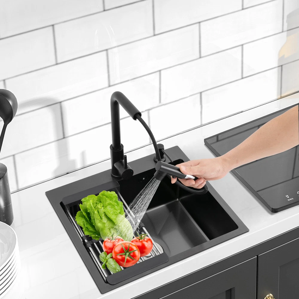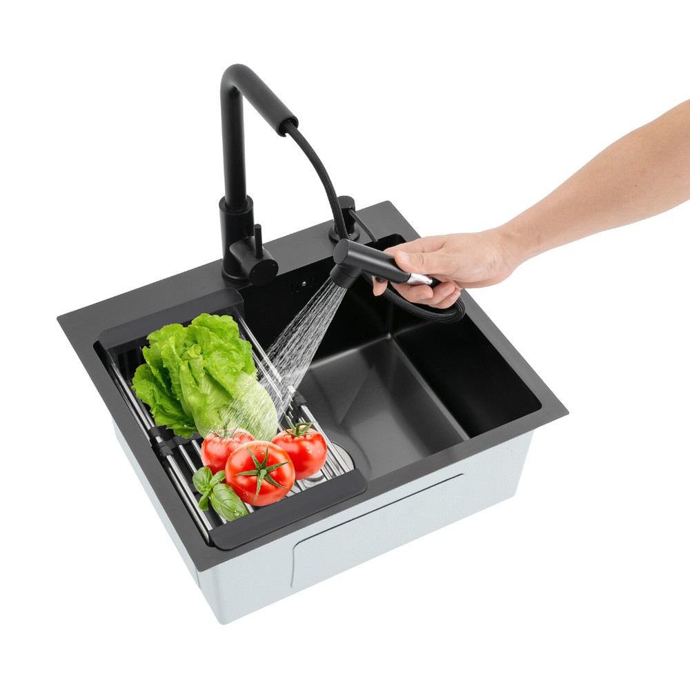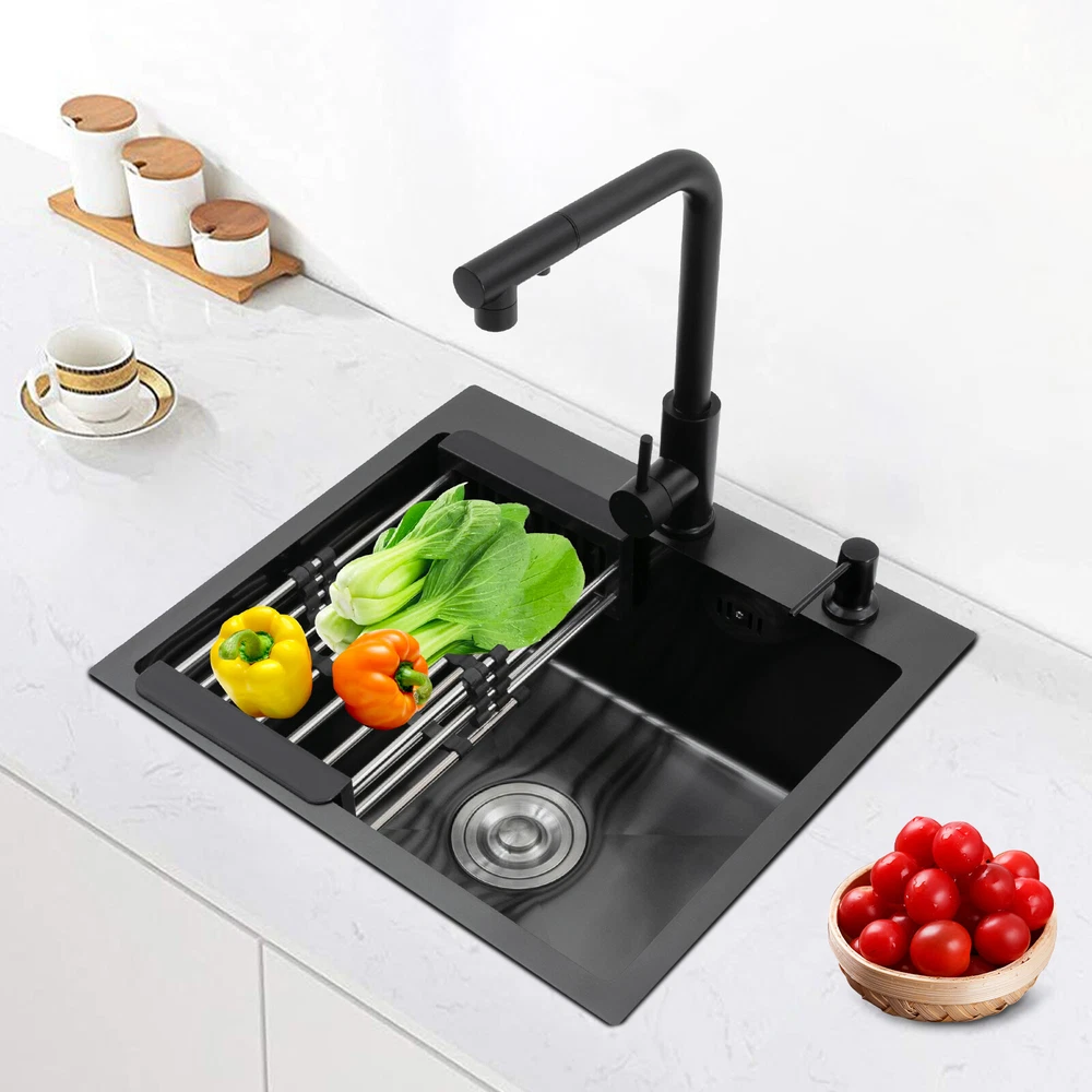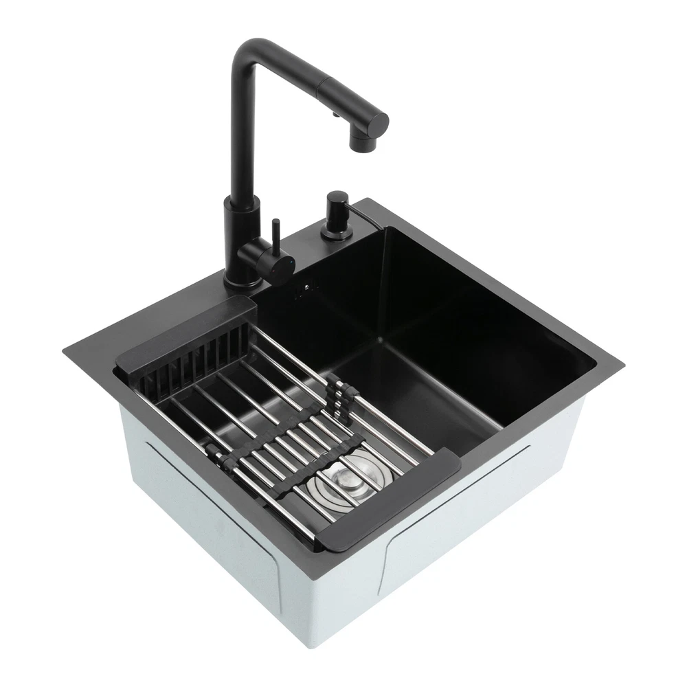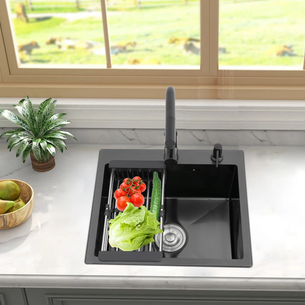 Kitchen Sink Stainless Steel Sink Sink Black Stainless Steel Built-in Sink w/Tap Welcome to our store! Description This 304 stainless steel kitchen sink adopts a nano-coating process, making it easy to clean and not easy to fade. Its enlarged and deepened sink not only alleviates splash problems but also improves space utilization and facilitates the cleaning of large quantities of cookware. The equipped draining basket allows for the convenient cleaning of fruits and vegetables. With it, you can enjoy a more convenient and healthier life. Key Features Build to Last: High-quality 304 stainless steel is not easy to rust, wear, and deform, and a 6-layer protective nano-coating prevents stains from adhering and enhances the sink's resistance to scratches and abrasion, making it hard to fade and reducing bacterial growth. Large Sink Size: It is large ( 18.11*13.98*7.87 inches) enough to accommodate multiple plates, dishes, and pots at once. Moreover, it prevents splashing when washing fruits and vegetables. Flexible Washing: The 360° rotatable pull-out faucet extends 23.62 inches to allow you to wash at different angles or flush the sink corners. You can switch its flush and shower water modes through the button on the spout and adjust the cold and hot water and water volume with the single handle. Humanized Design: The anti-condensation coating prevents condensation in the sink and thus prevents moisture in the kitchen cabinets. The soundproof mats on the surrounds and bottom reduce noise. Quick Drainage: It has X-shaped water guidelines and a high-performance drainer set for good drainage, effectively preventing water from accumulating inside. Complete Set: The combination of a sink and a range of accessories meets your needs in one go and is easy to install. In addition, we offer you a soap dispenser and a retractable draining basket to facilitate the draining of your dishes and allow for convenient hand washing. Easy Cleaning: Thanks to its smooth nano-coating surface, simple structure, R10 radius corners, and open design, you can easily wipe or rinse away grease and dirt on it without leaving a trace. Stylish Appearance: The modern, clean lines and elegant black color match all types of decor, making it a unique and beautiful addition to your kitchen while providing you with practical functionality. Ideal Gift: Its beautiful appearance and practical function make it an ideal housewarming gift for your friends, families, and colleagues. Details Overflow Holes: The overflow holes hidden in the sink wall prevent water from overflowing and wetting countertops and floors. Pre-drilled Holes: The reserved holes allow you to conveniently install the equipped soap dispenser and faucet. Smooth Edge: The rounded and smooth edges not only add to the aesthetics of the product but also improve the safety of use. Application This product can be widely used in homes, restaurants, laundry rooms, basements, bars, kitchens, food trucks, dessert shops, coffee shops, hotels, garages, etc. for cleaning tableware, vegetables, fruits, etc. Specification Color: Black Style: Modern Shape: Rectangular Material: 304 Stainless Steel Process: Nano-coating Assembly Required: Yes Mounting Type: Undermount, Topmount Faucet Pull-out Length: 60cm/23.62in Water Inlet Pipe Length: 60cm/23.62in Sink Size: 46*35.5*20 cm/ 18.11*13.98*7.87 in Product Size: 50*45 cm/ 19.69*17.72 in Package Size: 49*45*21.5 cm/ 19.29*17.72*8.46 in Gross Weight: 3.6kg/ 7.93lbs Net Weight: 3.3kg/ 7.28lbs Package Included 1* Kitchen Sink 1* Soap Dispenser 1* Drain Basket 1* Pull-out Faucet 1* Drainer Set 1* Multilingual Manual Other Accessories for Installation Notes Please check the size carefully before ordering. Please read the assembly instructions carefully before installation. We recommend installation by a professional. Please do not clean it with hard tools like steel wire balls for a longer service life. Please allow the slight color difference caused by the shooting light and the 1-3 cm error due to manual measurement, and make sure you do not mind before ordering. Welcome to bestwishes4y to purchase products, please feel free to contact us for any questions.?? Payment Delivery details Terms of sales About us Contact us Payment We accept ebay payment 。 Fees such as import duties, taxes are not included in the item price or shipping costs. These charges are the buyer's responsibility. Delivery details Shipping: 2-9 working days to: USA Terms of sales We maintain high standards of excellence and strive for hundred percent customer satisfaction. Feedback is very important to us. We hope that you contact us immediately before you give neutral or negative feedback, so that we can address your concerns. It is impossible to address issues if we do not know about them! About us Your satis faction is our ultimate goal. We work hard to earn your trust and future business. Our certified technicians have tested each item before shipping. The unit comes with 1 year limited warranty on all manufacturing defects. a) If you receive a defective item, you may return it or ask for a discount. Please contact us within 14 days after you receive the package. b) What you returned must be intact and in its original packaging as re? u. Customer is responsible for shipping costs of the returned item. c) We will cover the cost of shipping back t with the shipping rate indicated in the registration page. We will send you a new unit or refund the full payment you paid. Thank you. Contact us Business Hour Business Hour: Monday To Friday: 8:30 AM to 5:00 PM (Beijing China time) Due to time zones, our reply to your questions may not be immediately. But within above working time, we will reply your email within 24 hours. If it's non-workdays, please kindly be patient and wait till Monday. Please contact us with ebay message. Please feel free to contact us if you have any questions. Monday To Friday: 8:30 AM to 5:00 PM (Beijing China time) Due to time zones, our reply 
