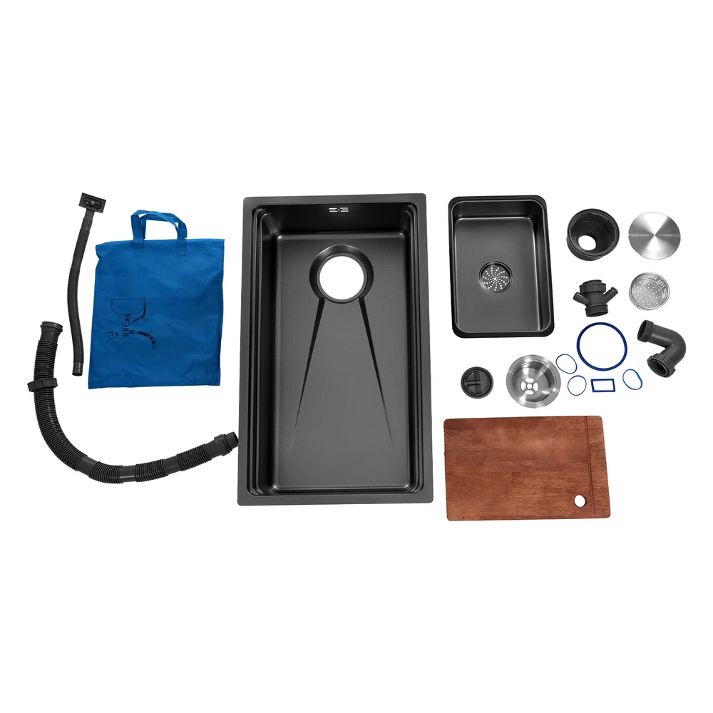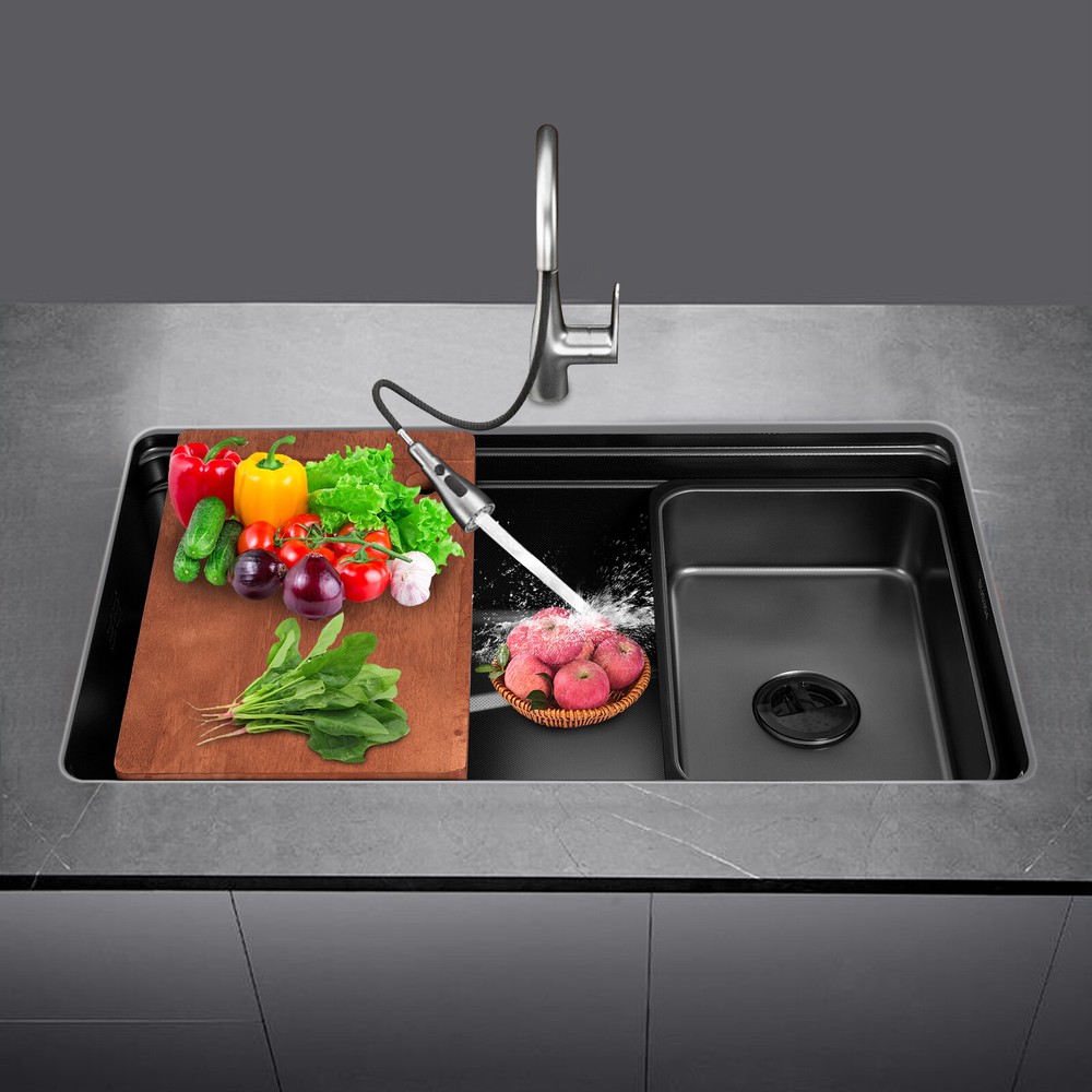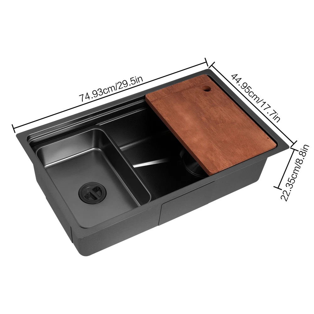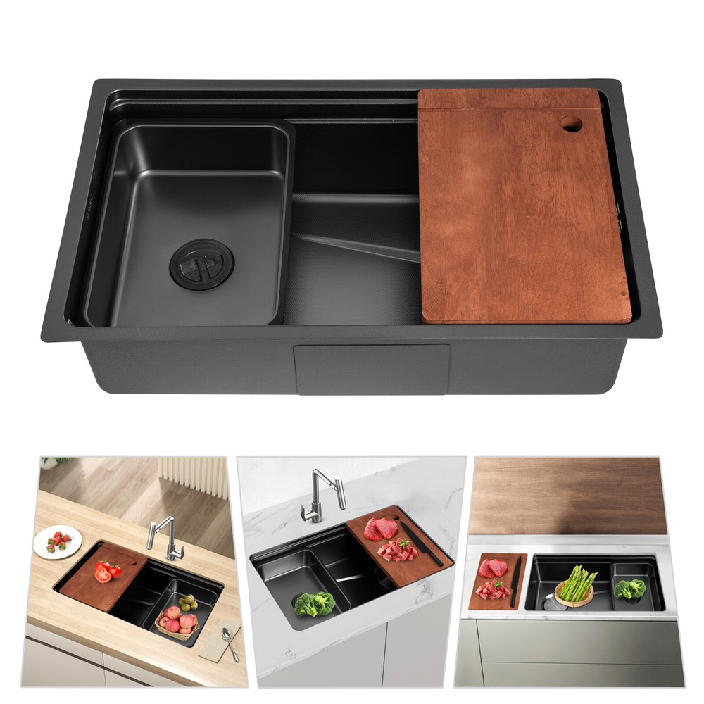 Black Large Capacity Stainless Steel Drop in Kitchen Sink with Chopping Board Description What if there is not enough space in the kitchen sink? What do you do if the sink is always clogged and can't be cleaned all the time? Then I suggest taking a look at our kitchen sink with excellent material and easy cleaning features, which can easily solve the above problems and help you to create a more tidy kitchen. Key Features Last and Durable: Made of 304 stainless steel with a one-piece stretching process, it is not easy to fade, and can resist wear, corrosion, rust, impact, and deformation, so it can keep beautiful and practical indoors and outdoors . Thoughtful Design: The sloped bottom with a large drainage hole and V-shaped flow line allows water to flow to the drain promptly so that water does not accumulate at the bottom of the basin. In addition, the sound-absorbing rubber mat can effectively reduce the impact of water flow as well as reduce noise. The environmentally-friendly anti-vapour condensation spraying at the bottom prevents dripping and condensation, keeps the sink dry and avoids the deformation of the cabinet by moisture. Kitchen Assistant: Our product comes with a chopping board with a round hole for easy chopping; in addition, the removable inner basin makes it easy for you to clean your veggies, fruits, and more. The inner basin with a drain can be drained directly, which is convenient for you to use. Large Capacity: A large and deep (8.8-inch) sink provides enough space for cleaning, storage, and preparation for your daily use. Space Saving: The compact size (29.5*17.7*8.8 inches) and under-counter installation feature can save your kitchen counter space, creating a more convenient kitchen environment for you. Easy to Clean: Thanks to its smooth surface and simple construction, you can rinse and wipe with water at the same time, thus making it easy to clean. The R-shaped round corner of the basin eliminates the dead corner of dirt accumulation for easy cleaning. Complete Accessories: The combination of sink, hoses, chopping board, etc. can meet your various needs at once and also save you money. Quality Service: We stand behind all our guests and look forward to assisting you with your purchase. It is our pleasure to answer your confusion and questions. The end of the story between us is definitely not "we sell and you buy" Details Practical Hoses: They can help with smoother drainage . Well-designed Overflow Holes: They allow you to say goodbye to water spills and keep your kitchen as clean as possible. Filter Basket and Lid: Filter basket intercepts food scraps for easy disposal and prevents clogging. The lid helps block odors. Double-step Design: It allows you to easily place chopping board and drying rack. Application It can be suitable for quick use in commercial kitchens, but also widely used in homes, bathrooms, farms, backyards, garages, balconies, laundry rooms, indoor and outdoor, restaurants, bars, hotels, cafes, etc. It can be mounted either way above or below the counter top. Specification Style: Modern Color: Black Shape: Rectangular Drain Type: Grid Material: 304 Stainless Steel and Rubber Surface Treatment: One-piece Stretching Mounting Type: Above or Below the Counter Top Gross Weight: 11kg/24.25lbs Net Weight: 10.3kg/22.71lbs Package Size: 83*56*27cm/32.68*22.05*10.63in Product Size: 75*45*22.35cm/ 29.5*17.7*8.8 in Package Included 1* Kitchen Sink 1* Chopping Board 2* Hoses 1* Bag 1* Inner Basin Other Accessories for Assembly Notes Please measure the size of the sink in your home before purchase . Please note that this product does not include a faucet. Please allow the slight color difference caused by the shooting light and 1-3cm error due to manual measurement, and make sure you do not mind before ordering. Payment Delivery details Terms of sales About us Contact us Payment We accept ebay payment 。 Fees such as import duties, taxes are not included in the item price or shipping costs. These charges are the buyer's responsibility. Delivery details Shipping: 2-9 working days to: USA Terms of sales We maintain high standards of excellence and strive for hundred percent customer satisfaction. Feedback is very important to us. We hope that you contact us immediately before you give neutral or negative feedback, so that we can address your concerns. It is impossible to address issues if we do not know about them! About us Your satis faction is our ultimate goal. We work hard to earn your trust and future business. Our certified technicians have tested each item before shipping. The unit comes with 1 year limited warranty on all manufacturing defects. a) If you receive a defective item, you may return it or ask for a discount. Please contact us within 14 days after you receive the package. b) What you returned must be intact and in its original packaging as re? u. Customer is responsible for shipping costs of the returned item. c) We will cover the cost of shipping back t with the shipping rate indicated in the registration page. We will send you a new unit or refund the full payment you paid. Thank you. Contact us Business Hour Business Hour: Monday To Friday: 8:30 AM to 5:00 PM (Beijing China time) Due to time zones, our reply to your questions may not be immediately. But within above working time, we will reply your email within 24 hours. If it's non-workdays, please kindly be patient and wait till Monday. Please contact us with ebay message. Please feel free to contact us if you have any questions. Monday To Friday: 8:30 AM to 5:00 PM (Beijing China time) Due to time zones, our reply to your questions may not be immediately. But within above working time, we will reply your email within 24 hours. If it's non-workdays, please kindly be patient and wait till Monday. Please contact us with ebay message. Please feel free to contact us if you have any questions.