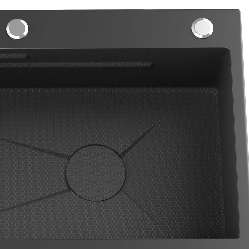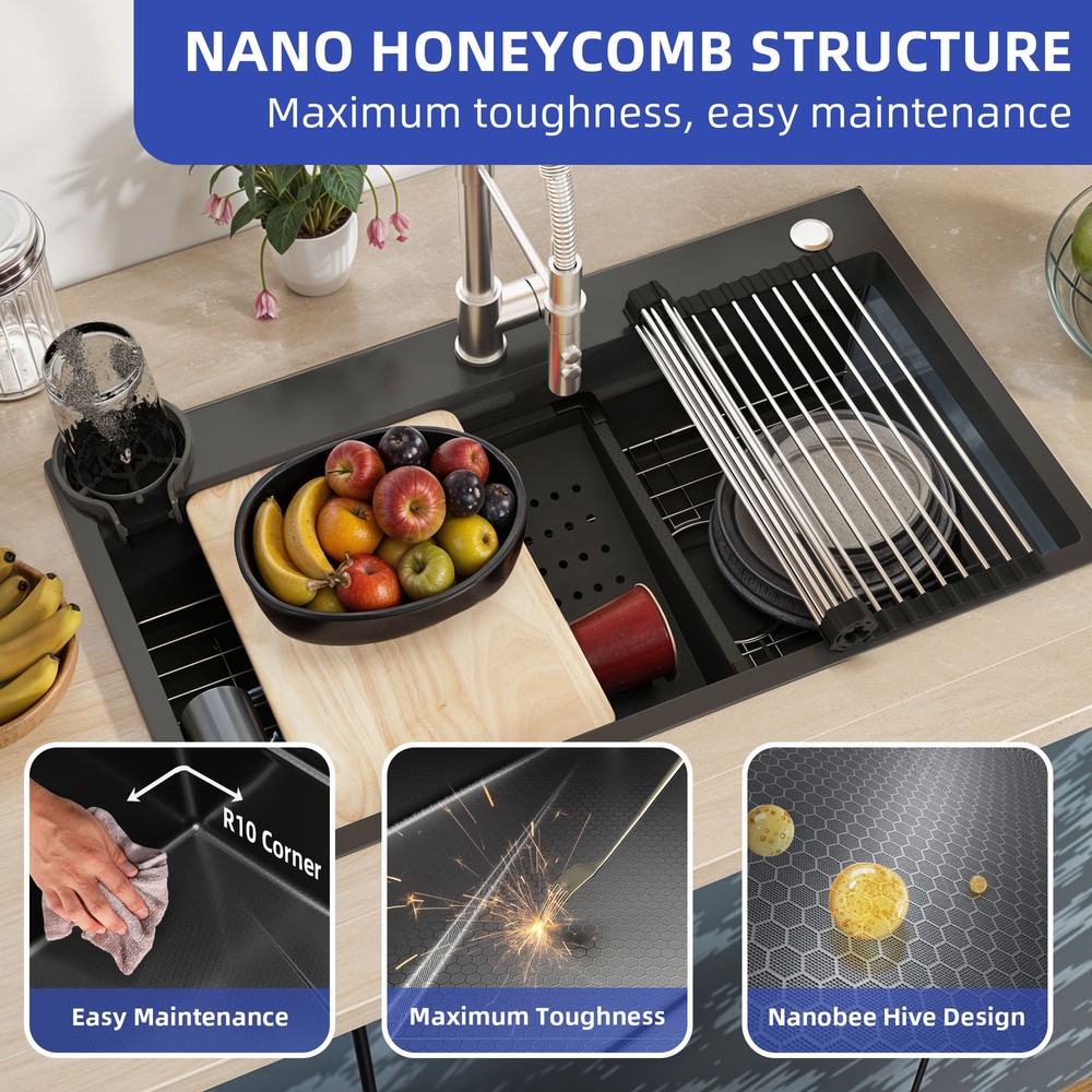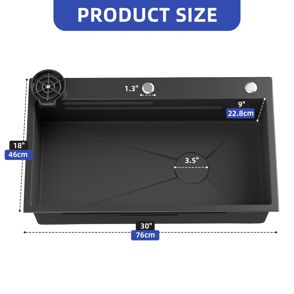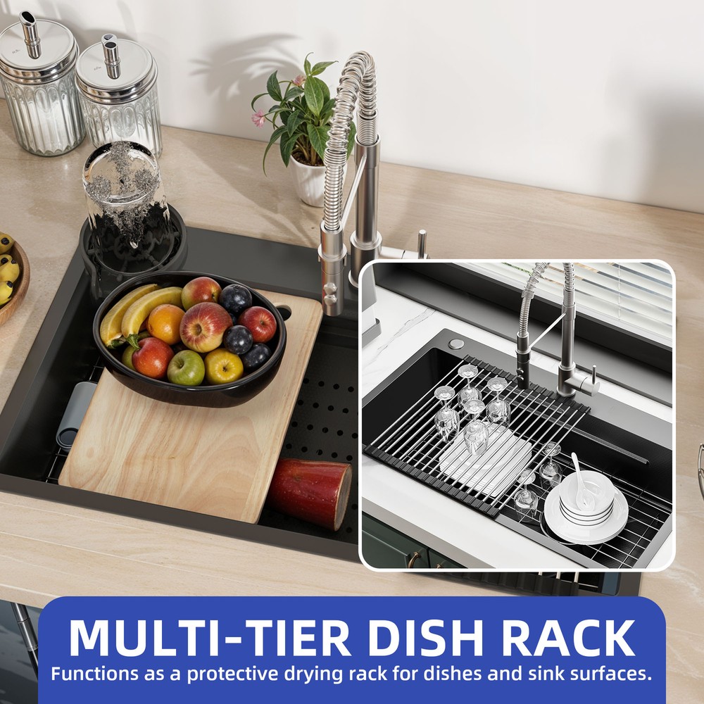 Kitchen Sink Black Stainless Steel Drop-in Multi-Tier Cutting Board Single Bowl Product Description NOTE: Professional Installation would be Highly Recommended. Description: 1. Color: Black 2. Material: Stainless Steel 3. Product Type: Kitchen Sink 4. Model: Drop-in 5. Shape: Rectangular 6. Drain Type: Grid 7. Style: 3 in 1 (Cutting, Washing, and Draining) 8. Recommendation Used: Home Kitchen, Commercial, Bar, RV's 9. Special Features: Drop-in/Topmount Design, Double Deck Track Design, Cutting Board, Movable Basin, Strainer Bowl, Filter Foods Scraps, Multi-Tier Dish Rack, Side Drainage System, Nano Honeycomb Structure Features: Premium Stainless Steel Kitchen Sink – The Ultimate Blend of Style, Function & Durability Effortless Cleaning with Smart Design: Keep your kitchen spotless with this easy-to-maintain stainless steel sink, featuring a 3mm edge and R10 rounded corners for quick, hassle-free cleaning. Its scratch-resistant stainless steel resists daily wear and tear, while the included cup washer simplifies post-meal cleanup—saving you time and effort with every use. Advanced Nano Coating for a Sleek & Durable Finish: Upgrade your kitchen aesthetics with the black PVD bronze finish and honeycomb surface treatment, offering superior scratch resistance and stain protection. The fingerprint-free, water-repellent coating ensures your sink stays pristine and polished with minimal maintenance—keeping your kitchen looking effortlessly elegant. Optimized Water Drainage & Easy Maintenance: No more standing water! The sloped bottom and offset drain promote smooth water flow, preventing pooling and ensuring quick drying. The removable bottom panel makes debris cleanup effortless, while the standard 3.5-inch drain fits seamlessly with any garbage disposal unit, making kitchen maintenance a breeze. Ultra-Quiet Operation with Flexible Installation: Enjoy a noise-free kitchen experience with the large sound-absorbing pad, minimizing clatter from dishes and running water. With the option for drop-in or top-mount installation, this sink is perfect for homes, bars, RVs, and commercial kitchens —offering versatile placement and seamless integration into any setting. All-in-One Workstation for Maximum Efficiency: Measuring 30" x 18" x 10", this spacious 28" x 14" x 9" bowl provides ample room for washing, prepping, and drying. It comes fully equipped with premium accessories, including a solid cutting board, cup washer, roll-up drying rack, sink grid, drainage basket, storage basin, and a basket -style filter drain pipe—giving you a complete workstation in one smart solution. Upgrade your kitchen with this high-performance, ultra-durable stainless steel sink—where innovation meets convenience for a superior cooking experience! Dimensions: 1. Product Dimensions: 30"L x 18"W x 9"H 2. Drainer Hole Dimensions: 3.5 in 3. Item Weight: 32.4 lb Package Included: 1 x Kitchen Sink 1 x Wood Cutting Board 1 x Glass Rinser 1 x Storage Basin 1 x Foldable Roller 1 x Drainage Basket 1 x Downpipe 1 x Instructions Manual 1 x Pack of Accessories Shipping 1. Normally the item will be dipatched within 1 business day if payment is cleared before 12pm PST. 2. Please verify the correct shipping address in your PayPal account before making the payment. We only dispatch the item to the address that is sent to us at the time of checkout. 3. We don't ship to Hawaii, Alaska, Puerto Rico, APO/FPO/PO Boxes. 4. We don't provide local pick-up service. 5. Normally we will use USPS, UPS, FedEx & LTL to dispatch items. Payment 1. We accept PayPal and credit card. 2. We will ship to the confirmed Paypal shipping address that is provided with the payment only. Return 1. 30 days Money Back Guarantee. 2. Please contact our customer service to receive a RMA form first if want to return the item. 3. All returned items MUST in new condition with the original package. Contact If has any problem, please contact us by sending an ebay message. Our customer service will resolve the problem as soon as possible. On Feb 5, 2025 at 01:32:35 PST, seller added the following information: