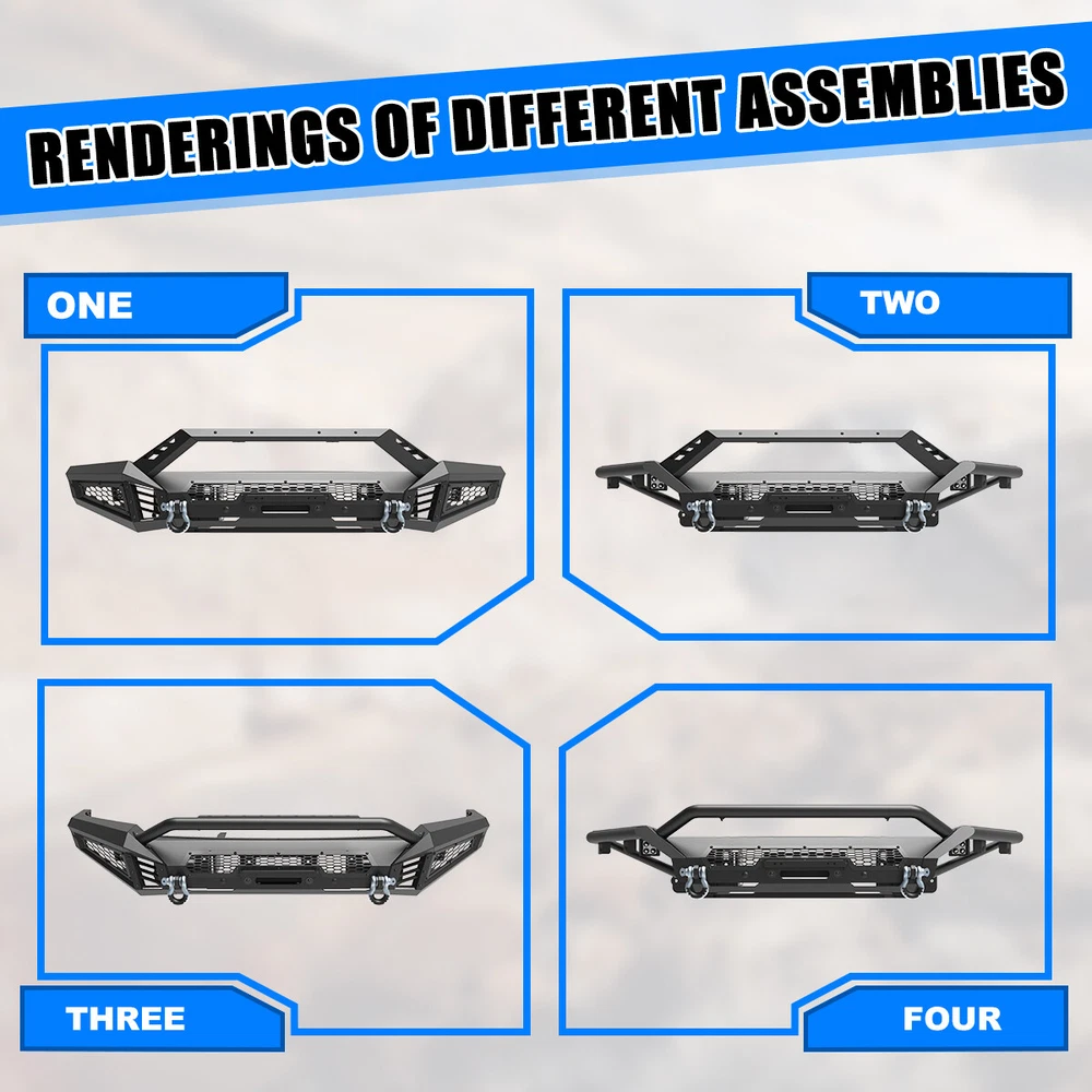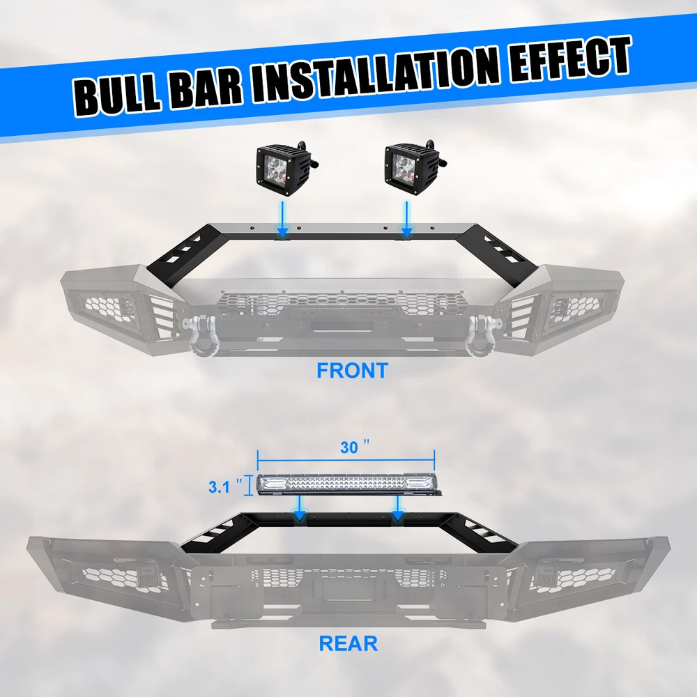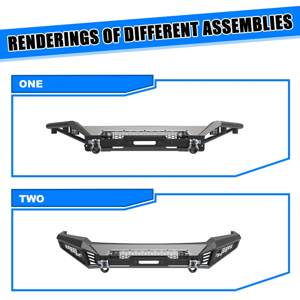 Black Steel Front Bumper w/LED Pod Lights+Shackles For 2018 2019 2020 Ford F-150 Features: 【Mounting Light Hole Position】 Specially designed for 2018-2020 Ford F-150 front bumper, protects your front grille.Modular design, can be DIY as you like. 【Premium material 】This Front Bumper is made of steel to provide excellent strength and durability, High-quality textured powder coating provides corrosion protection, multi-point welded to the sturdy bracket for strong bearing capacity. 【Easy to Bolt installation 】 Simply bolt directly to the optional modular front bumper, no drilling required.Excellent fitment and easy installation.To play a decorative and functional role. Fitments: Compatible with 2018-2020 Ford F-150 Specifications: Surface Finish: Black Anti Rust Powder Coated Steel Include: Mounting Hardware, Designed in the USA 360 days manufacturer warranty. 30-Day return policy. 【Mid-Width Front Bumper】 1. Allows DIY colour spraying 2. Works with Factory Parking Sensors,w/Park Distance Sensor Mounting Hole 3. W/Flip-up Licence Plate Mounting Bracket 4. W/Bumper Mounting Bracket 5. W/Light Bar Mounting Bracket,Can be installed light bar up to 30 inches 6.Product Size: 44.5 x 10.5 x 9.1 inch Weight: 57 lbs 【Full-Width Side Wings】 1. Wing Guard Trim Blocks 2. Park Distance Sensor Mounting Hole:1.Works with Factory Parking Sensors ;2.With dust plug when no sensor is installed 3. Shark Gill-like Decorative Panels:Allows DIY colour spraying 4. Honeycomb decorative mesh panels:Allows DIY colour spraying 5. Pod Light Mounting Bracket:Accept 2 3" or 4" Pods Light on Each Side(w/2*4" LED Pod Lights) 6.Product Size: 22.1 x 24 x 11.3 inch Weight: 39.5 lbs 【Bull Bar】 1. Shark Gill-like Decorative Panels 2. Light Bar Mounting Bracket/Pod Light Mounting Bracket:Can be installed light bar up to 30 inches or 2 pods light 3.Product Size: 48.3 x 7.6 x 7.6 inch Weight: 8.8 lbs Package Included Style:2 IN 1 1 * Mid-Width Front Bumper 2 * Full-Width Side Wings 2 * 4" LED Pod Lights 2 * D-Ring Shackles 1 * Set of Mounting Accessories Style:3 IN 1 1 * Mid-Width Front Bumper 2 * Full-Width Side Wings 1 * Bull Bar 2 * 4" LED Pod Lights 2 * D-Ring Shackles 1 * Set of Mounting Accessories Payment Delivery details Terms of sales About us Contact us Payment 👉 We accept PayPal (Recommended), credit card, VISA, Google Pay & Discover etc. 👉 Please submit your payment within 7 days after your purchase. 👉 If not, eBay will automatically open an Unpaid Item Dispute on our behalf if the item(s) are not paid within 7 days. Delivery details 👉 Please double check your delivery address and contact information. 👉 All items will be shipped within 1 business days after payment received. 👉 Tracking numbers will be easily accessible ASAP they are created and processed. Terms of sales 👉 Free 30 days Return, we will cover the return post fee. 👉 If a defective product was received, please do not hesitate to message us via eBay message. 👉 We will response in 24 hours in business to resolve the problem 👉 We stand behind our products. Items can be returned for exchange or full refund within 30 days from the date you receive. About us 👉 Wolfstorm has a huge warehouse and office located in the United States. 👉 All US domestic 48 states customers are able to benefit from the FREE SHIPPING services. 👉 Our experienced, professional customer service representatives offers prompt and courteous service. 👉 Best quality products, outstanding services and professional experience keep our customers. Contact us 👉 Please feel free to contact us if you have any problems. 👉 Emails will be replied within 24 hours in working days. 👉 After hours emails will be replied on the next business day. On Dec 12, 2024 at 23:58:27 PST, seller added the following information: