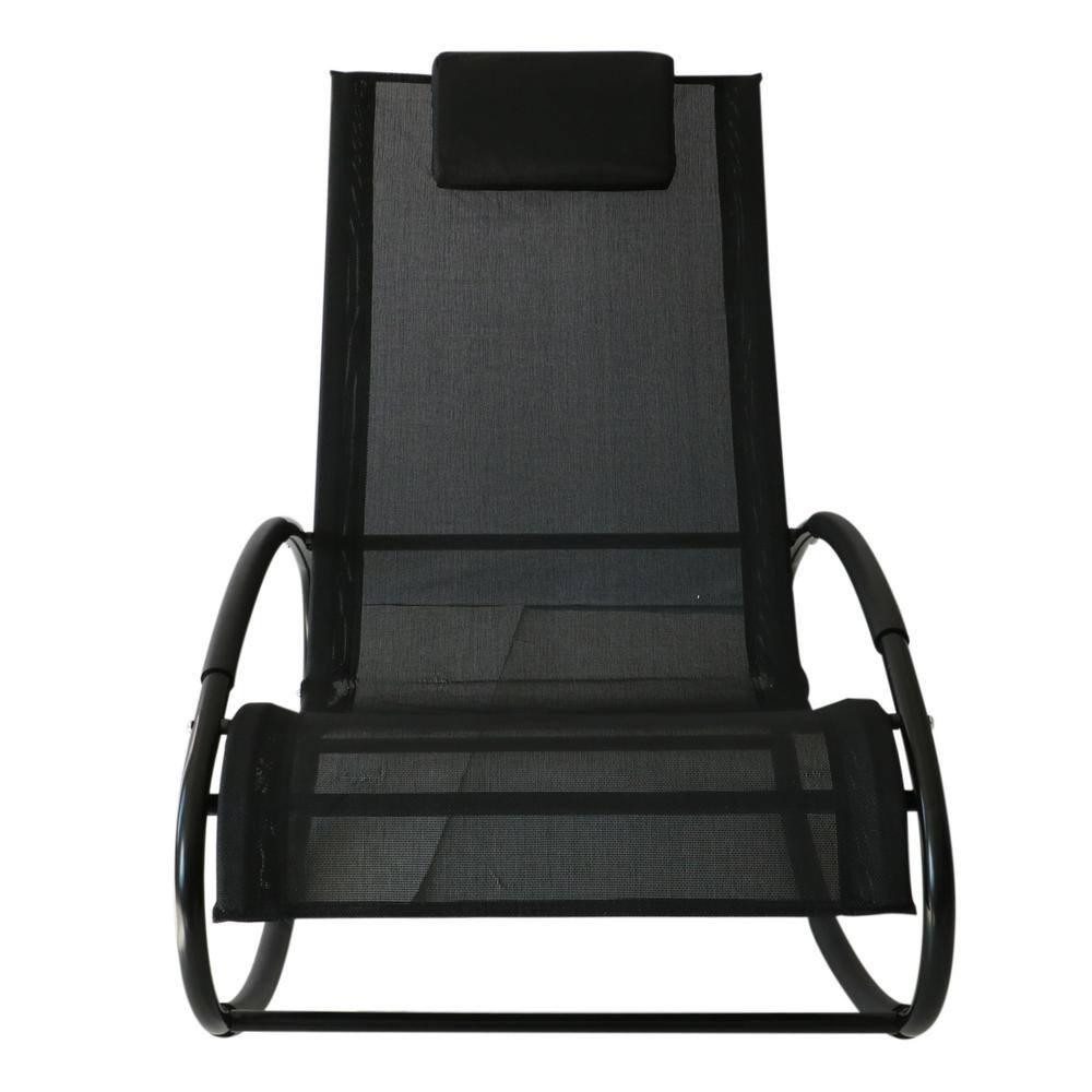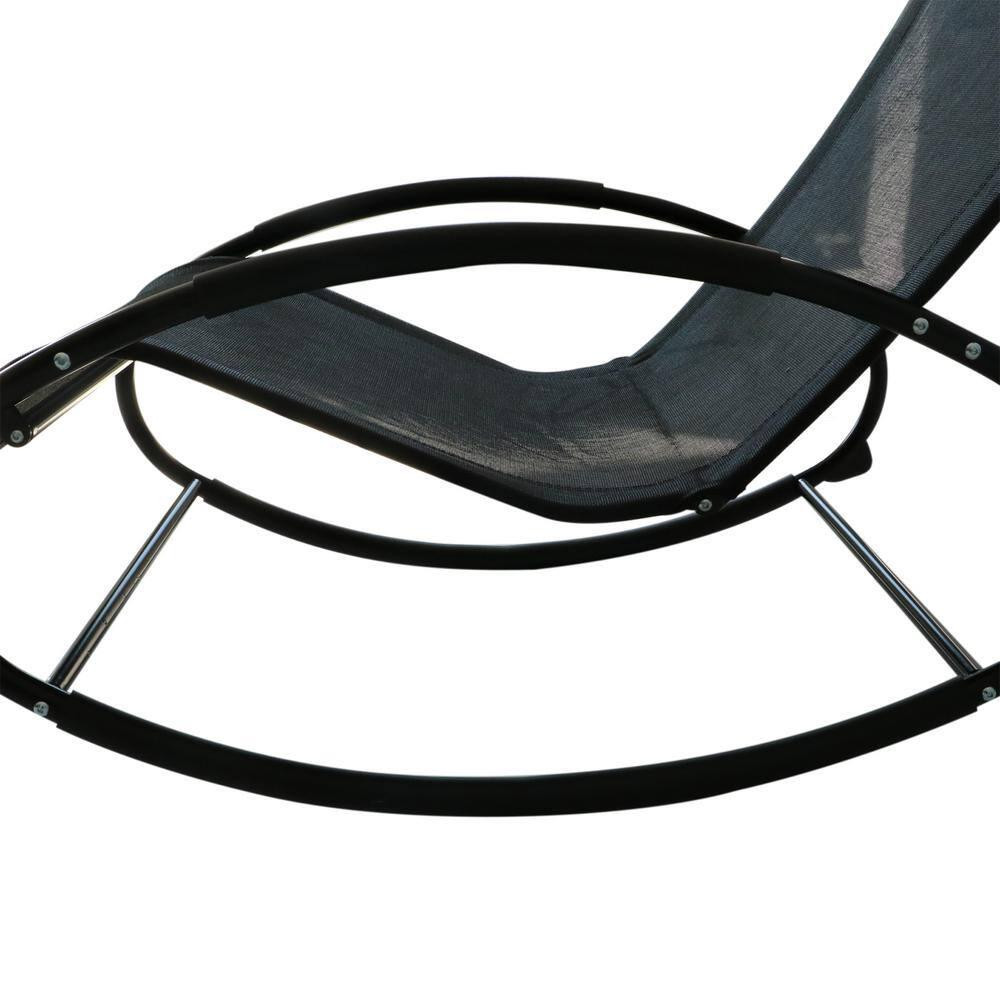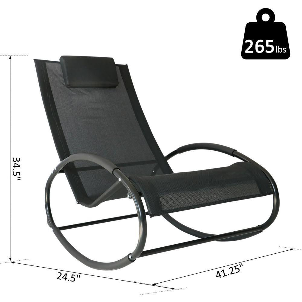 Rocking Steel Sling Patio Lounge Chair in Black Orbital Zero Gravity Seat Pool Chaise with Pillow Made from steel and Textilene fabric to ensure durable use Adjustable backrest allows for customized positioning Zero-gravity design provides optimum relaxation Stay cool by the pool when you rock outside with Outsunny. Outsunny has an outdoor rocking chair with a laid back lounger design. It's excellent for suntanning and offers a breathable mesh surface. The mesh fabric lets wind flow through, keeping it cool and letting it dry faster when you're out of the pool. A pillow pads your head, and armrests support you on each side. An outdoor rocker optimized for comfort; your next sunbathing session may become a nap. Get out, get comfy, and get Outsunny. Assembly Required: Yes Chair Weight Capacity (lb.): 265 lb Commercial/Residential: Residential Frame Finish: Black Frame Material: Steel Frame Primary Finish: Black Included: No additional items included Patio Furniture Features: Adjustable Backrest,Ergonomic,Reclining,Rocking Product Weight (lb.): 15.41 lb Returnable: 90-Day Seat Color: Black Weight Capacity (lb.): 265 lb Manufacturer Warranty: 1 Year Limited Manufactuer Assembled Depth (in.): 41.25 in Assembled Height (in.): 34.5 in Assembled Width (in.): 24 in Chair Back Height (in.): 34.5 in Chair Back Width (in.): 24.5 in Chair Seat Depth (in.): 23.5 in Chair Seat Width (in.): 21.75 in