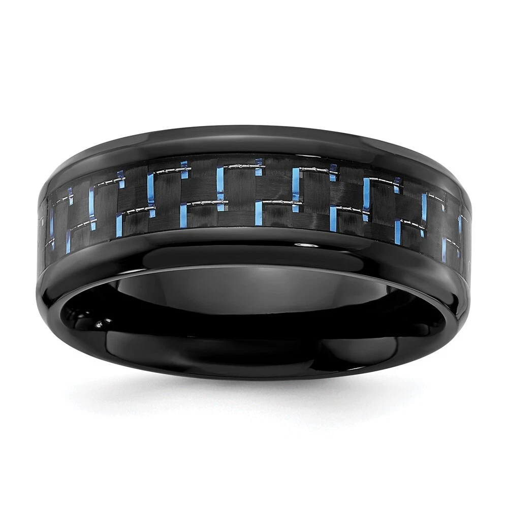 Black Titanium with Black and Blue Carbon Fiber Inlay 8mm Band Ring Size 10