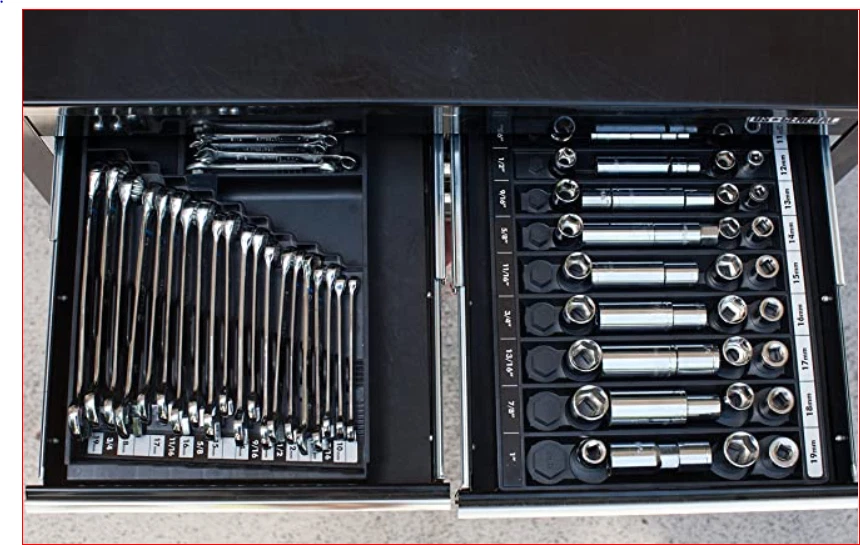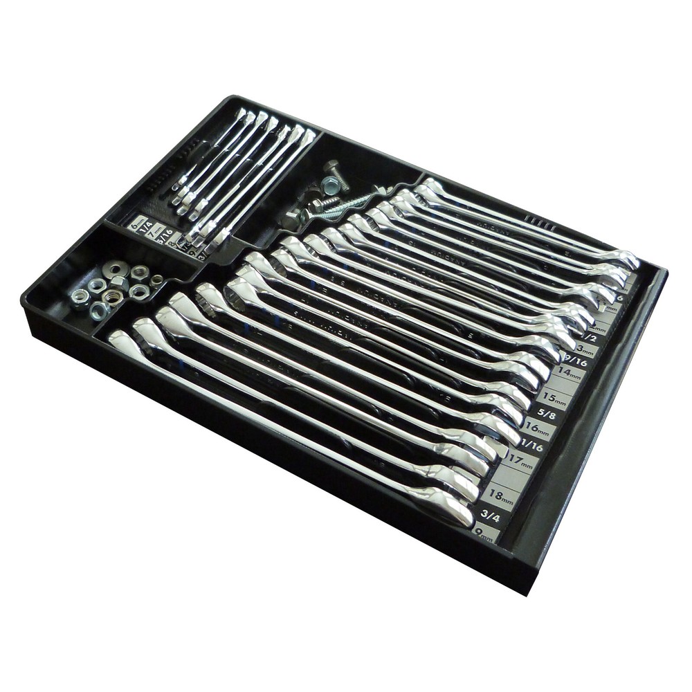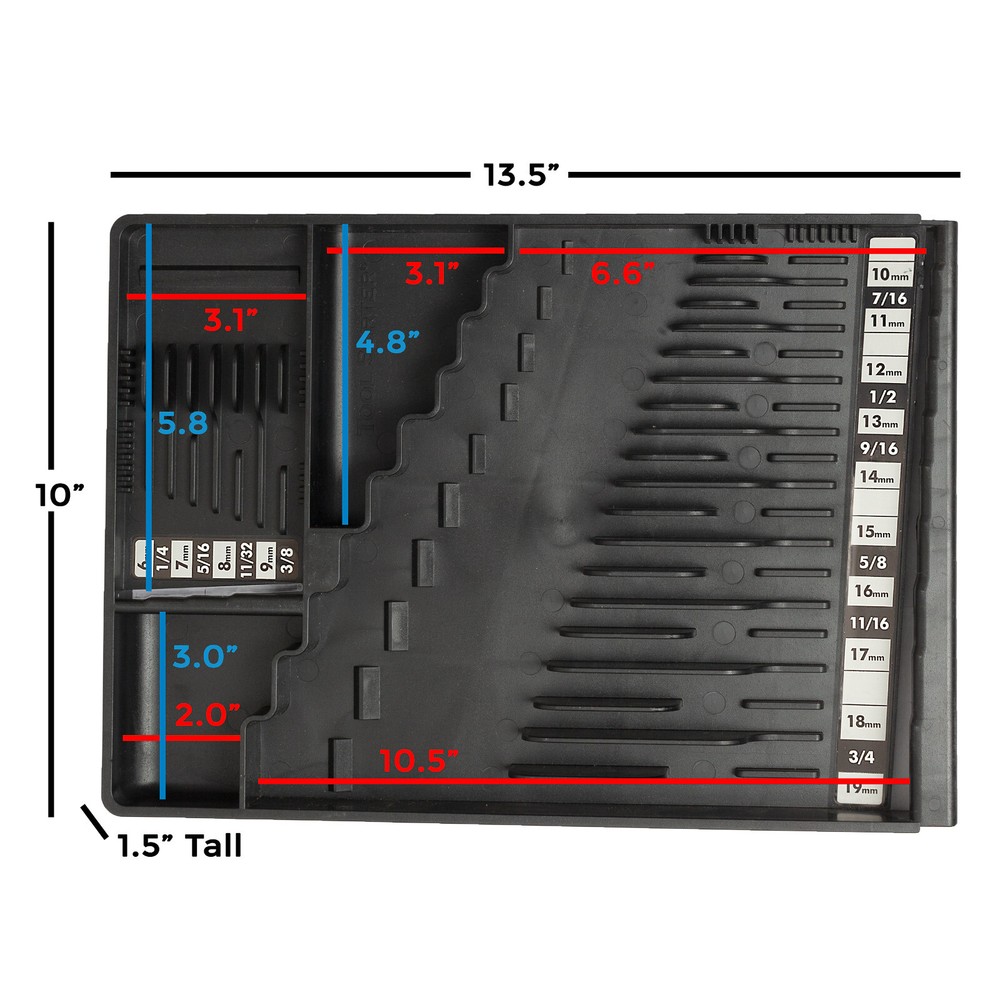 EFFICIENT WRENCH ORGANIZER – Store and sort your wrenches in an orderly fashion, get rid of the messy drawers or toolboxes, and have them easily accessible with Tool Sorter wrench organizers (Tools not included) PREMIUM WRENCH ORGANIZER – The tool tray can hold up to 28 tools with additional space for project parts. The open face design shows all stored tools and provides easy access for the wrench you need. Please note that wrenches are not held/click in place. EFFICIENT USE OF REAL ESTATE IN THE TOOL DRAWER – Wrench organizer for toolbox Measures W 10” x D 13.5” x H 1.5” and fits in 2” H shallow drawers fully loaded with typical wrenches. BUILT TOUGH WRENCH ORGANIZER – Made with premium quality materials in the USA, our wrench organizer will serve you for many years. This tool tray is extremely durable and can withstand everyday wear/tear. Note that wrenches sit in storage slots but are not held in place by magnets or clips MADE IN US