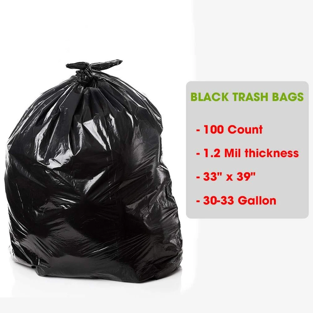 We here are strive to provide all of the household supplies you need to make your daily life easier, which is why homeowners and business owners turn to our brand for all of their cleaning supply needs. You'll be glad to learn that you can now finally go ahead and ditch those thin little trash bags which only cause you hassle and headaches. If quality, dependability and durability matter to you, get yourself some of 's heavy duty 30 gallon garbage bags! Why choose trash bags? Each Box Contains (100) Indoor/Outdoor Trash Bags Our Black Garbage Bags Are Thick & Super Tough Every Trash Bag Offers A Generous 30 Gallon Capacity Garbage Bags are Made in America! You won't believe how strong, how big or how convenient these black trash bags are until you give them a try. Since they are nearly tear-proof and extra large, you can use the thick black trash bags when landscaping, gardening, organizing the garage, cleaning out your closet, storing linens, etc. Stop wasting money on low quality garbage bags. Scroll up and click 'ADD TO CART' right now to order your own Indoor/Outdoor Trash Bag STRONG GARBAGE BAGS: With a 1.2mil thickness, 's indoor/outdoor waste bags are super tough. SUPER VALUE 100 CT BOX: Each box contains (100) plastic garbage bags, so you'll have plenty for months to come LARGE KITCHEN TRASH BAGS: With a 30 gallon capacity, these trash bags are perfect for the home, the office, the garage or the backyard. MULTIPUROSE WASTE BAGS: Measuring 33” wide x 39” tall, the black trash bags can be used to pick up a variety of things, including leaves, twigs, weeds and debris. PROUDLY MADE IN THE USA: trash bags are made in America!