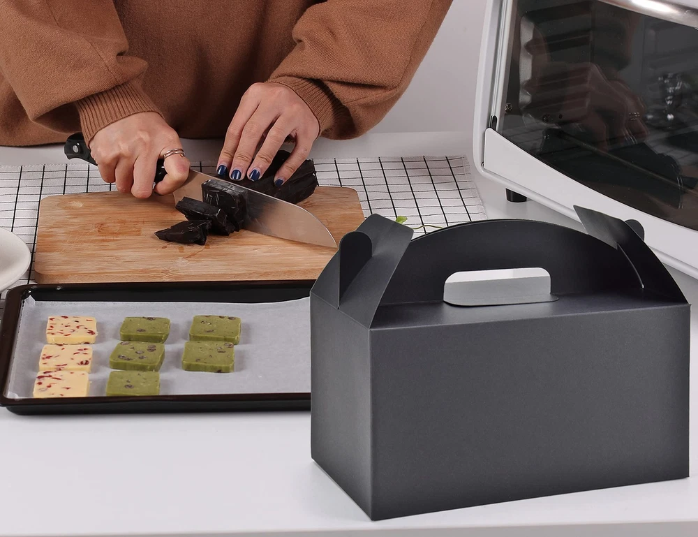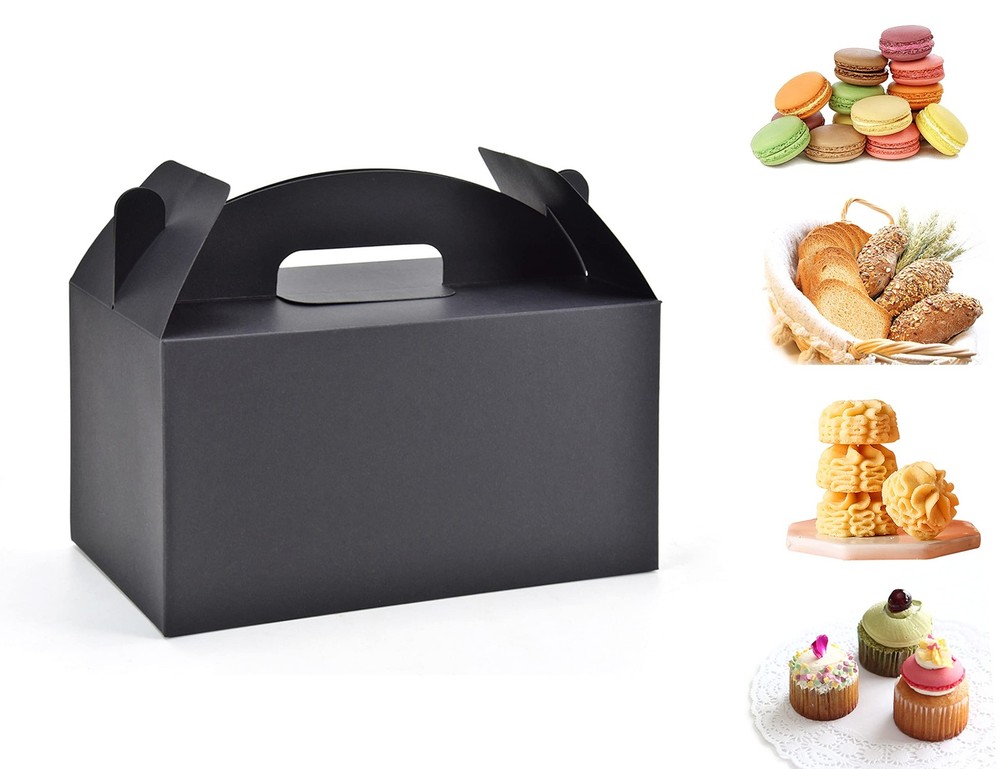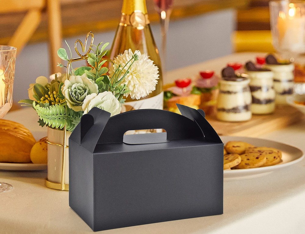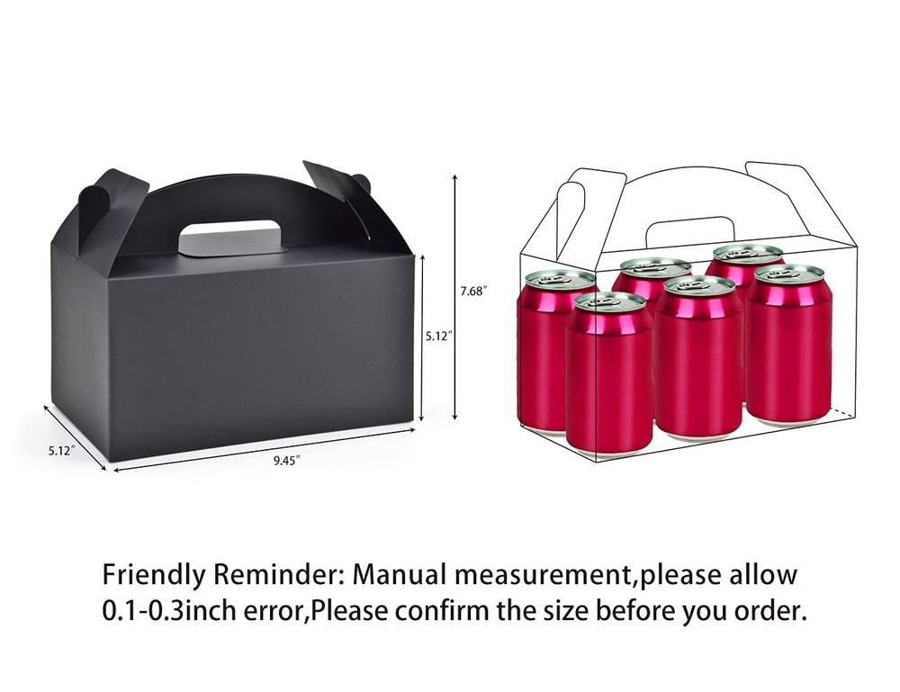 Strong Bottom Tape Free Empty Treat Boxes:An extra bottom reinforced paperboard is included,with 2 times increased holding capacity than others.Kraft gift boxes fold flat for easy packaging.No need to use additional tape for the bottom,which helps make it clean and environment-friendly Large Black Gable Boxes:Assemble in seconds,paper gift boxes come in 30pcs,each big treat box measures 9.45" long x 5" wide x 5" deep Suitable Occasions:The recyclable gift boxes are the perfect size for keeping candy,popcorn,toys,party gifts,for baby showers,birthday parties, wedding party favors Good Value:These gift boxes are made of high-quality recyclable cardboard materials Money Back Guarantee:If you are not satisfied with our treat boxes with handles for presents in 30 days. A replacement or 100% refund will be immediately provided to you