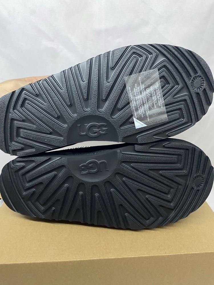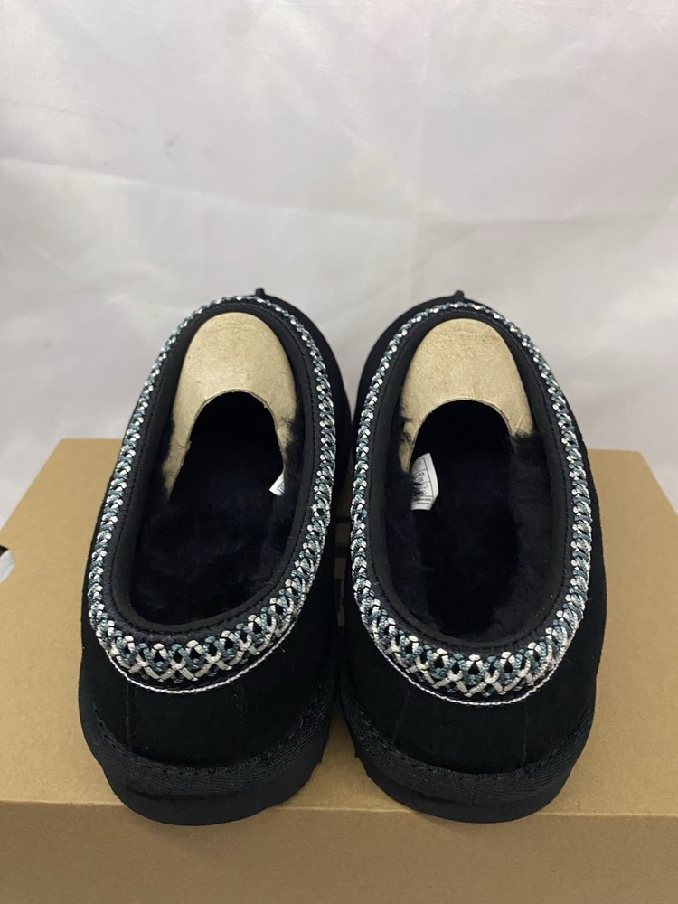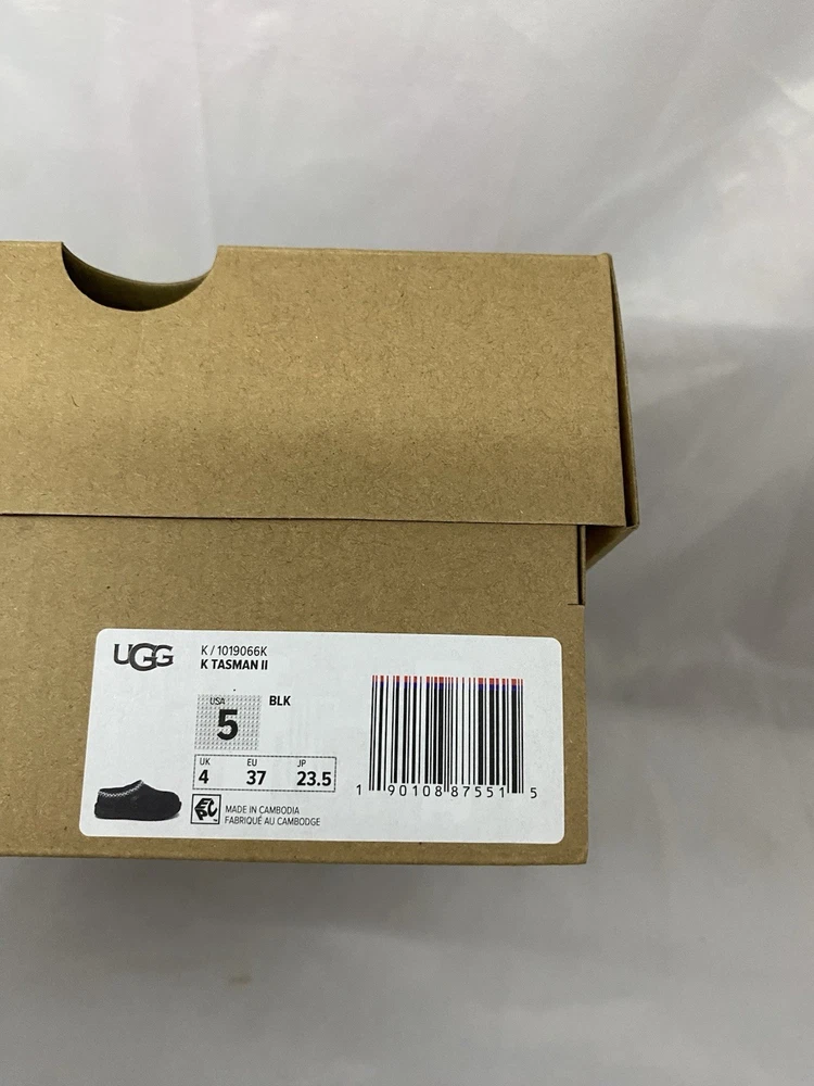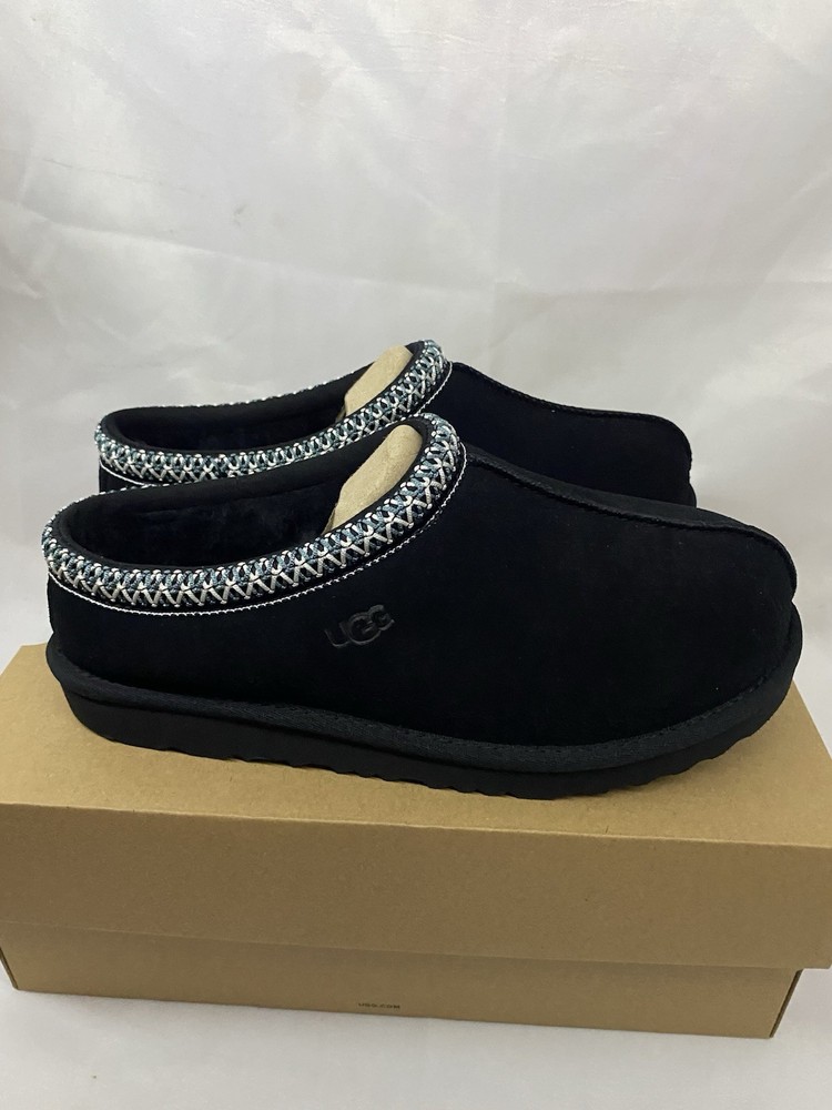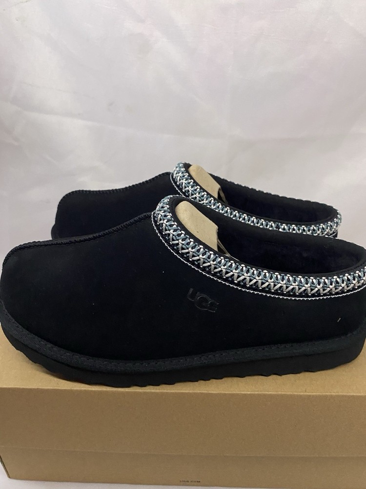 The Black UGG Tasman Slippers in size 5 youth or 6 women feature a slip-on style with a round toe shape and flat heel height, making them perfect for casual or travel occasions. These lined and lightweight slippers are made with shearling fabric lining and wool insole for comfort, while the rubber outsole provides durability. With a classic UGG logo accent and solid black color, these slippers are a stylish and cozy addition to any wardrobe, suitable for all seasons, these UGG Tasman slippers are a combination of quality and design, ideal for women looking for comfort and style.