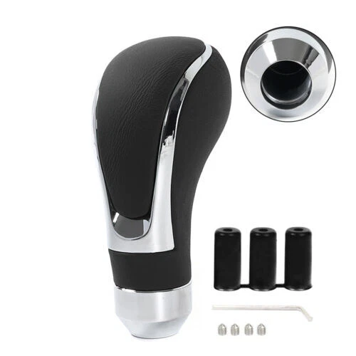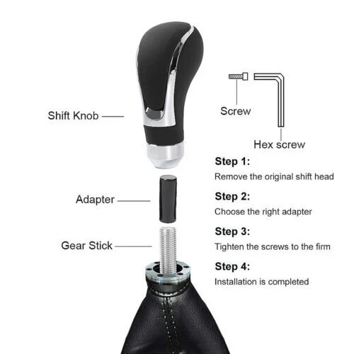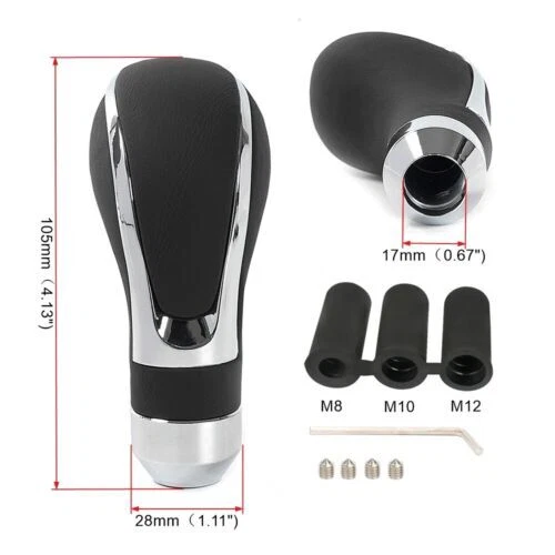 FITMENT: Fit for most of the manual transmission, part of the automatic transmission Come with 3 plastic hoses (8mm,10mm,12mm) Direct replacement for original knob, no modification is required Material: Leather+Metal Size: 105cm x 28cm Color: Black INSTALL: Remove the original one The top of this row of gears to remove the bottom of the metal Take plastic sleeve for the shift bar size The rubber sleeve into the gear bar inside The shift head directly into the gear lever PACKAGE INCLUDED: 1 x Manual Shift Knob 3 x Adapters(8mm,10mm,12mm) 4 x Screws 1 x Spanner Please allow 0.5-1 inch difference due to manual measurement.(1inch=2.54cm) There are no instructions included in this kit.Professional Installation Is Highly Recommended! Please compare the gear shift head with your original one before purchasing!