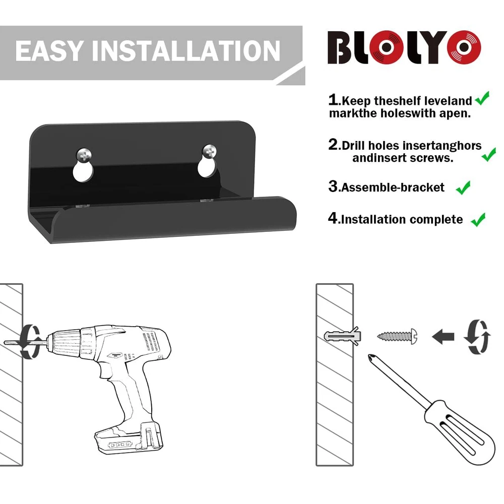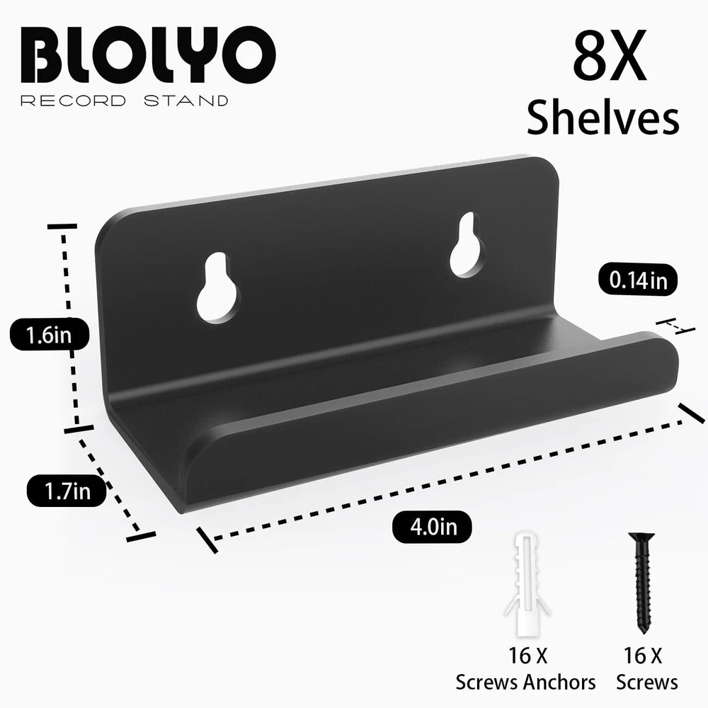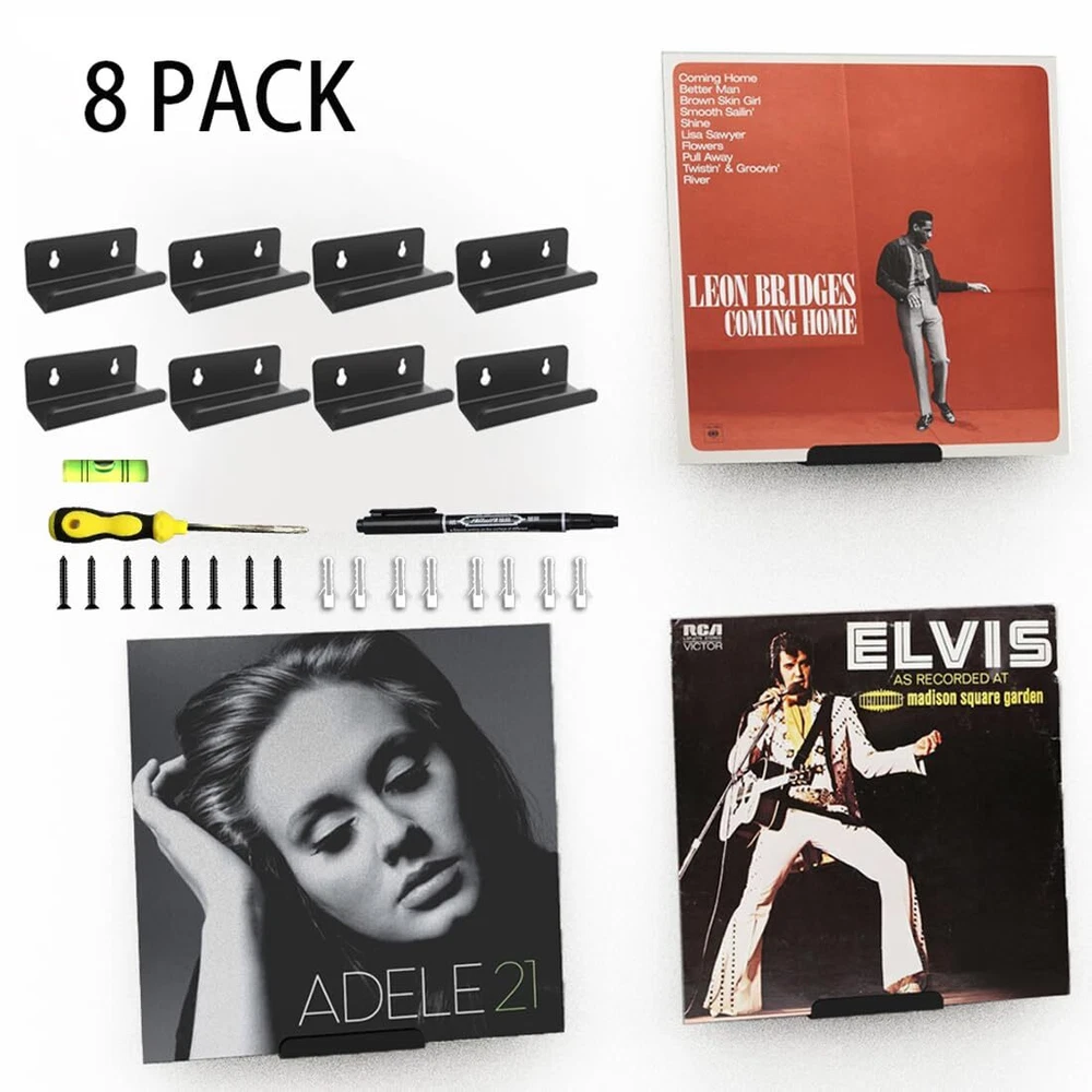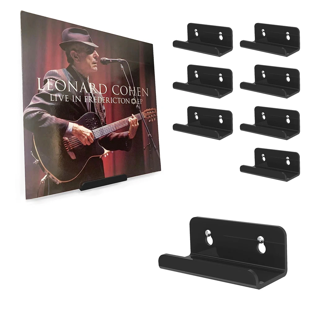 Clear Vinyl Record Shelf Wall Mount 8 Pack,Acrylic Album Record Holder Display,Vinyl Record Shelf Stand and Wall Mount Display,Acrylic Record Frame Show Your Favorite LP(Bkack) Black Vinyl Record Shelf Wall Mount 8 Pack,Acrylic Album Record Holder Display,Vinyl Record Shelf Stand and Wall Mount Display,Acrylic Record Frame Show Your Favorite LP(Bkack) 【PACKAGE INCLUDES】8 pack 4"X1.7"X1.6" clear record display shelves with 16 mounting screws.It is clear to showcase the artwork for the record. 【EASY TO INSTALL】 Fix to all wall types with easy-to-fix wall screws.The Vinyl record holder is made of sturdy, lightweight acrylic, smooth and clear, and durable. 【QUALITY MATERIAL】 These clear vinyl record holders are made of acrylic, transparent material looks neat and tidy, durable and stable to hold the exhibition. 【CLASSIC DESIGN】 This album frame will make displaying your favorite music LP’s look amazing in any room. The smooth clear design will fit in perfectly with any room decor. 【FASHION DESIGN】The small shelf allows the record to be displayed better