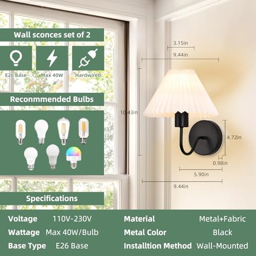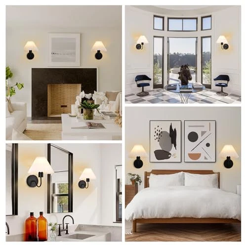 Return Policy Fast Delivery Trusted seller Black Wall Sconces Sets of 2, White Pleated Fabric lampshade, Indoor Gooseneck Wall Lamp Lighting, Bathroom Dresser Hardwired sconces wall decor Fixture for Living Room Bedroom Dining Room Hallway Product Description 【Modern and minimalist design】Wall sconces set of two uses fabric shade and black Gooseneck metal body. The white eye shield emits soft light, and the elegant long upright arm adds a modern and retro style.. The innovative, unique design is suitable for many styles of home decor. Create a warm and inviting atmosp for your room. Add a touch of softness and warmth to your home. 【Indoor Wall Sconce Size】Wall Lamp Overall: 10.43 inches high x 9.44 inches wide, Shade: 3.15 inches deep (top) x 9.44 inches deep (bottom) x 6 inches high, Backplate: 4.7 inches diameter x 0.98 inches high, please refer to the picture for more details. 【Standard E26 Socket Hardwired Wall Sconce】This hardwired wall sconce features an E26 bulb base and can be used with standard E26 bulbs such as LED and incandescent bulbs. If you prefer a retro vibe, you can use incandescent bulbs. However, we recommend that you use LED bulbs to save energy (incandescent bulbs up to 100W, LED bulbs up to 40W). You can choose different wattage bulbs according to your preferred brightness. Bulbs are not included, please purchase separately. 【Wide range of applications】Matte black finish with white pleated fabric shade, perfect as a bathroom vanity light, bedroom wall sconce. Suitable for sofas, mirrors and fireplaces, bedroom cabinets, staircases, etc. The classic fabric shade wall sconce complements the building by directing light upward, downward and outward, spreading it throughout the space and adding brilliance to your home. 【Quality Assurance】The Flared Fabric Shade Wall Sconce Kit comes with the associated hardware for installation. Installation is completed in minutes. We offer 2 years limited warranty, if you have any questions about the fabric shade wall sconce, please contact us if you receive a damaged item, or have any quality problems, or you are not satisfied with our products, please contact us for a good solution Shipping Returns Payment Shipping Shipping is FREE to all addresses other than APO/PO boxes in the lower 48 states. All our stock ships from US-based warehouses. Shipped via USPS or UPS (depending on location and package weight) Unless stated otherwise, all orders will ship within 24-72 hours of your payment being processed. Check our feedback to see the great reviews of FAST shipping we offer. Returns Seller does not accept returns Payment We currently accept payment via eBay managed payments only. Once payment is cleared, we will dispatch your shipment within 1-3 business days. Please refer to the "Shipping" tab for more information regarding shipping speed to your destination.