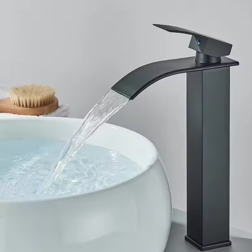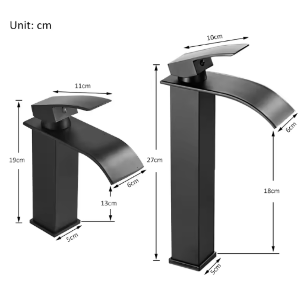Black Waterfall Bathroom Sink Faucet Single Handle Tall Vessel Mixer Taps Drain Description: Upgrade your bathroom with this modern deck-mounted basin faucet. It features a single handle for easy control of hot and cold water and a long spout for smooth and stable water flow. The solid construction ensures durability, corrosion resistance, and reliable performance. Suitable for most standard bathroom sinks. Specifications: Type: Bathroom Basin Faucet Installation Type: Deck Mounted Handle Type: Single Lever Spout Type: Long Curved Waterfall Spout Hot & Cold Water Control: Yes Material: High-Quality Brass with Anti-Rust Coating Finish: Matte Black Mounting Hole Diameter: Standard Size Height (Tall Model): 27 cm Spout Height: 18 cm Spout Length: 13 cm Base Width: 5 cm Handle Length: 10–11 cm Included Accessories: Faucet + Drain Assembly Key Features: Durable brass construction with rust-resistant coating Long spout for smooth and splash-free water flow Single lever handle for precise temperature and flow control Matte black finish for a clean, modern appearance Easy to install and fits standard sink holes Comes with a matching pop-up drain assembly Package Includes: 1 × Basin Faucet 1 × Matching Drain Assembly 1 × Installation Kit Benefits: Smooth water control for everyday use Strong and durable materials for long-term reliability Simple design suitable for home, hotel, or office bathrooms
