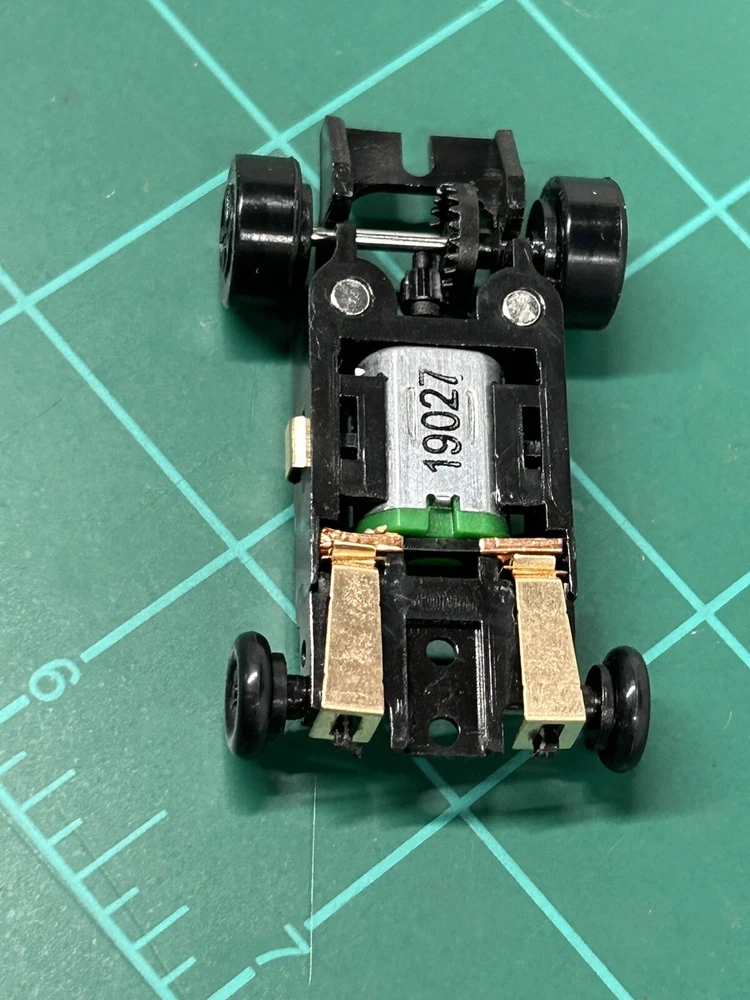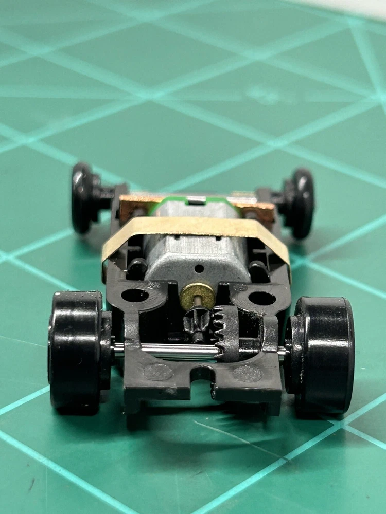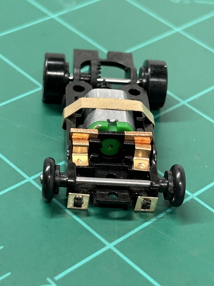 What is the T-Dash Turbo Screw? To those unfamiliar with Turbo Screw, it's an 'inline' that will take screw on bodies. It's a mashup of a Turbo , a Mega G+, Mondo and T-Jet. 'Tomy Turbo style' front and and electricals. This chassis can take off the shelf parts. Nothing is proprietary. We have made our own versions, but existing shoes, hangers and springs from the Tomy Turbo/SRT, Viper, etc will all work. Mondo traction magnet tubes tallow for wide adjustability of the traction mags. T-Jet body mounts. TS uses a removable bulkhead that forms the electrical bridge between the motor and the shoe hangers. Nothing is soldered in place. The motor is easily removed/replaced. Depending upon what motor you pop in there, performance can be on par with some of the mainstream inlines available now. Set of 4 chassis run good only tested for function on power supply Works On AFX and tyco Track. see other listings for more colors I do combine shipping for $1 each additional item