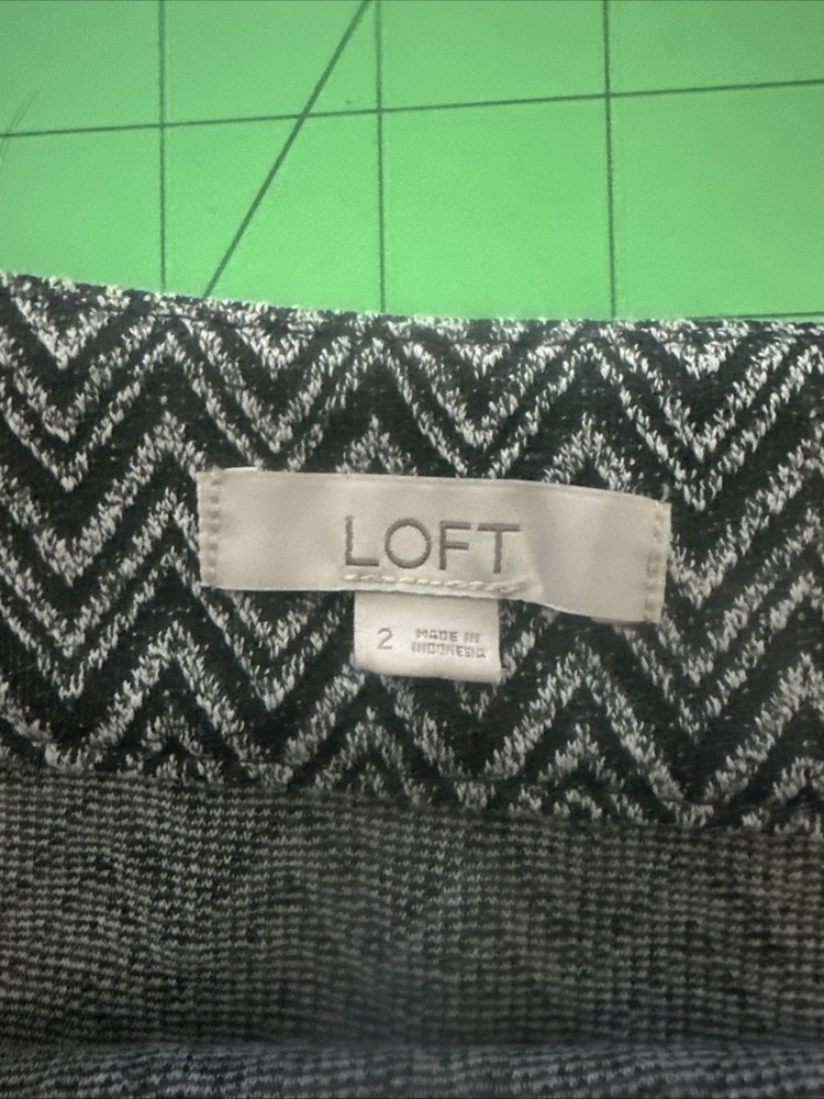 The Loft Skirt is a stylish A-line skirt designed for women in size 2. This black and white chevron skirt falls at a short length, adding a trendy touch to any outfit. Made by LOFT, this skirt is perfect for adding a pop of color and texture to your wardrobe while maintaining a classic and versatile look.