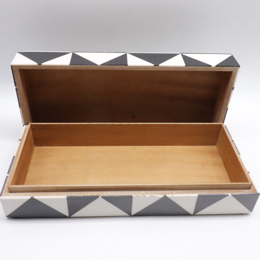 This Handicrafts Home jewelry trinket box is a handmade decorative piece featuring a triangle shape with a black and white color scheme. It is made of wood, resin inlay, and pine MDF, with a hand buffed polish finish for added elegance. The box is ideal for storing jewelry or small mementos, making it suitable for all occasions and any room in the home. Its unique design and craftsmanship make it a stylish addition to a teen's or adult's living space.