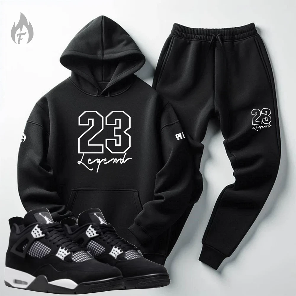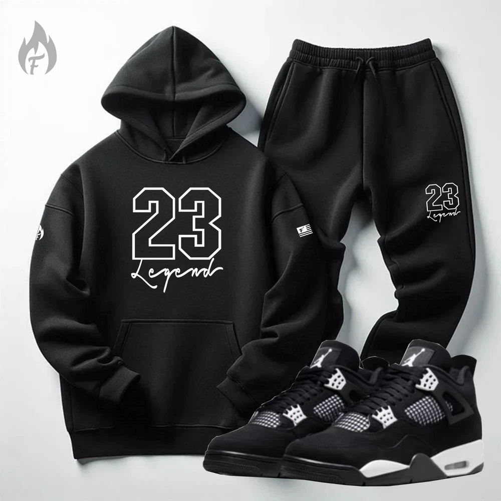 This Listing Is For: Threads On Fire "23 Legend" Sweatsuit To Match Air Jordan 4 "White Thunder" Black/ White 1) 23 Legend - Black Hoodie 1) 23 Legend - Black Joggers (shoes/ accessories not included) Sizing Below HOODIE FABRIC Premium quality cotton 80% polyester 20% for a higher end material blend hoodie that last longer and doesn't lose quality. Significantly better quality material than 50/50 blend hoodies. Best material for the price, guaranteed or your money back! Made by threadzonfire streetwear. JOGGER FEATURES Unisex, ribbed gusset at crotch, ribbed bottom cuff and waistband, tapered fit, flat draw cords, 5-thread stitching, angled side pockets, 1 back pocket. Ships out within 48 hrs. via USPS w/ tracking and delivery confirmation. Payment must be made via PayPal and ships to confirmed address only. Feel free to contact me if you have any questions or concerns. Issues can usually be resolved between buyers and sellers. I provide honest and responsible feedback and ask the same in return. We also accept returns and exchanges hassle-free. Thank you for looking and don't forget to check out my other items as I will be adding more like this.